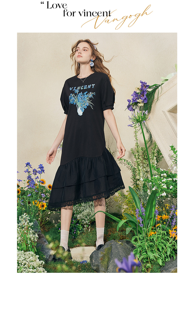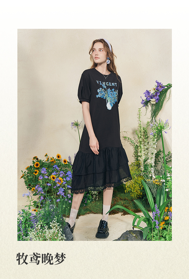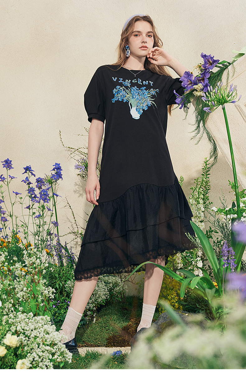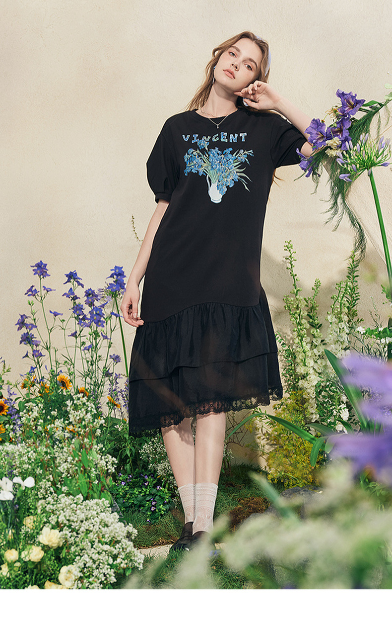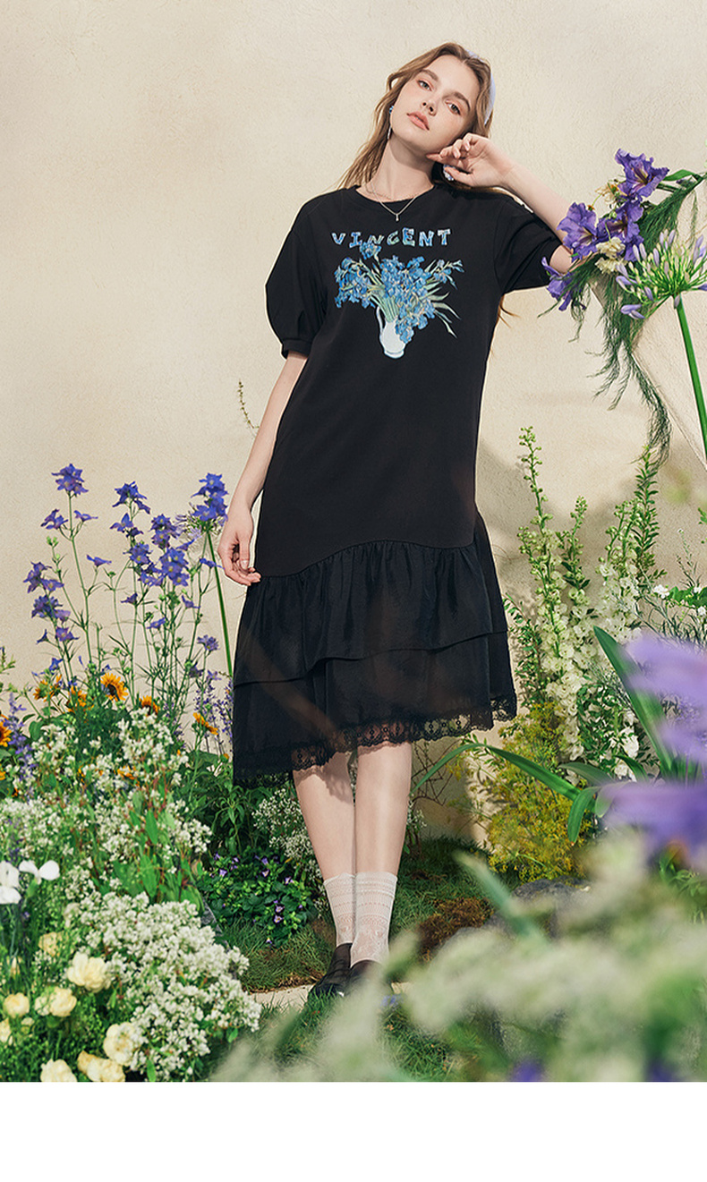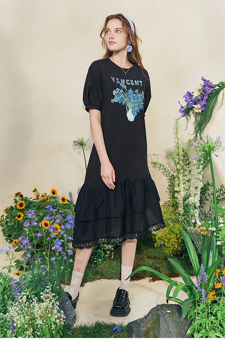 两三事梵高文艺牧鸢晚梦2025夏新款印花泡泡袖蕾丝裙摆拼接连衣裙