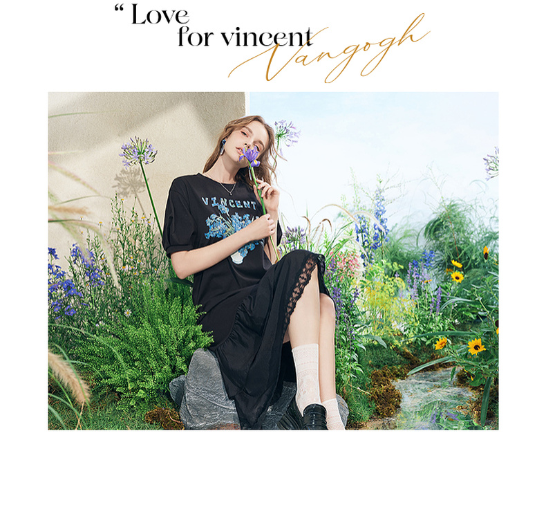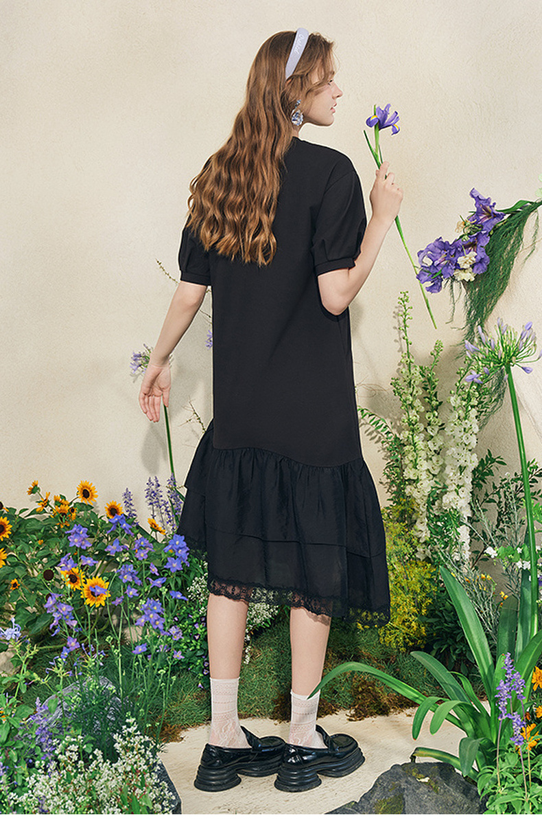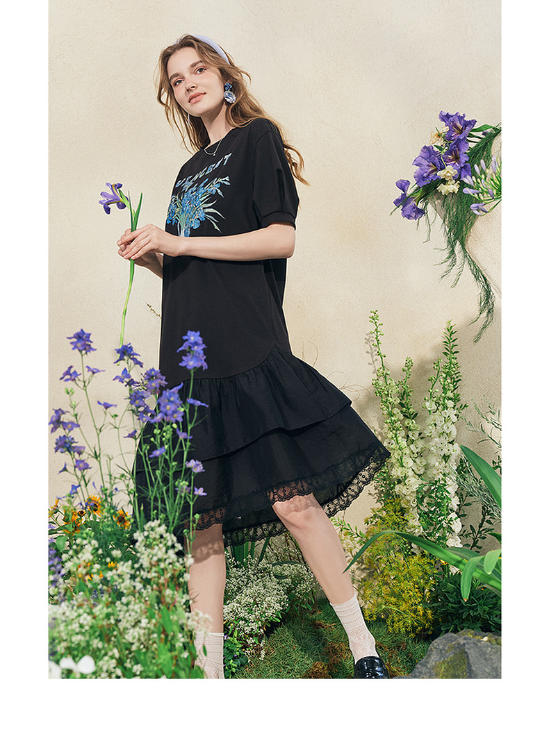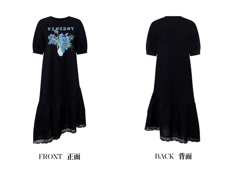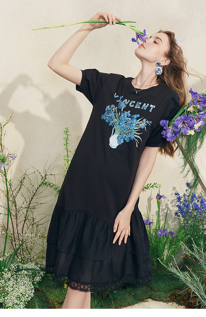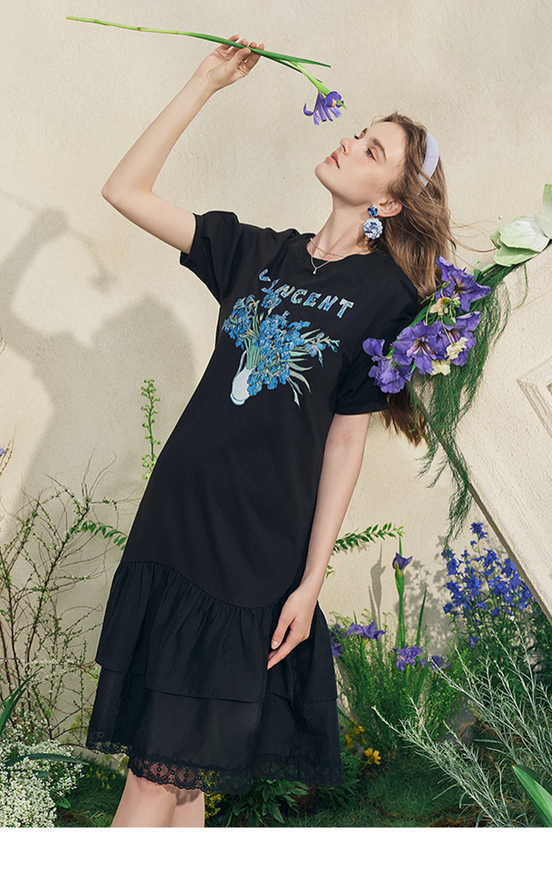 两三事梵高文艺牧鸢晚梦2025夏新款印花泡泡袖蕾丝裙摆拼接连衣裙