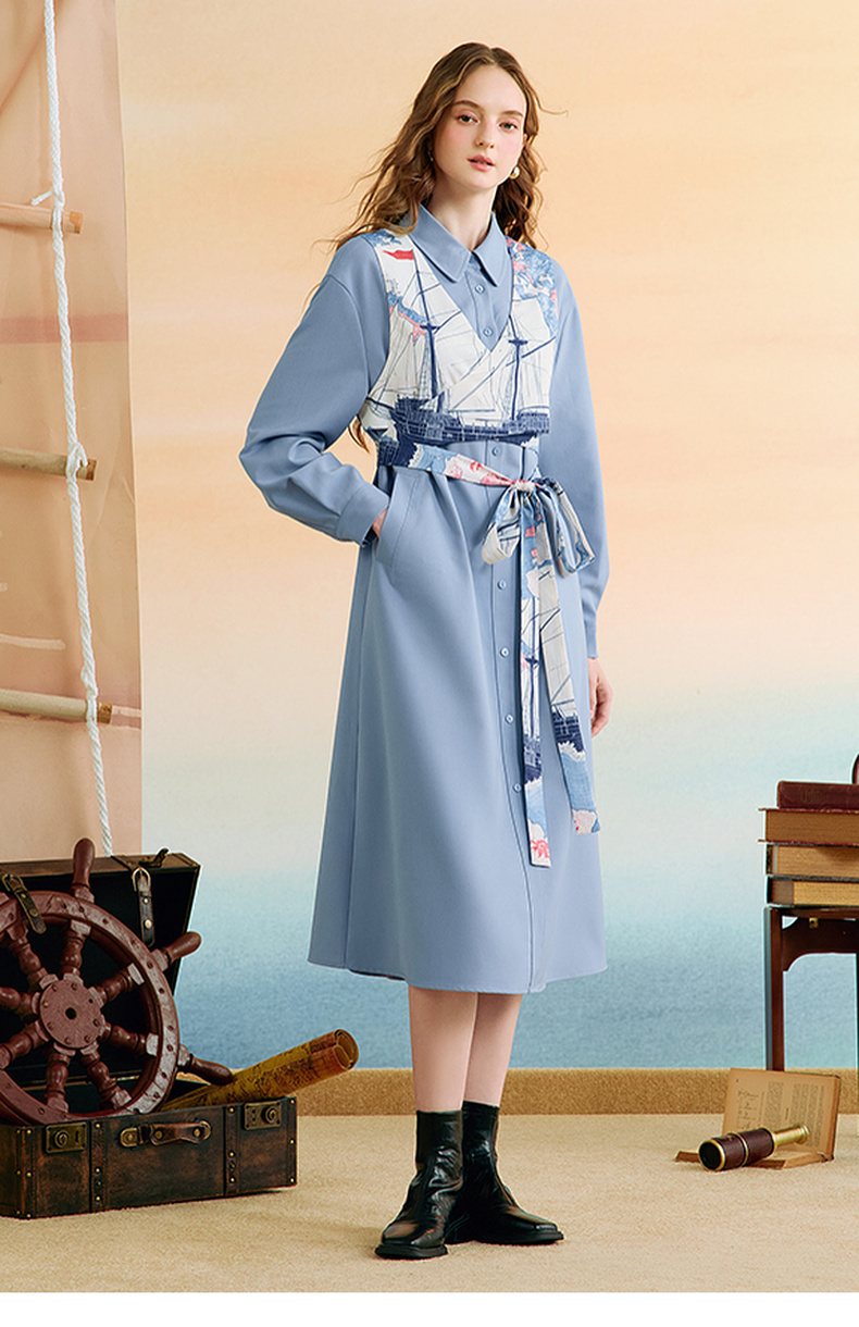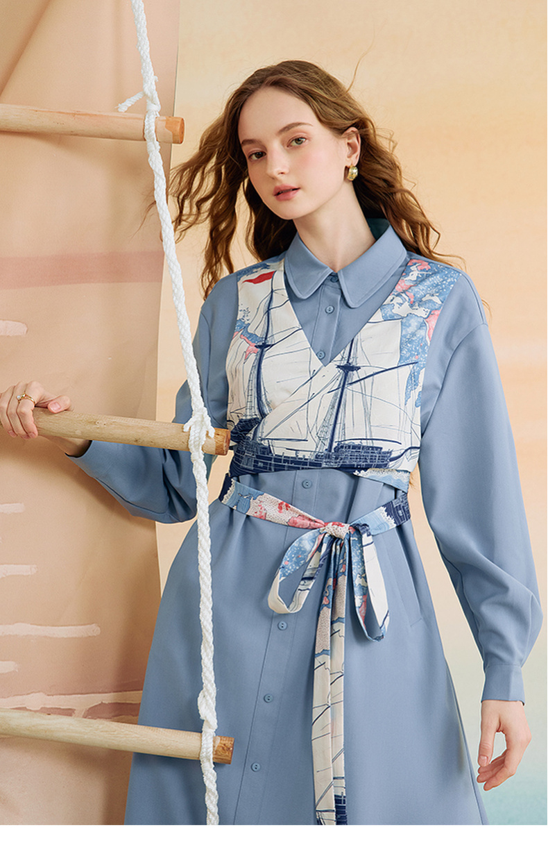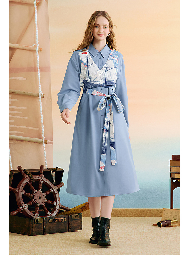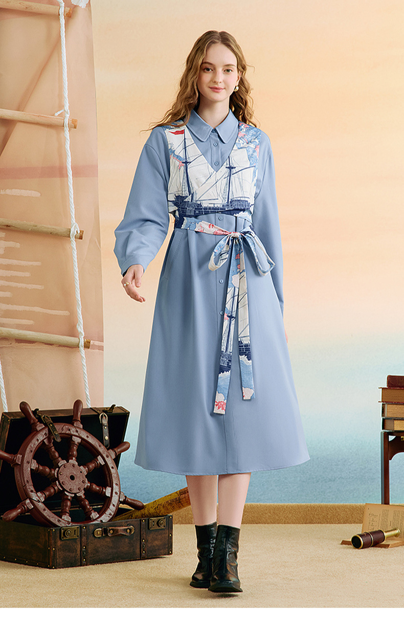 两三事 帆影织梦 2025秋季新款时尚印花布拼接绑带假两件连衣裙