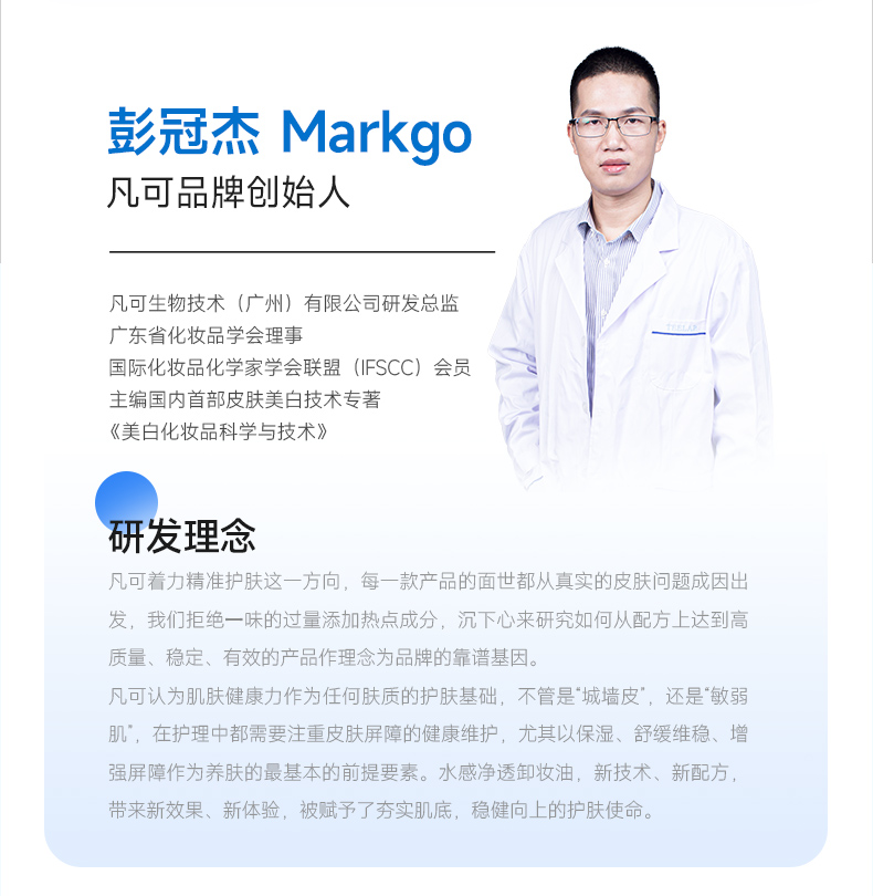- 凡可是由从事化妆品研发15年的专业配方师-Markgo创立的新锐护肤品牌,以敏肌为核心提供敏肌进阶多方位功效护肤方案。