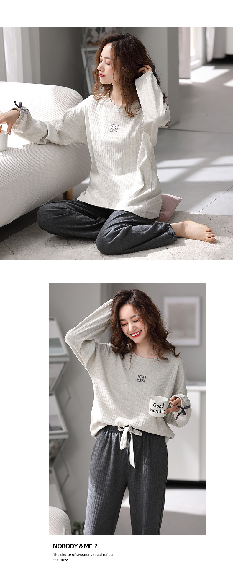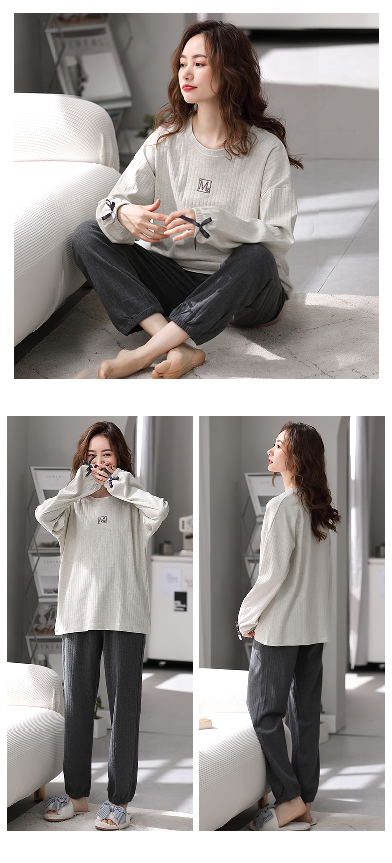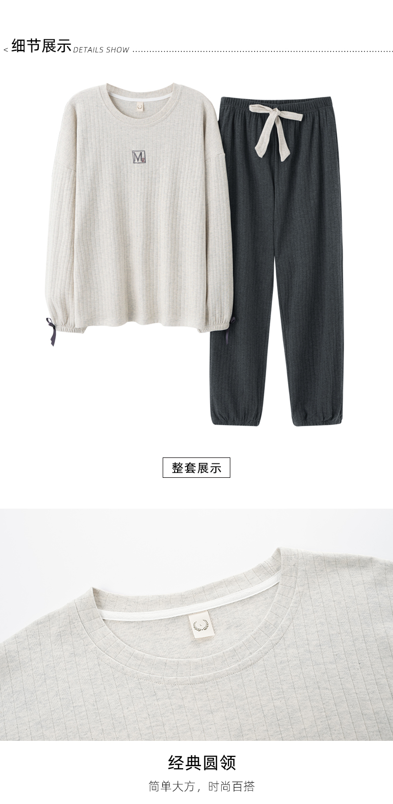 芬腾睡衣女纯棉长袖柔软春秋款套装宽松大码圆领全棉套头家居服