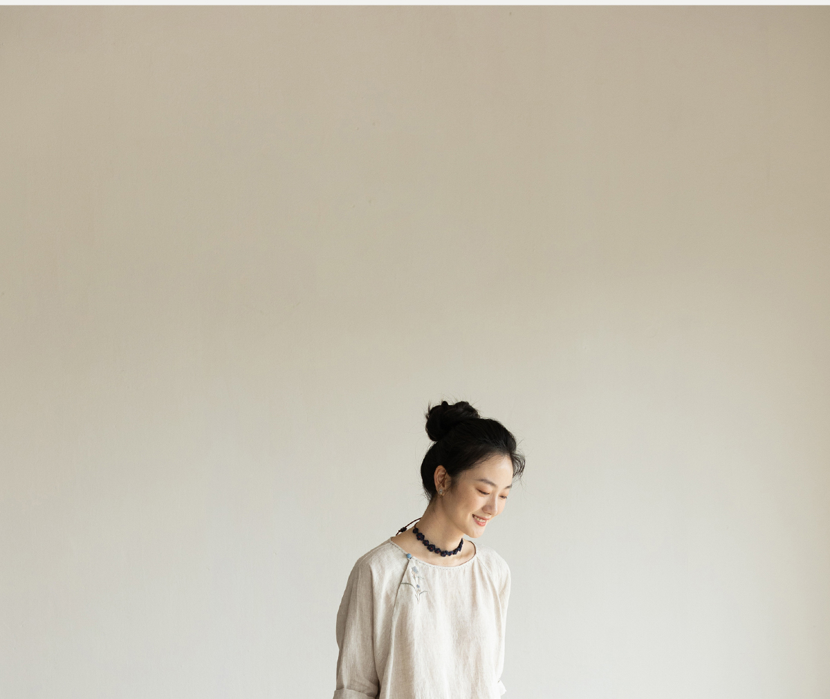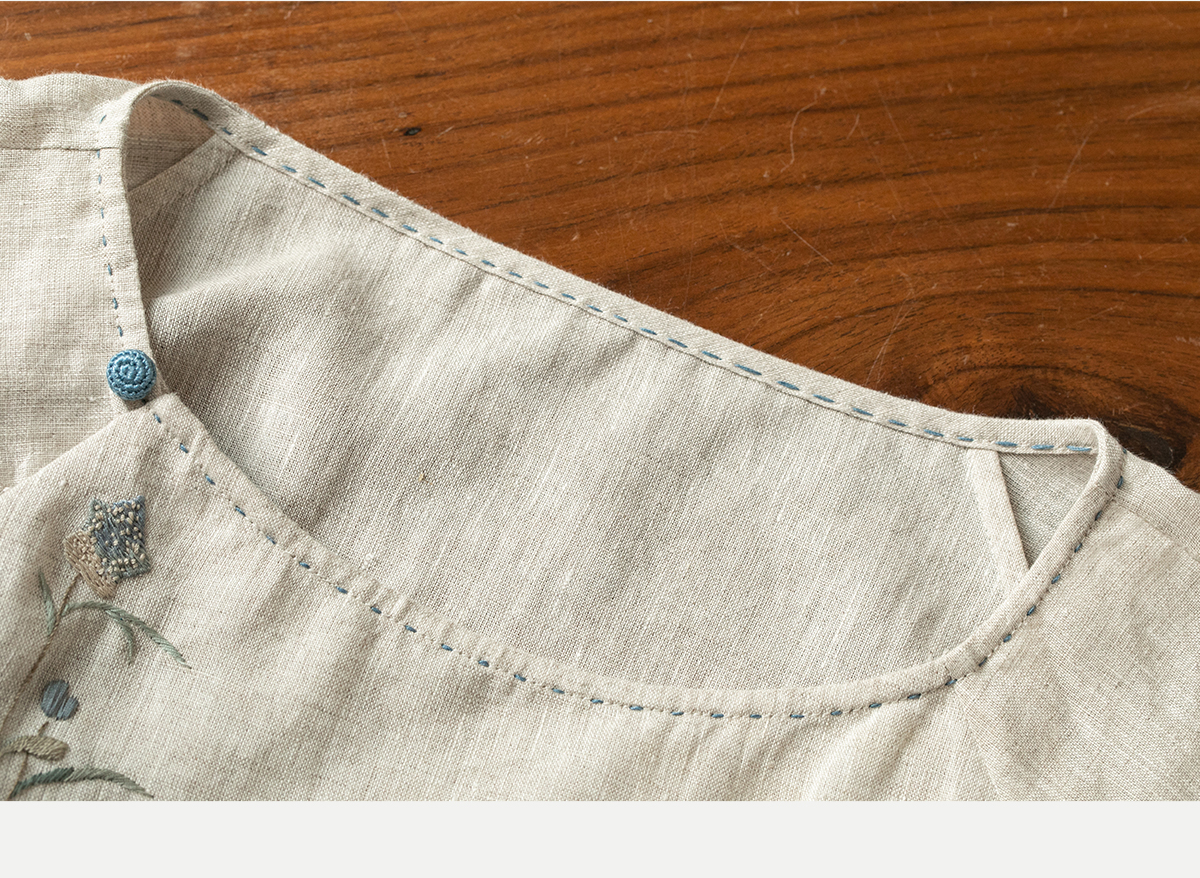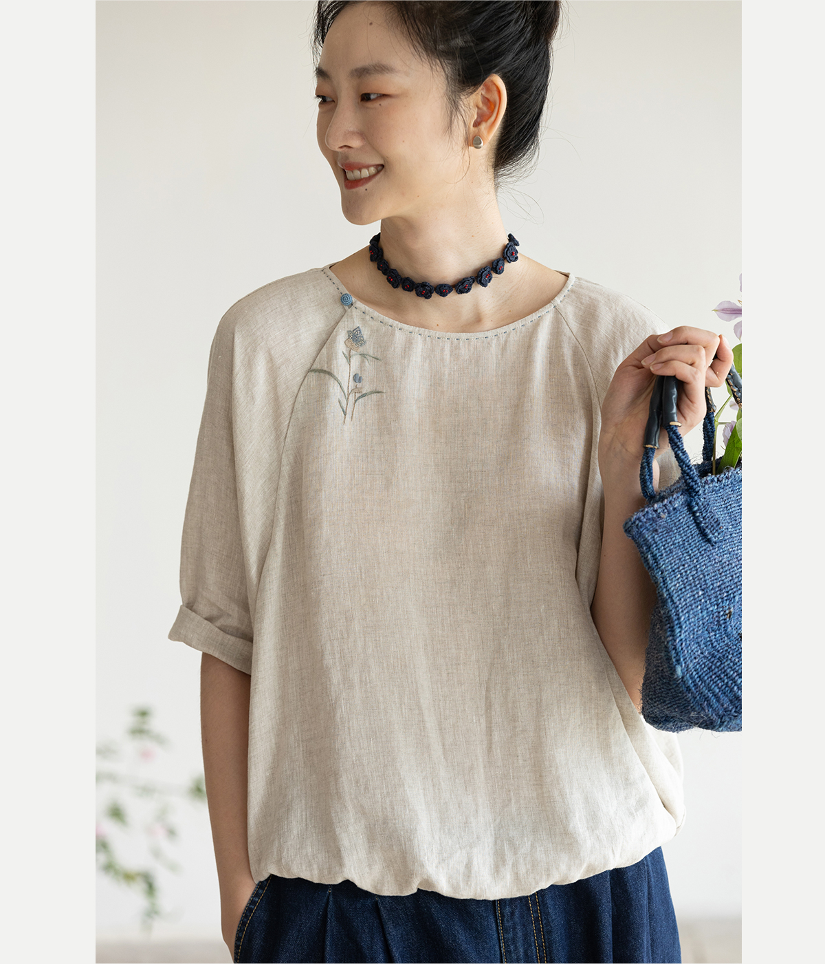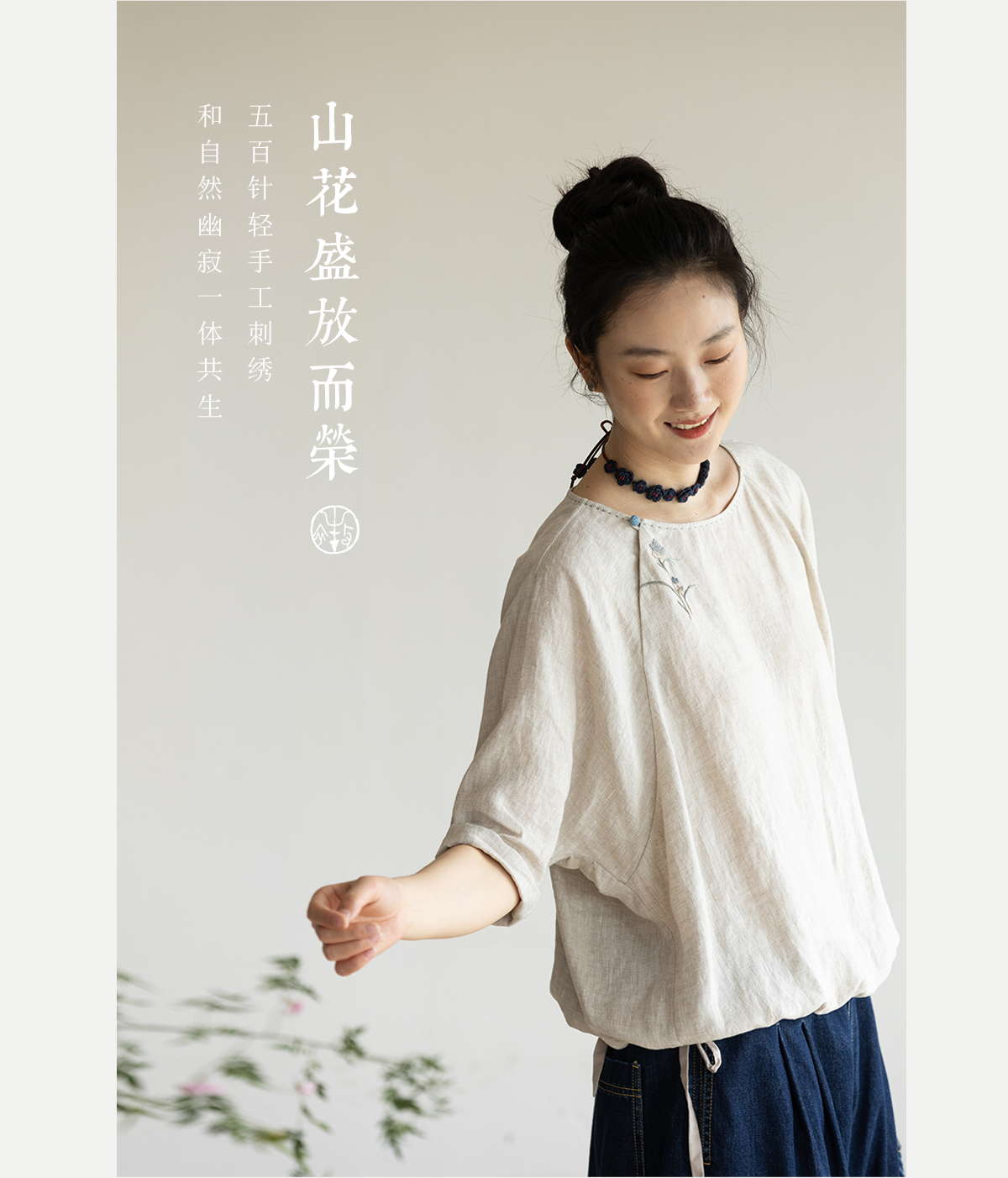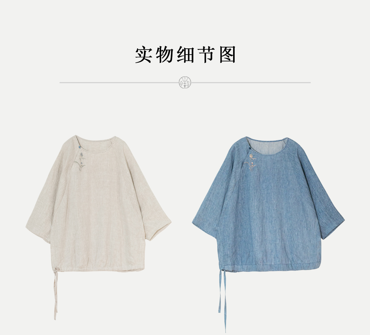 牧衣游原创 进口亚麻手工刺绣炒色套头衫轻薄抽绳七分袖上衣 境禾