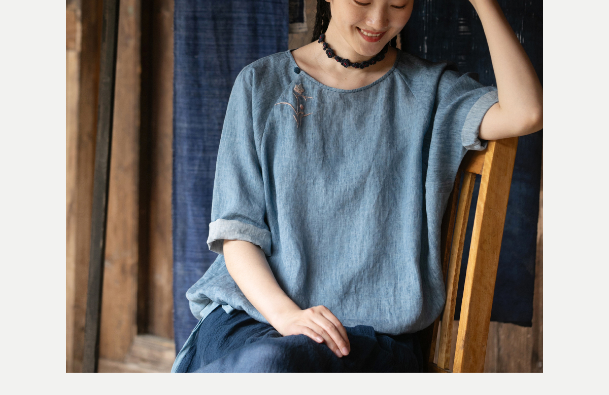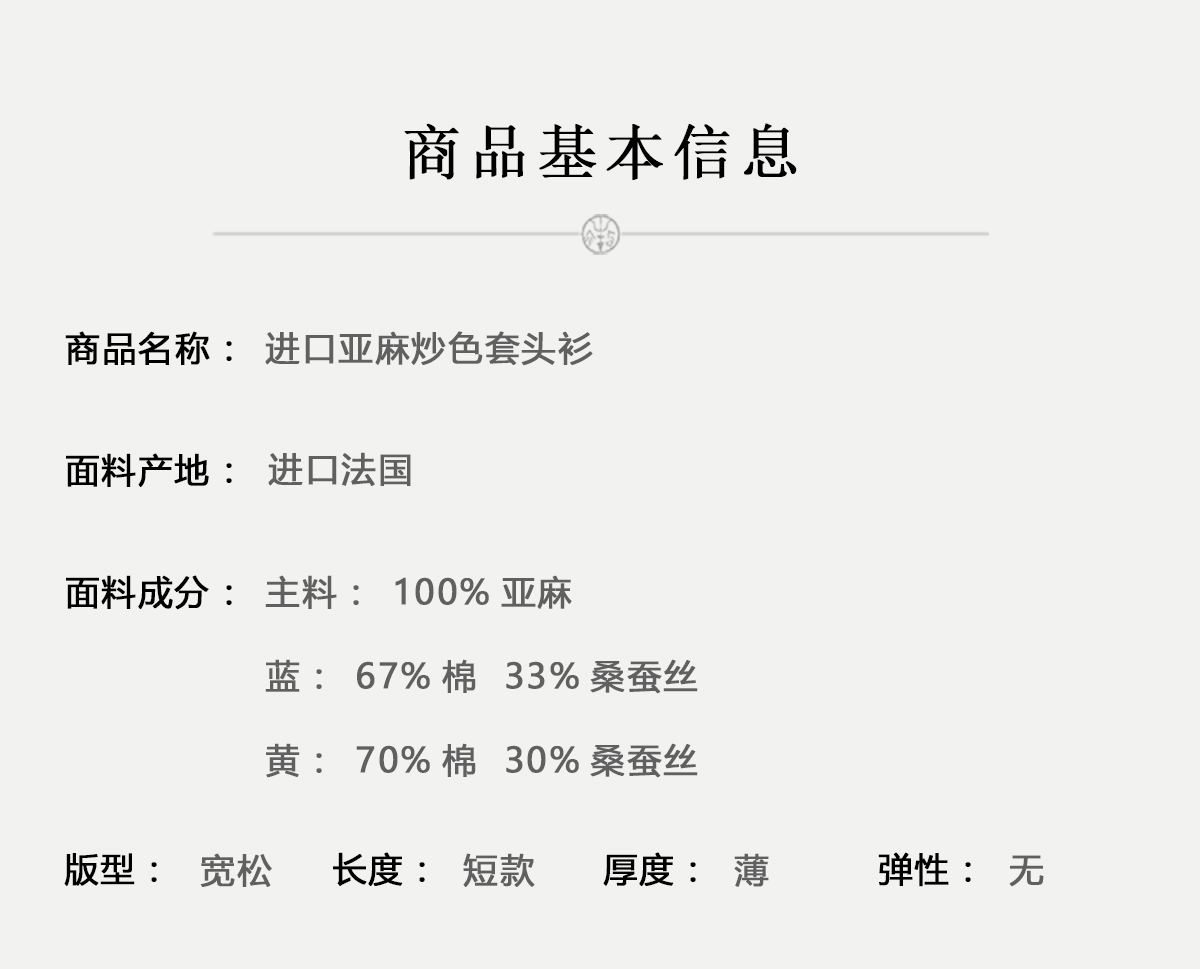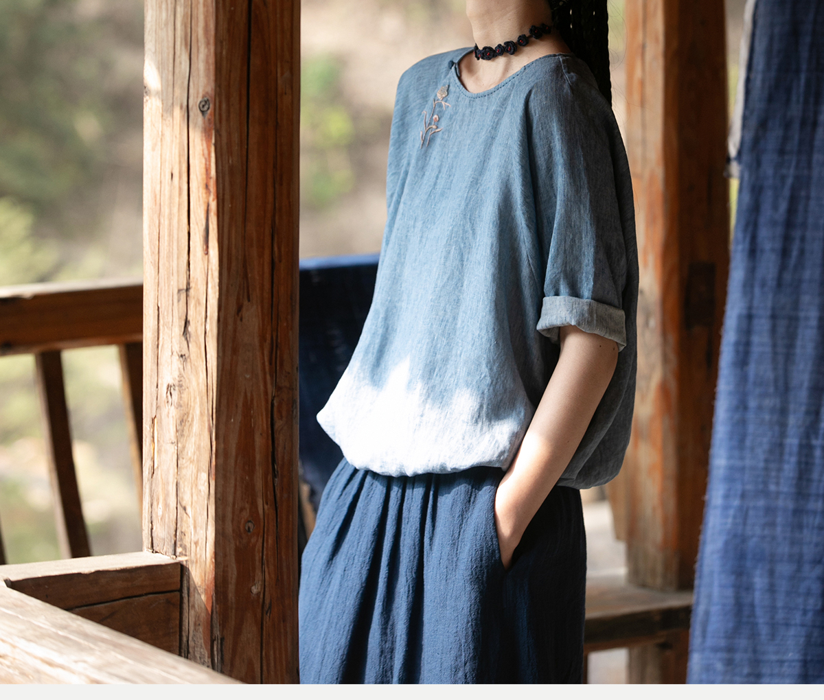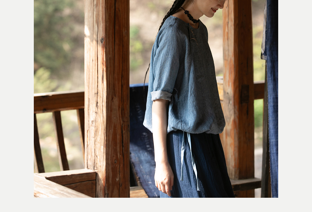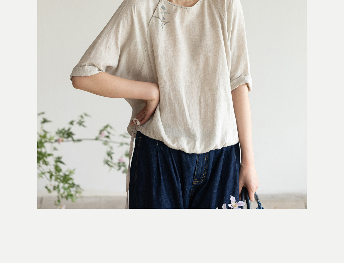 牧衣游原创 进口亚麻手工刺绣炒色套头衫轻薄抽绳七分袖上衣 境禾