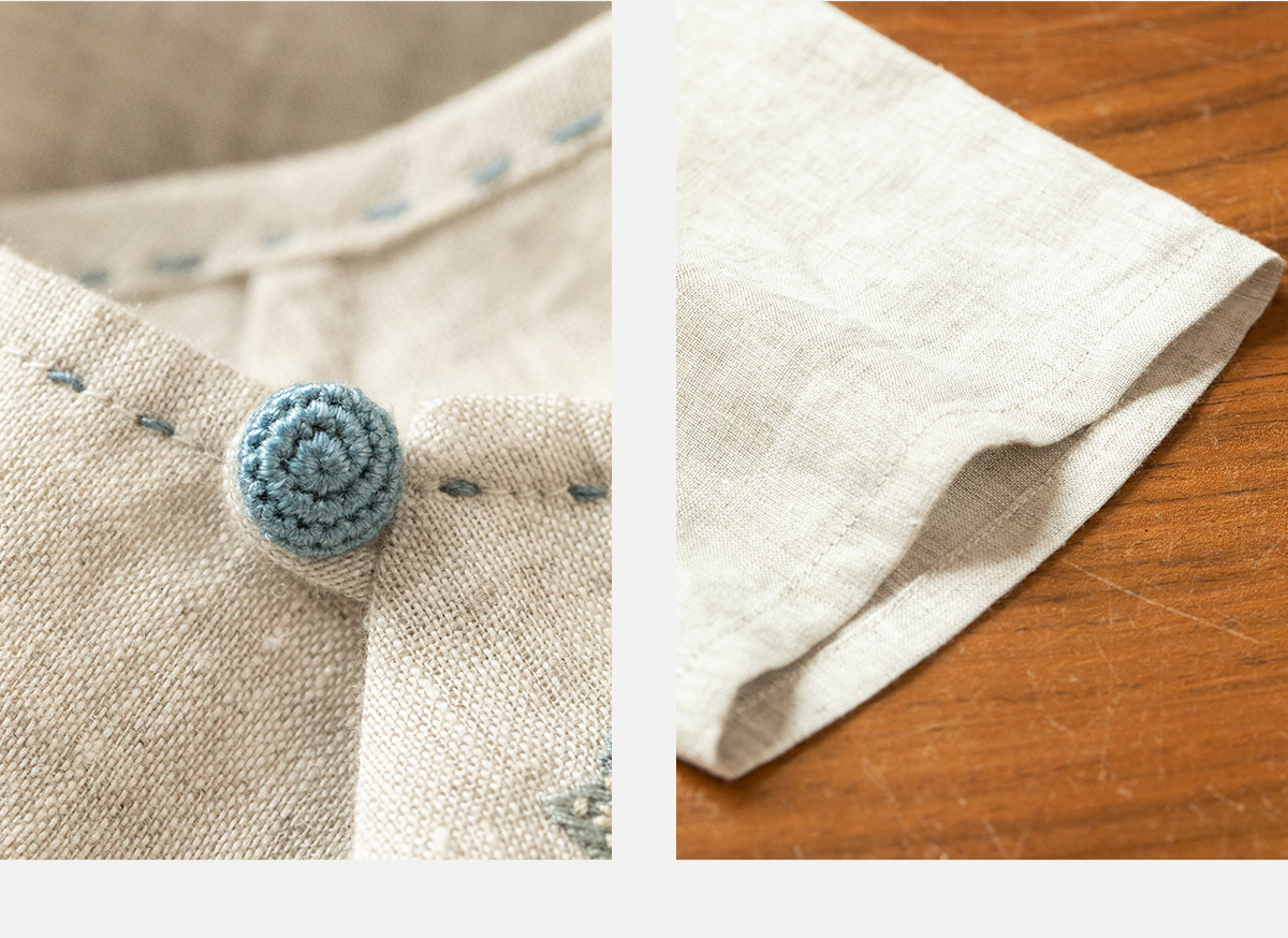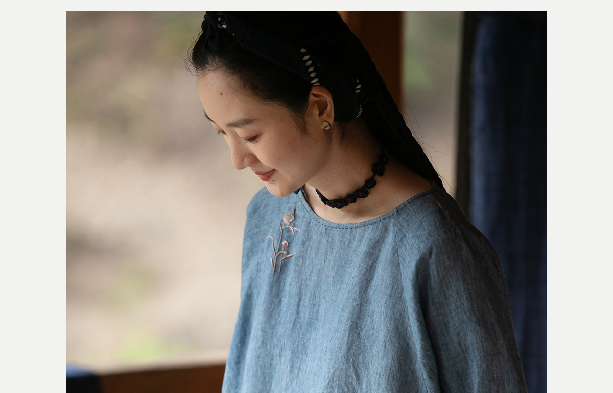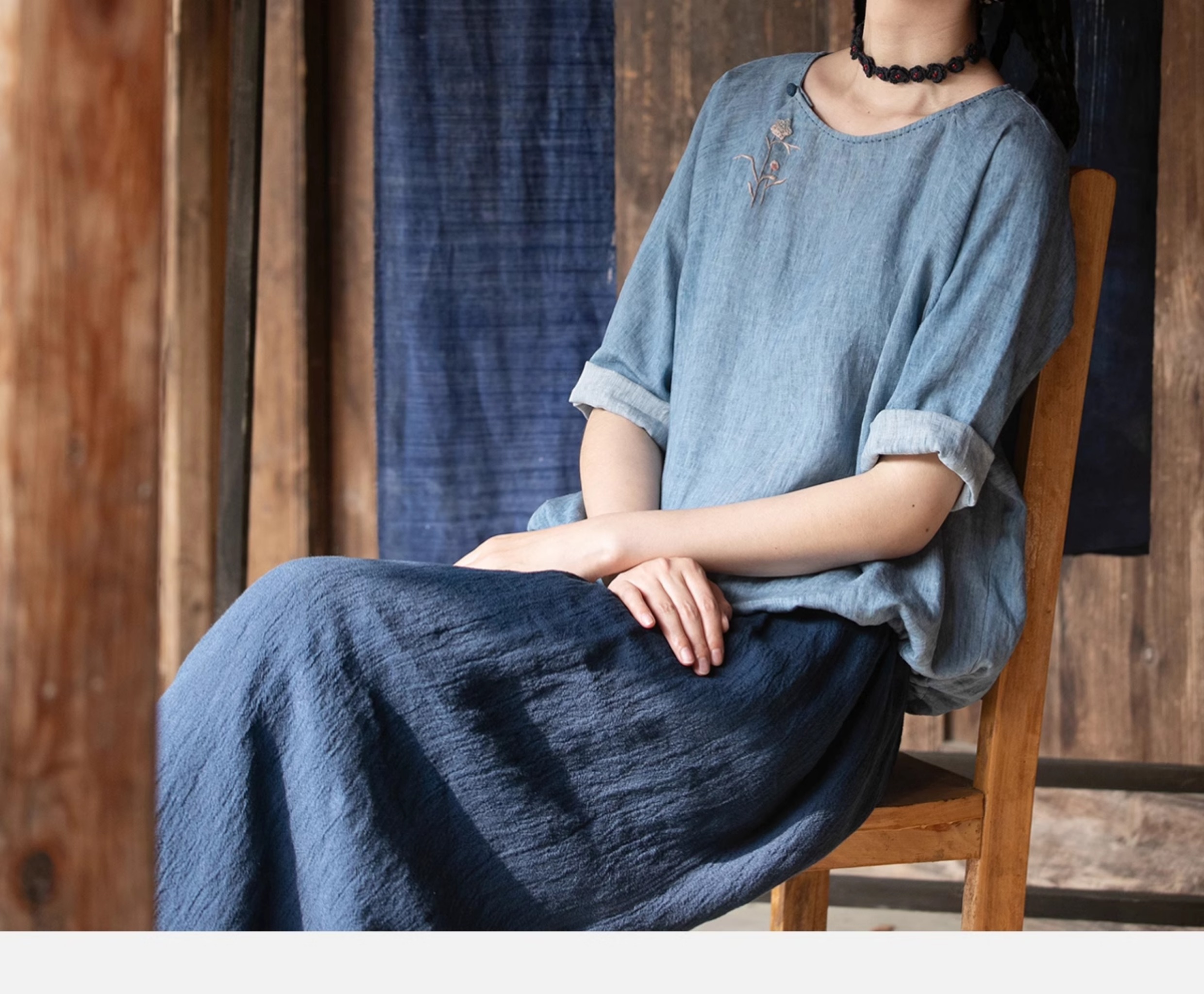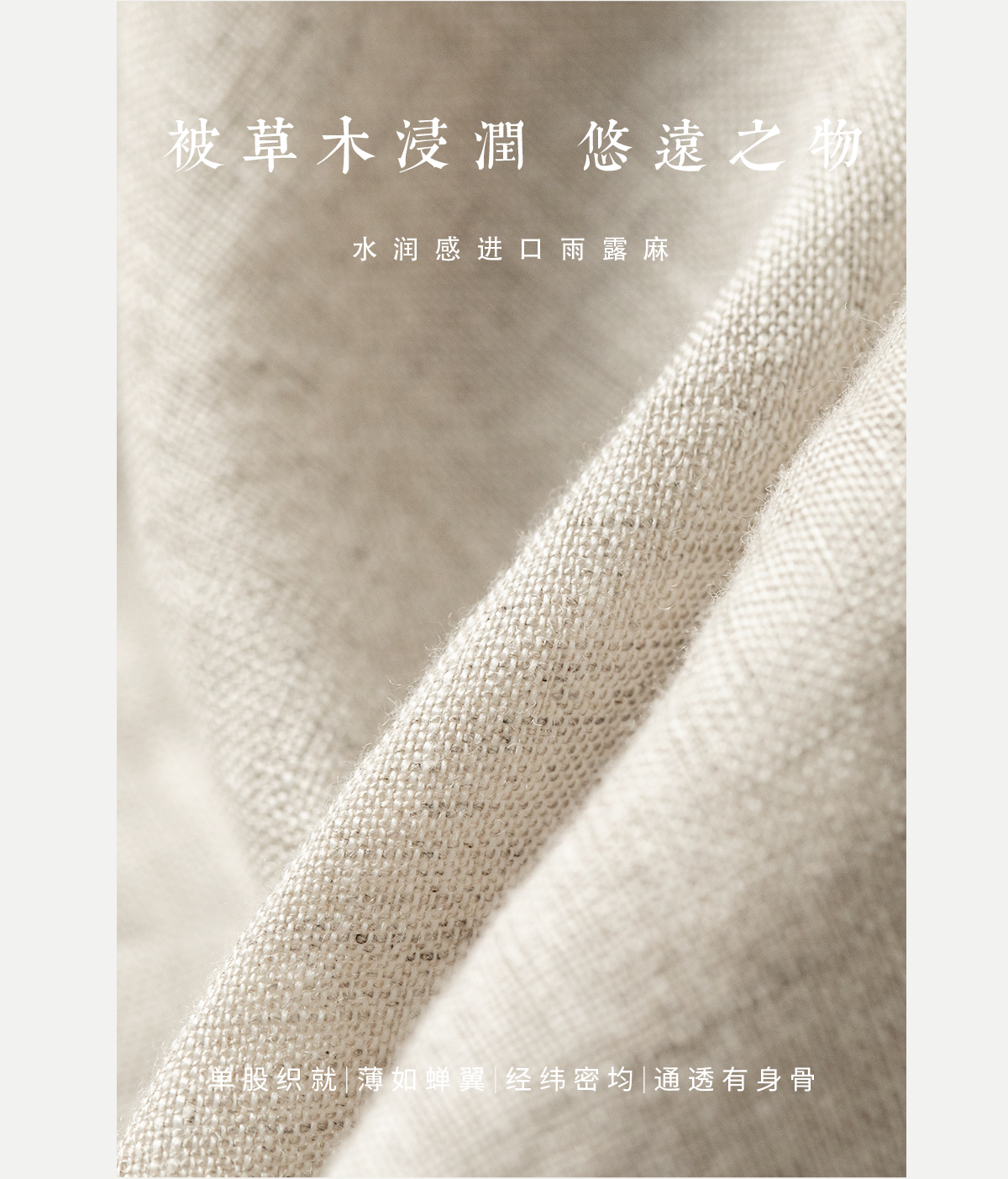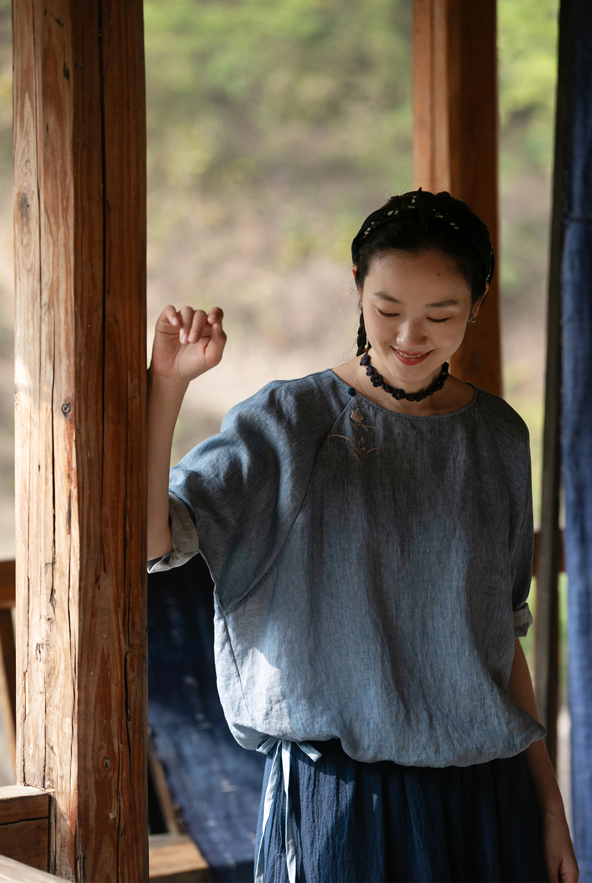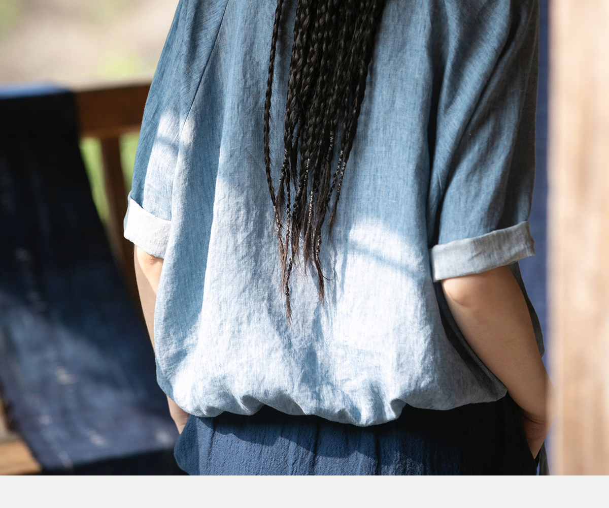 牧衣游原创 进口亚麻手工刺绣炒色套头衫轻薄抽绳七分袖上衣 境禾