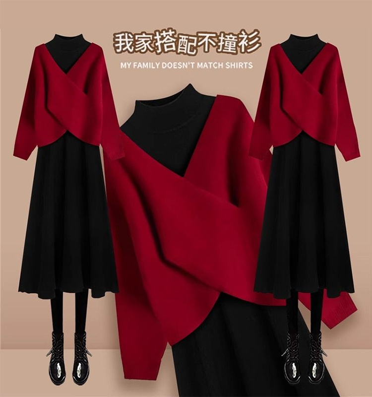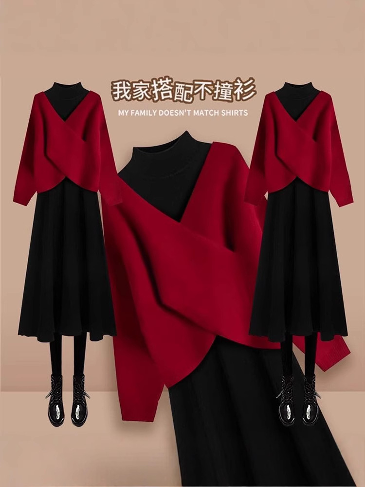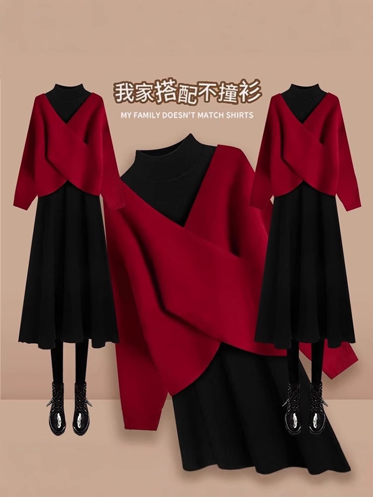 【新年战袍❗️舒适时尚百搭】2026新年法式高级感V领新年毛衣高领连衣裙针织两件套女小个子穿搭一整套。jc