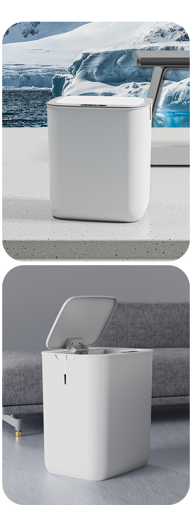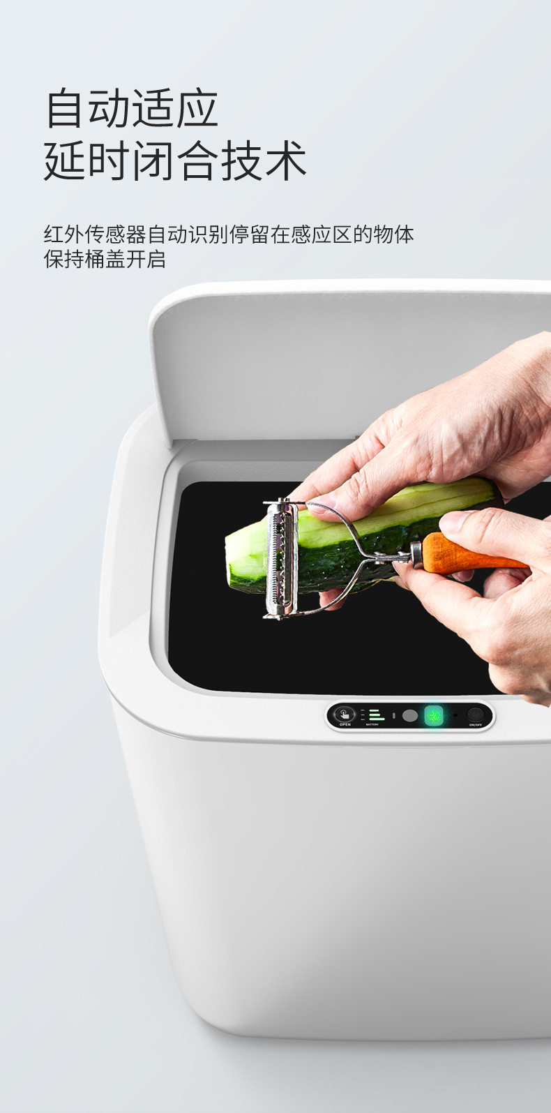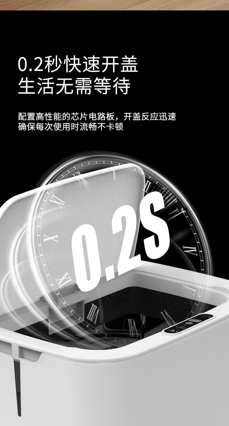 【智能感应 居家必备】当你手握垃圾,它敏锐感应,立刻启动开盖,在你声控离去后,依旧静止着。智能感应垃圾桶,即是对现实的超越,更是跨越。