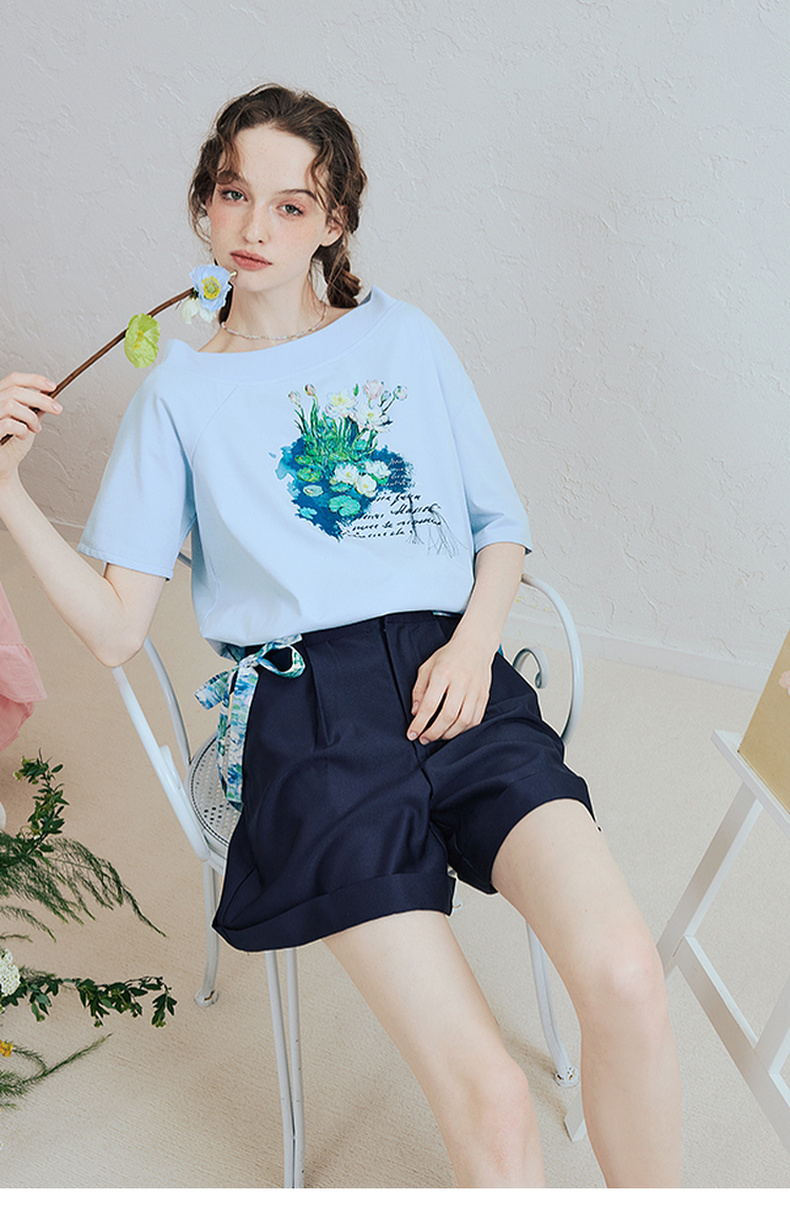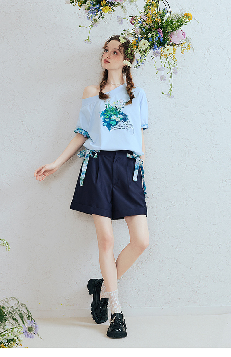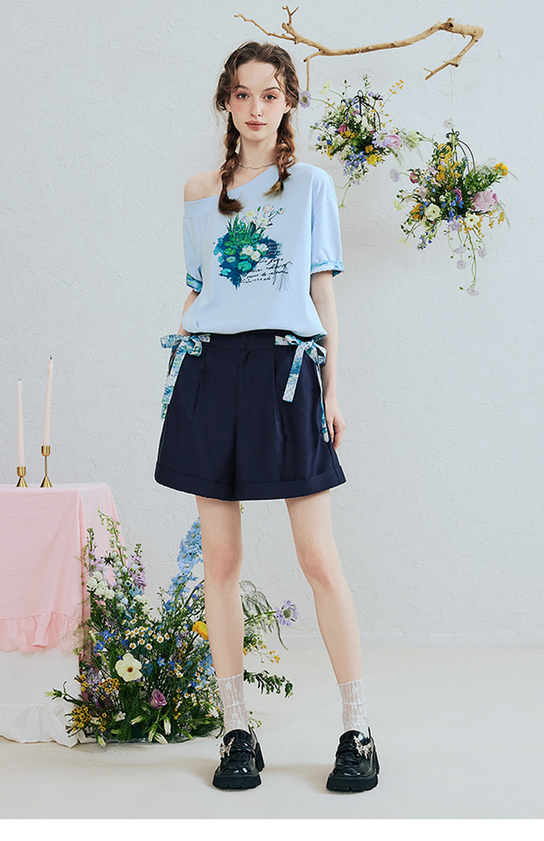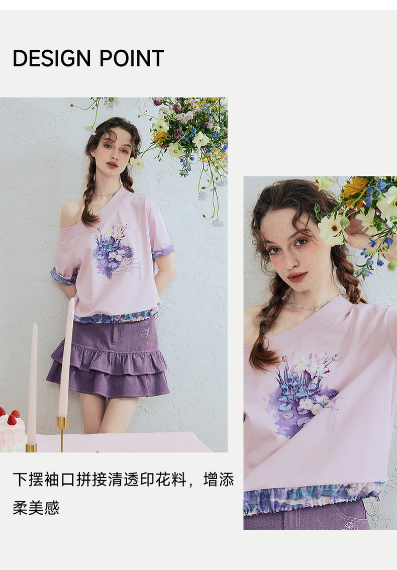 两三事 晨曦折枝 2025夏季新款甜美斜边露肩印花短款t恤女