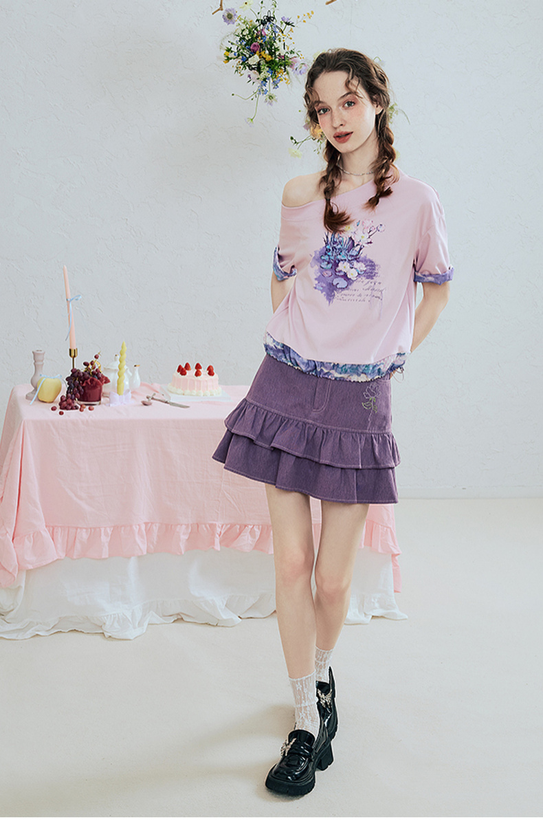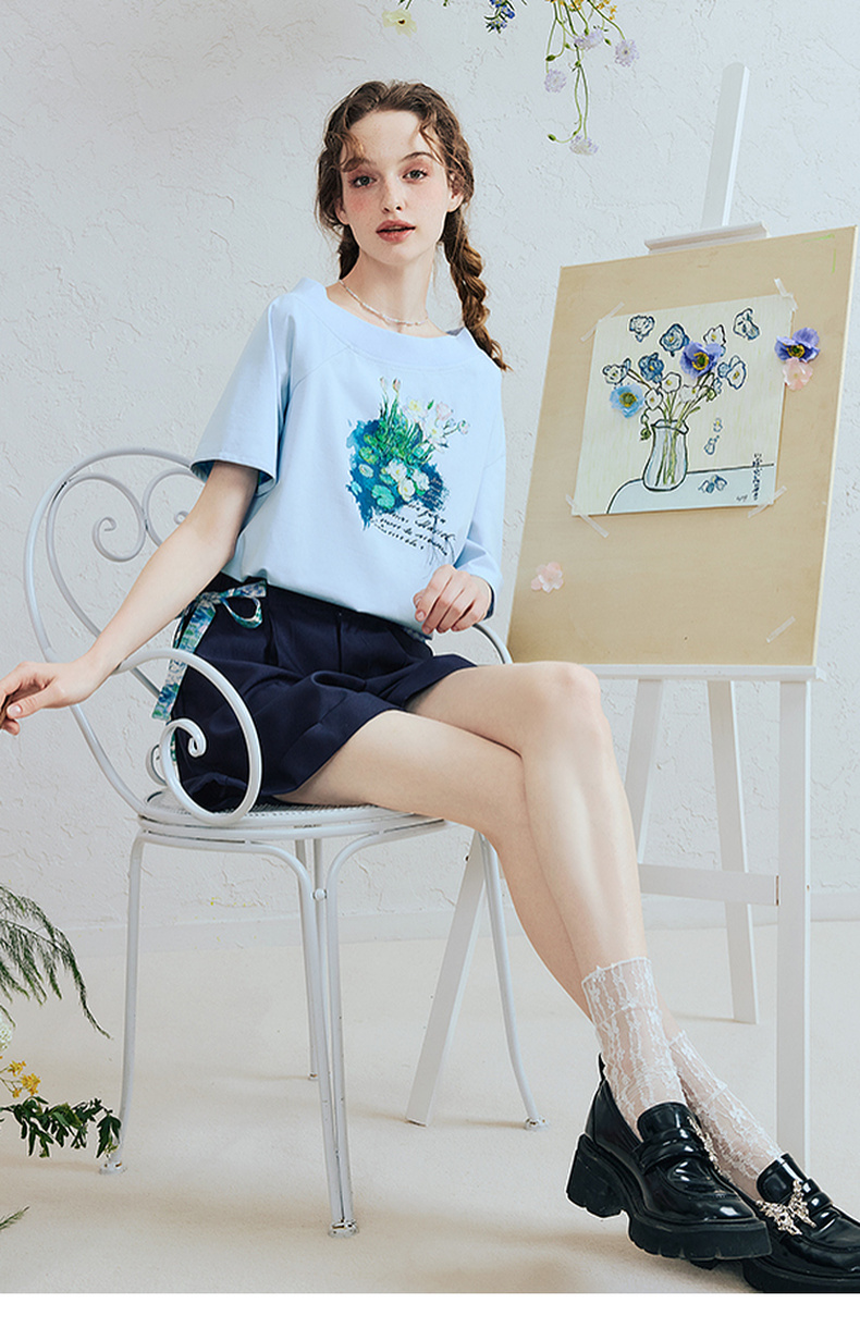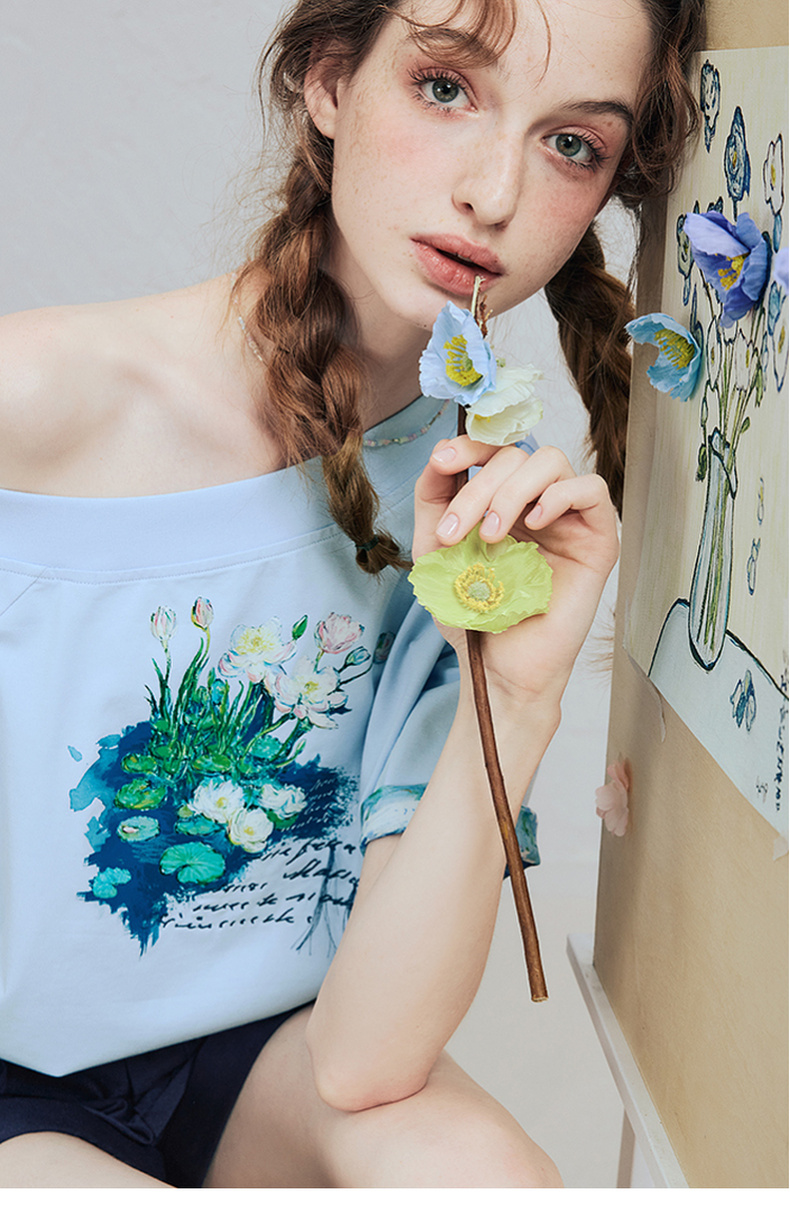 两三事 晨曦折枝 2025夏季新款甜美斜边露肩印花短款t恤女