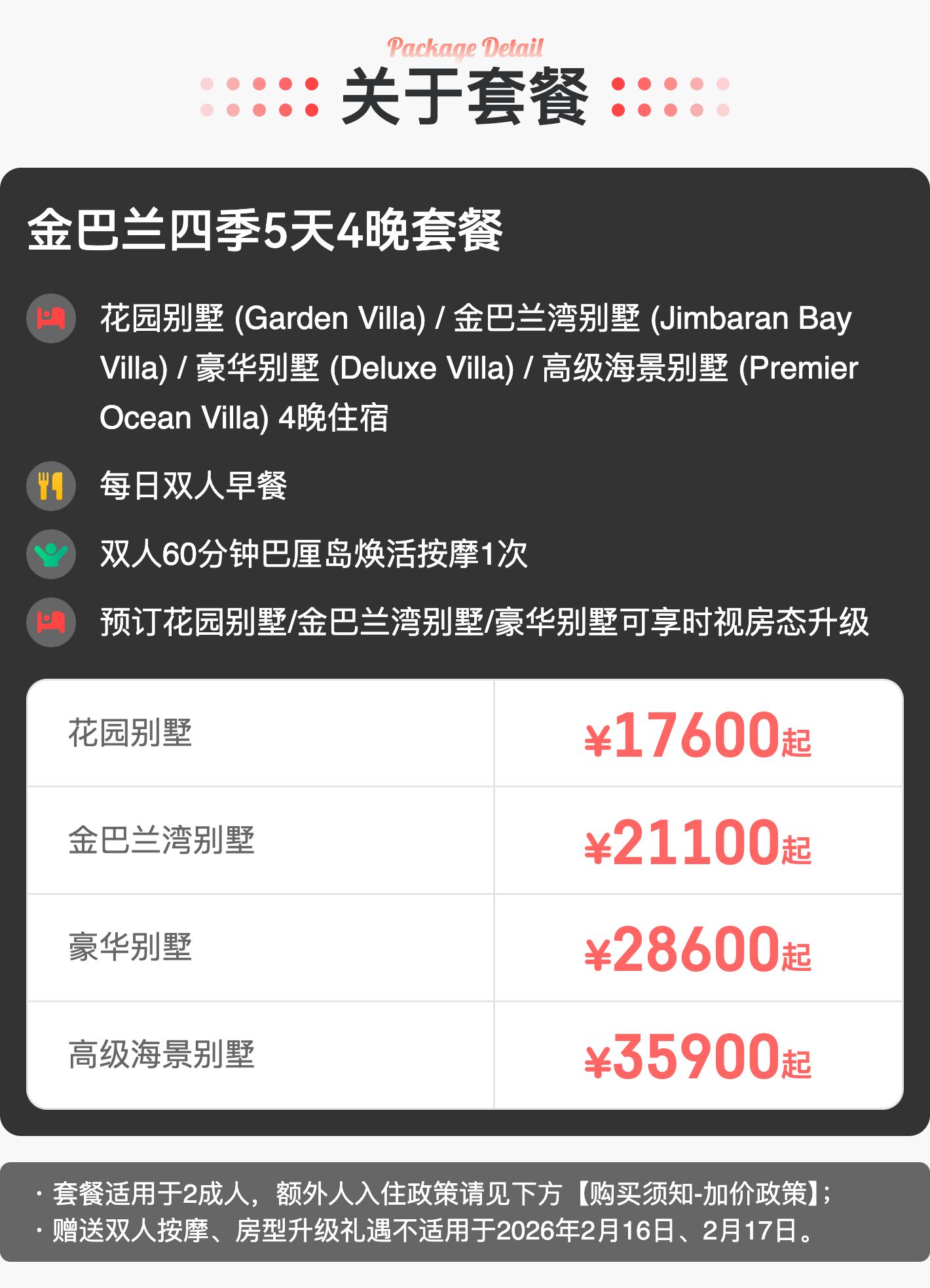 5天4晚【巴厘岛金巴兰四季酒店】寒假/春节不加价!住金巴兰湾四季观超美日落,享每日早餐、双人60分钟按摩、免费升房福利~