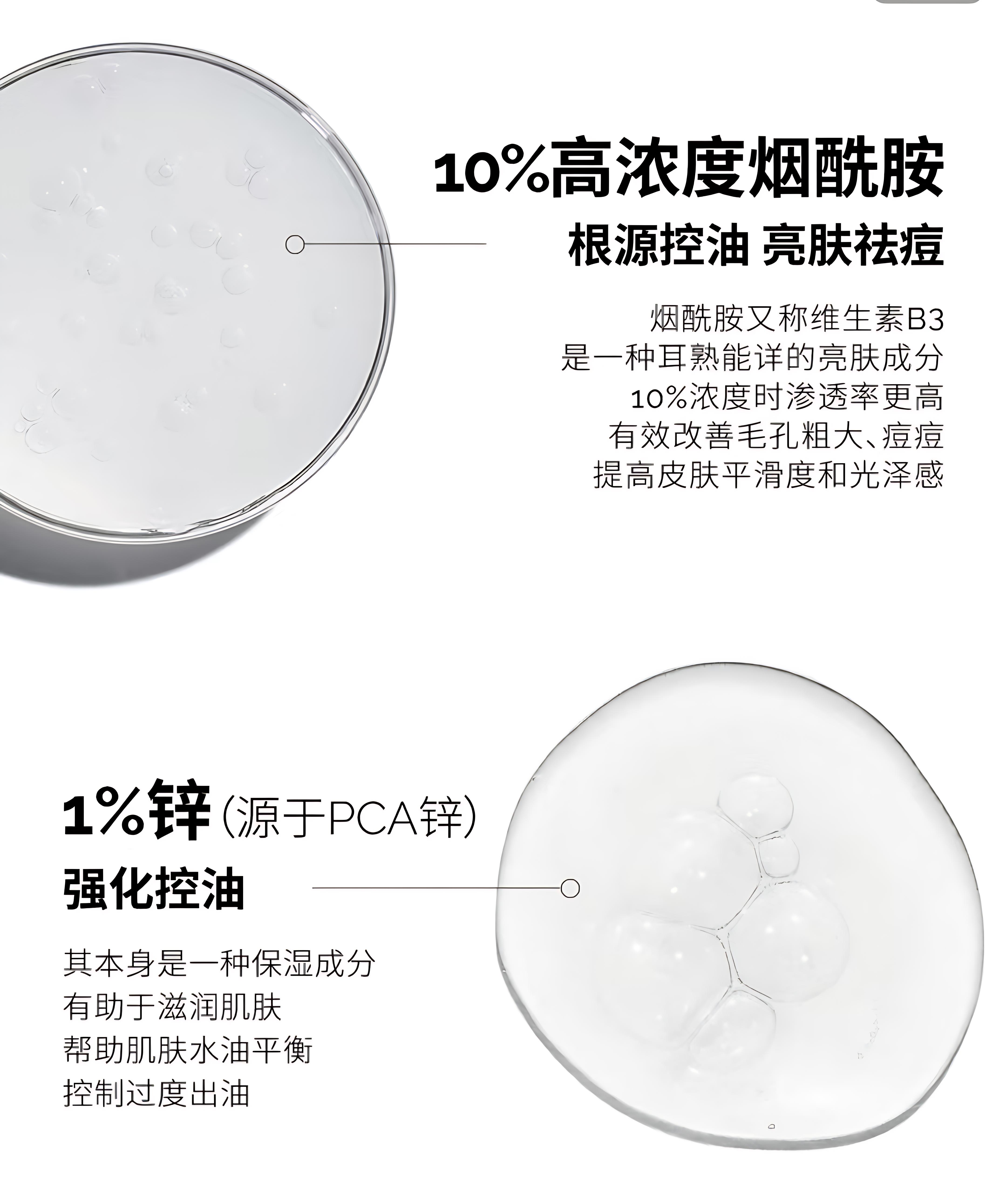 含有高浓度10%的烟酰胺(维他命B3)和锌PCA