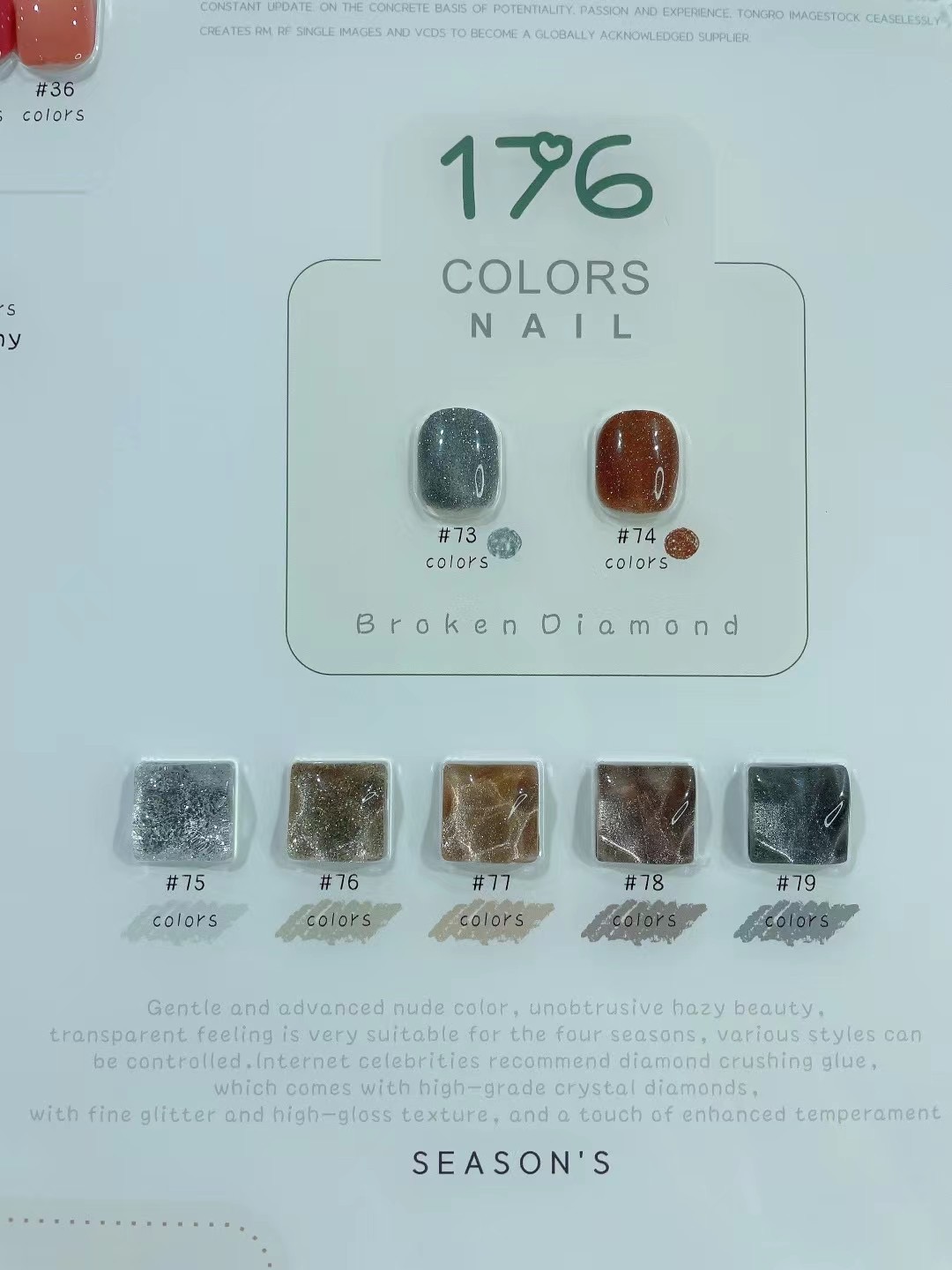 内有精选纯色——蹦迪碎钻胶——金箔胶——韩国大亮片——晶石猫眼——水润冰透色——蛋壳胶——爆闪大闪片——贝壳胶——高光胶——砂糖胶