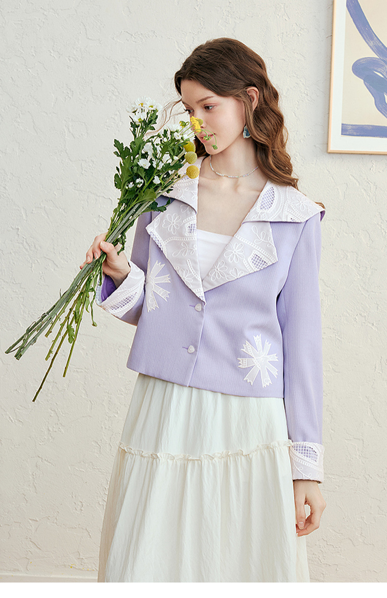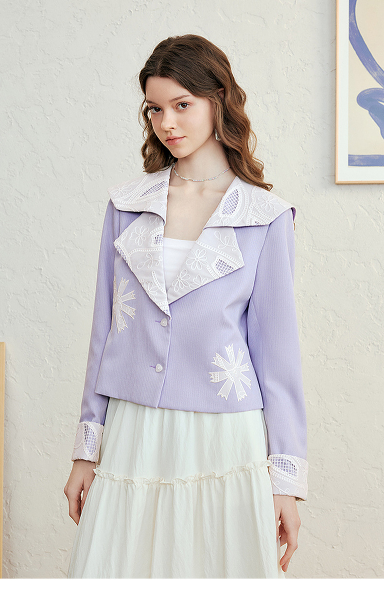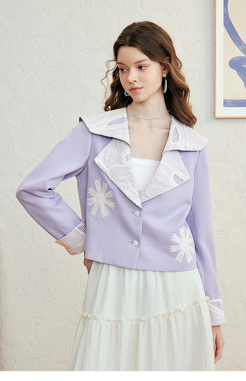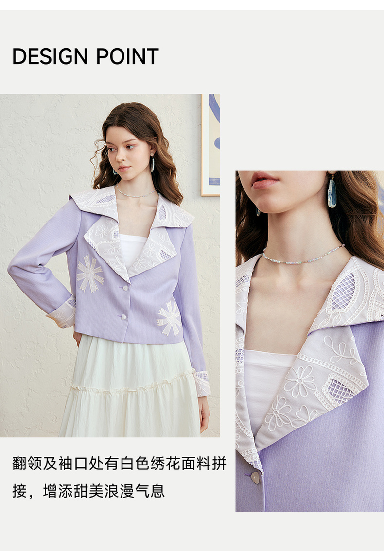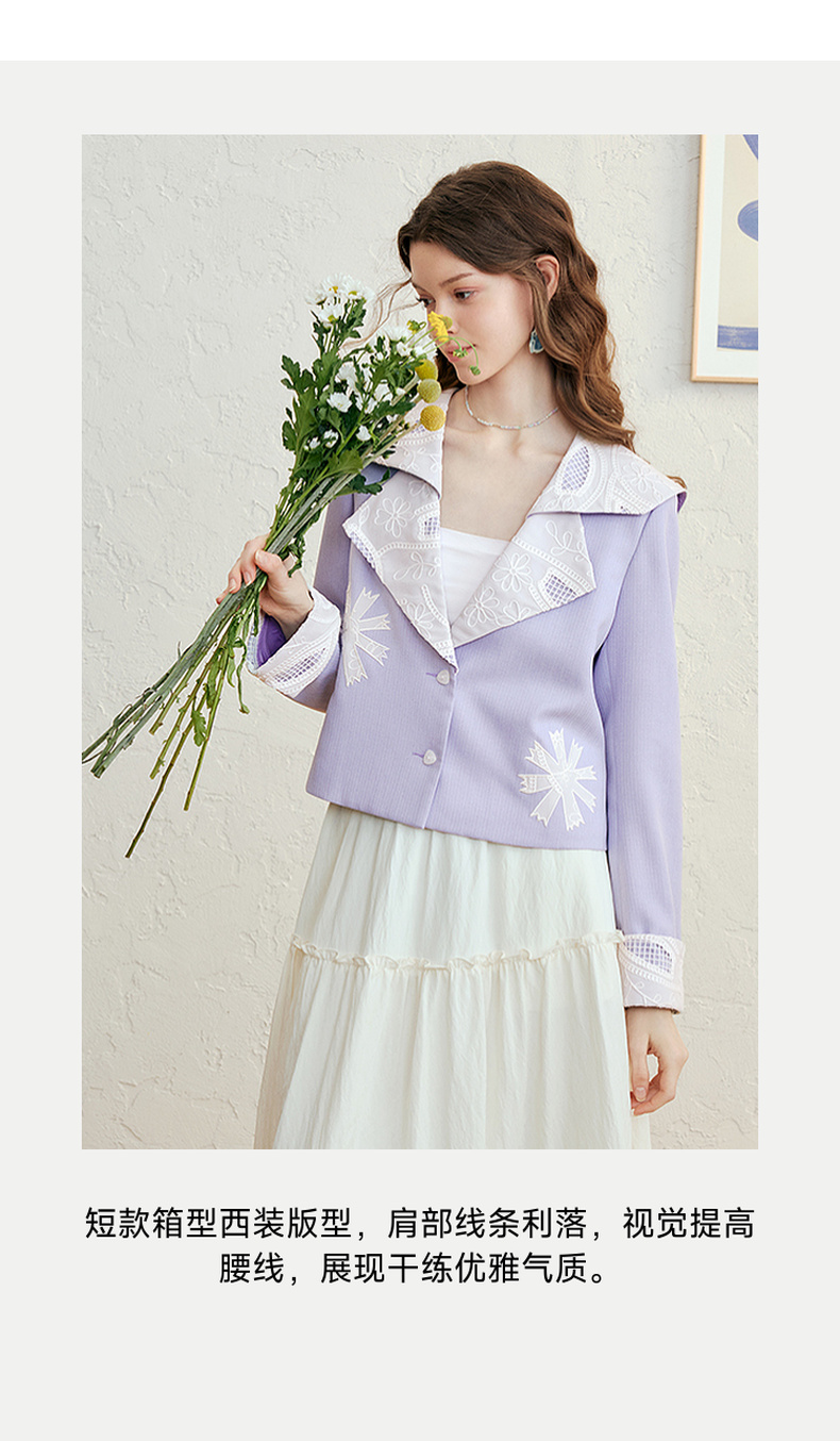 两三事 轻描生趣 2025春季新款小清新蕾丝拼接西装外套女短款