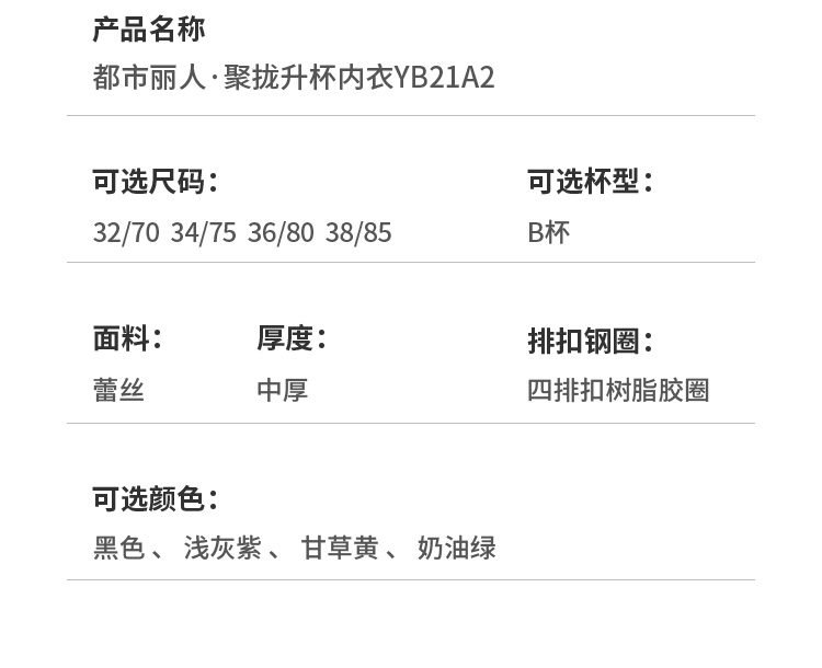 都市丽人聚拢升杯聚拢杯B杯常规内衣蕾丝中厚3/4杯文胸四排扣树脂胶圈YB21A2