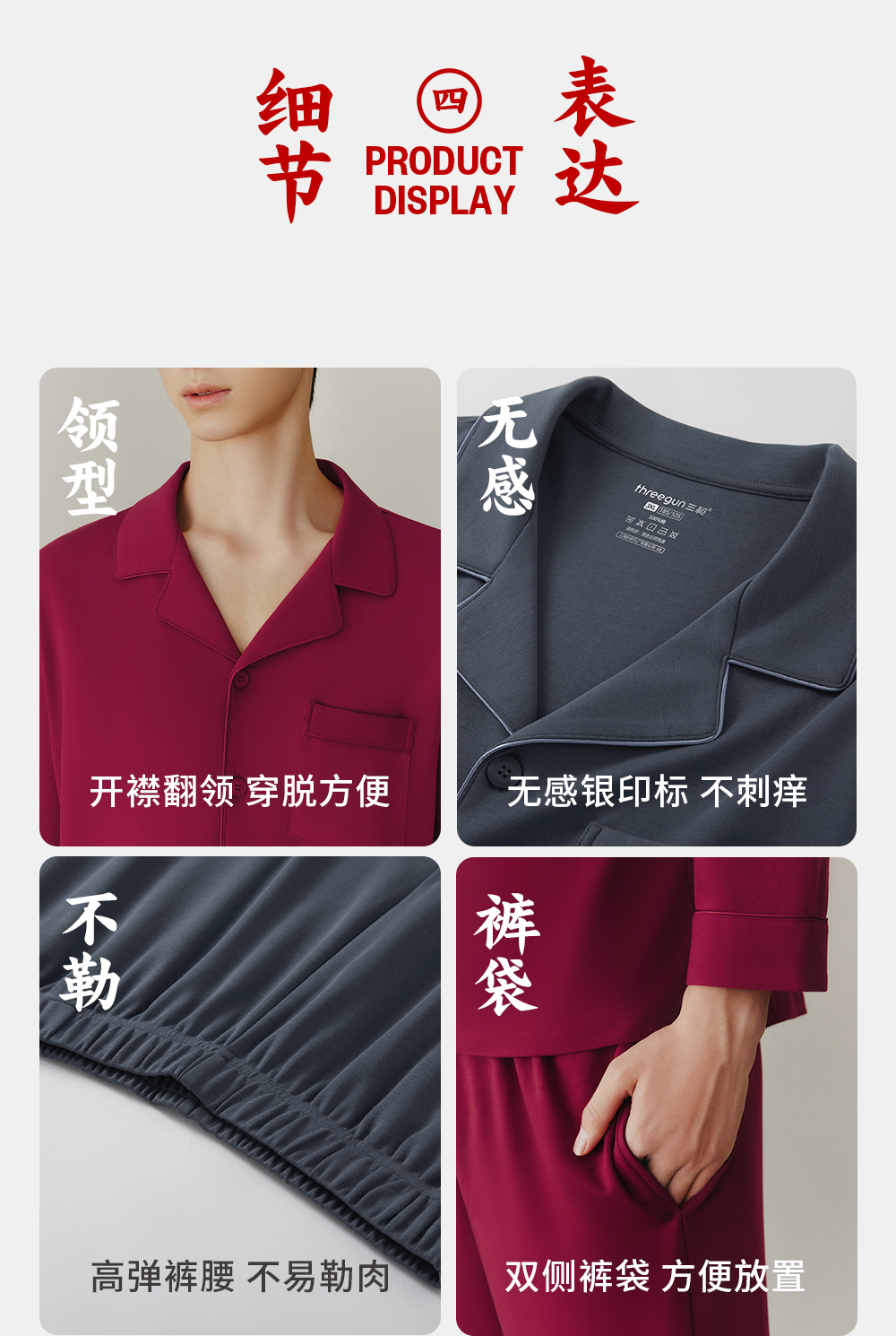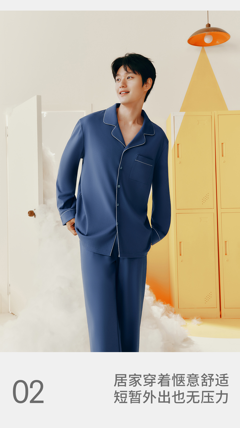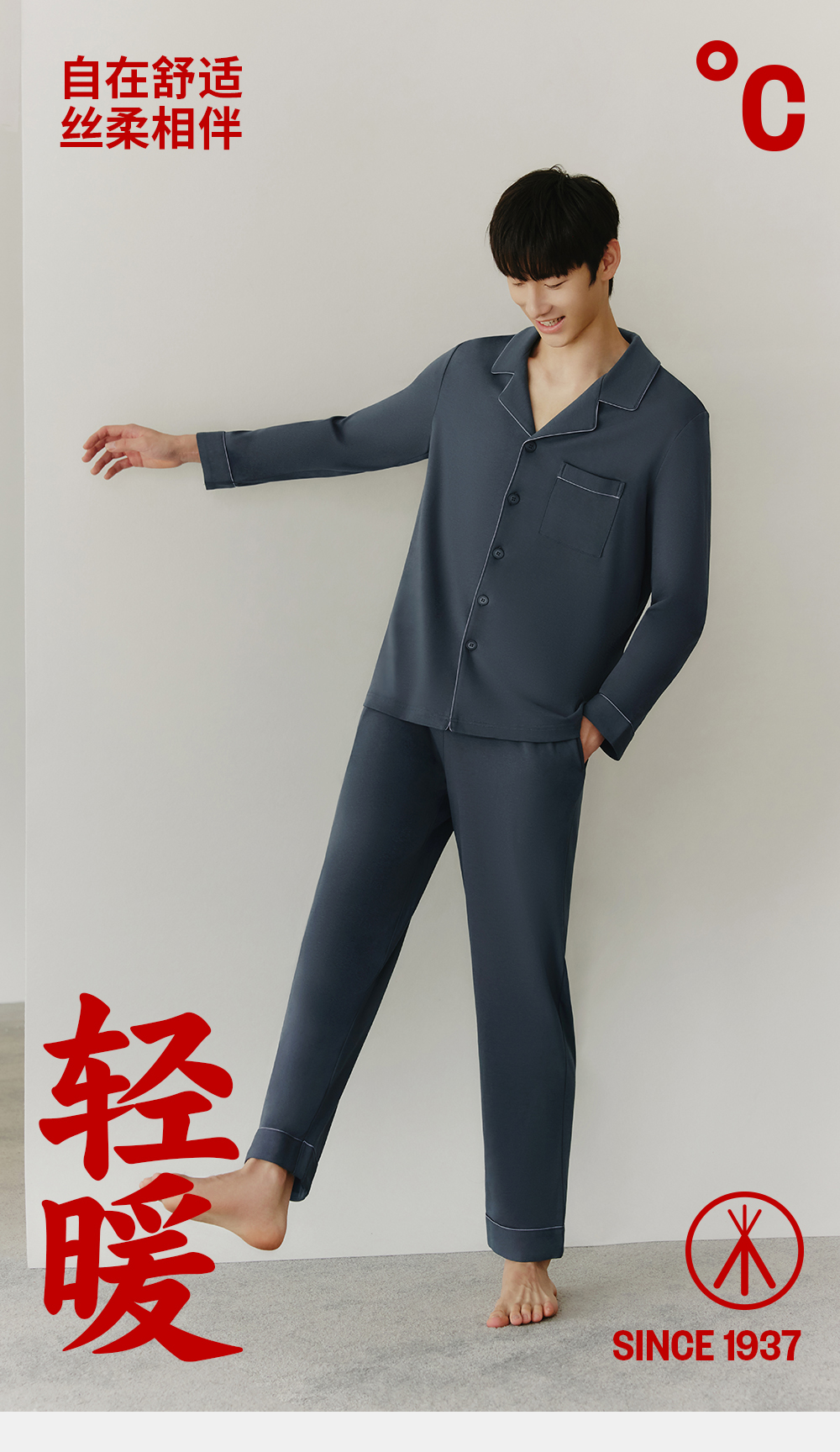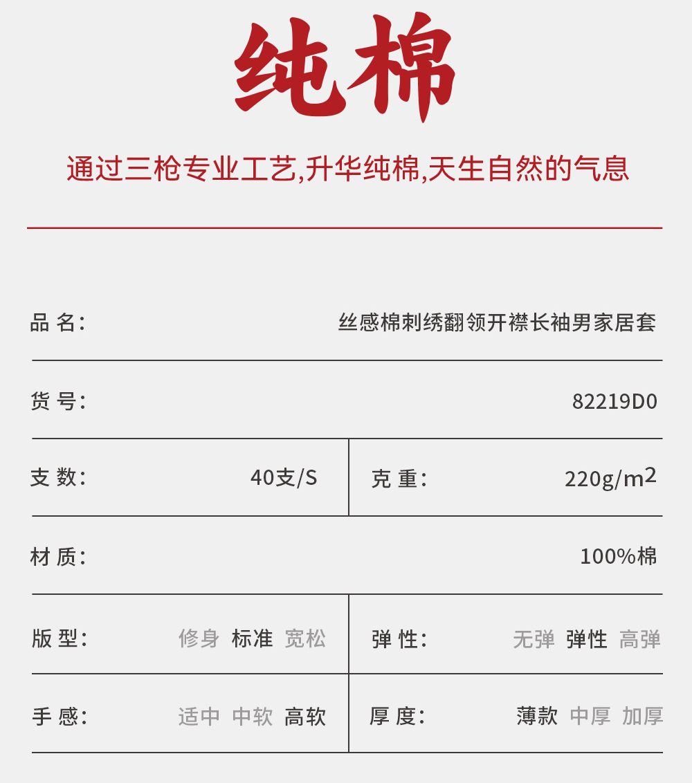 Threegun三枪 【丝感棉】翻领开襟长袖长裤男士家居套家居服-82219D011