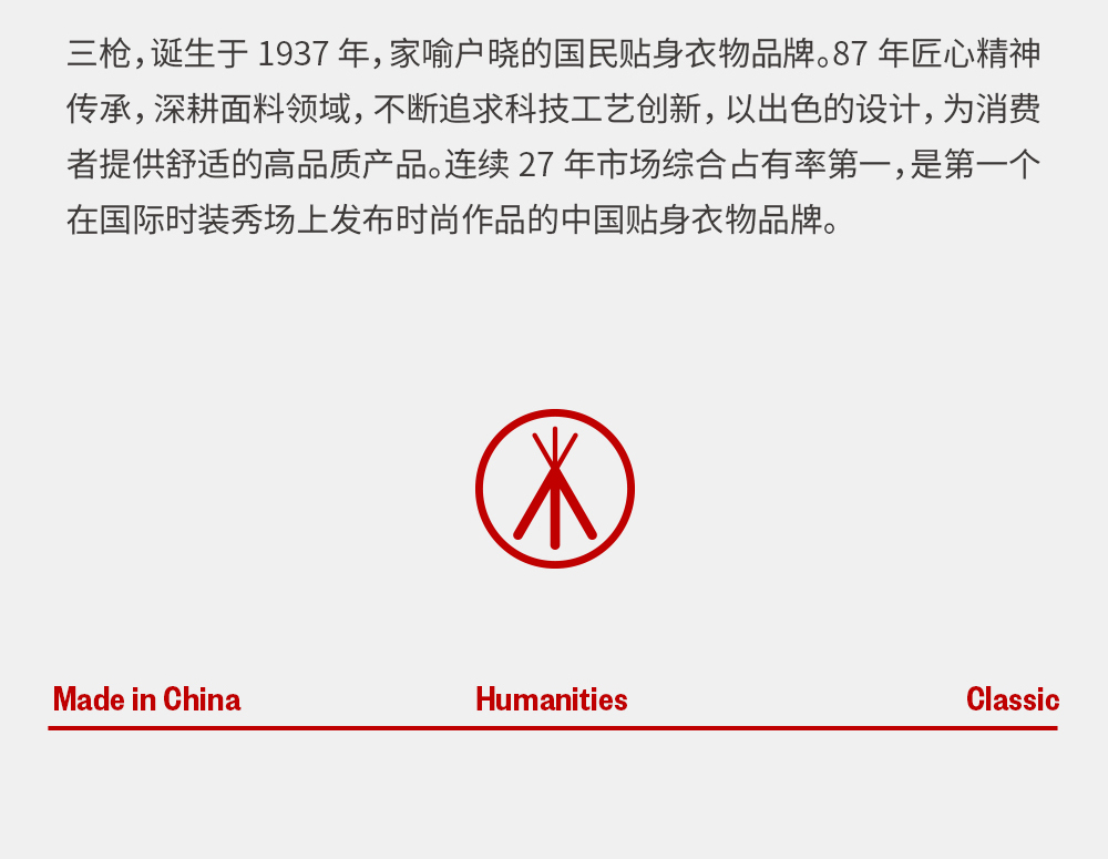 - 创建于1937年,中国代表性民族品牌 “引领内衣发展趋势,倡导身心合一的温馨生活” 是品牌的发展理念 始终致力于面料的舒适性和功能性开发 融合科技与时尚 用心呵护您的每一次贴身体验