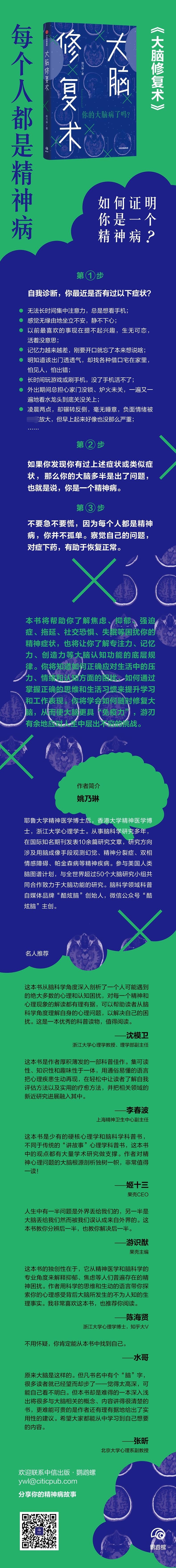 缺乏专注力、焦虑、抑郁、记性变差、社交恐惧、成瘾、 强迫症、失眠……现代社会中几乎每个人都会受到各种 各样心理和精神问题的困扰。如何识别自己的心理和精 神问题,如何应对快节奏生活带来的压力和成长中必经 的心理困境,如何在适应社会的过程中保持心理健康, 并拥有满意的学习和工作表现,本书作者一耶鲁大学 精神医学博士后姚乃琳一给出了答案。