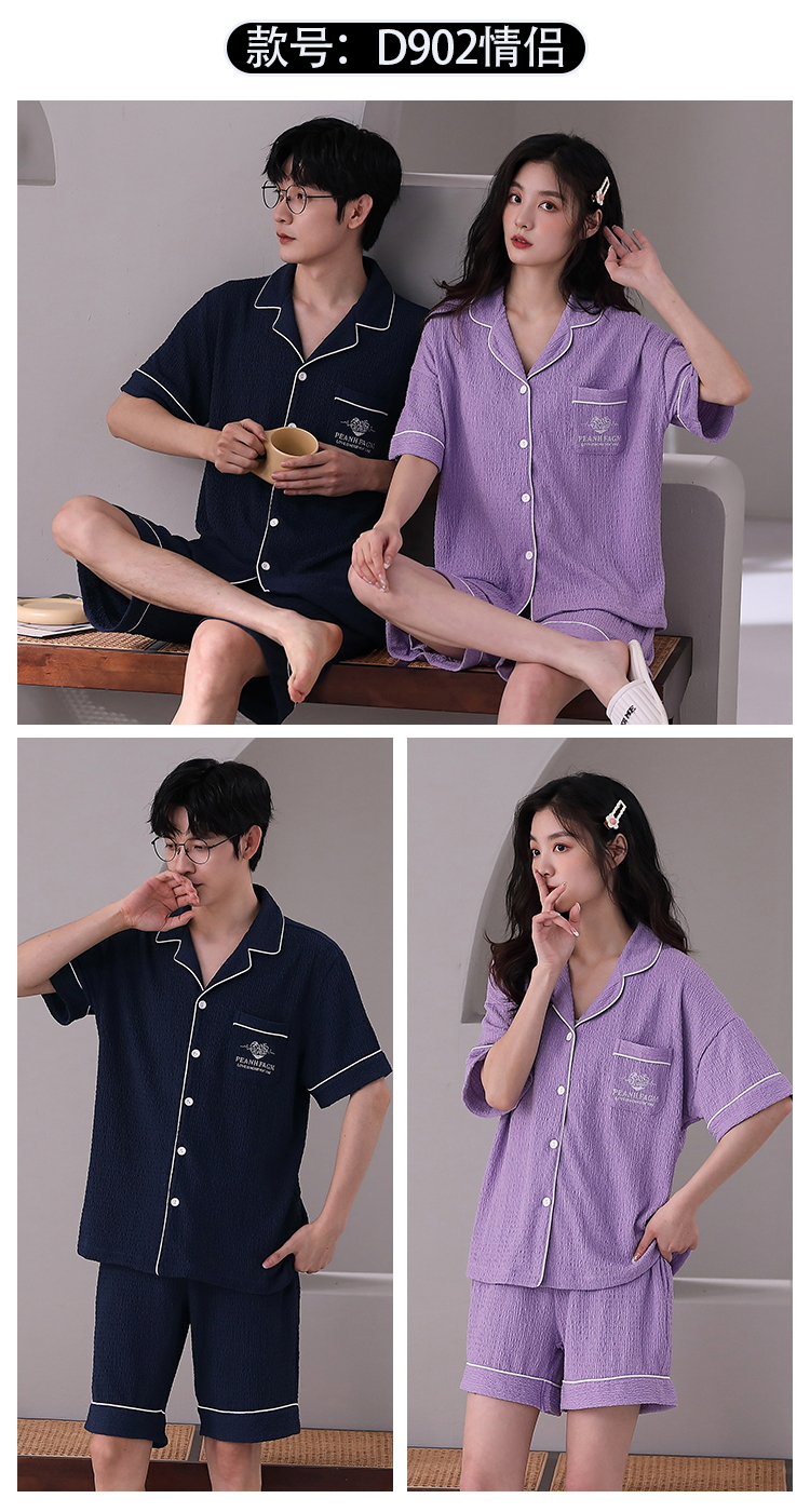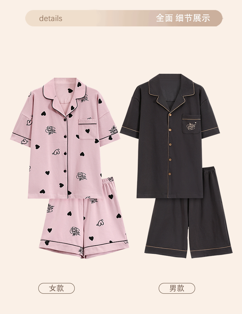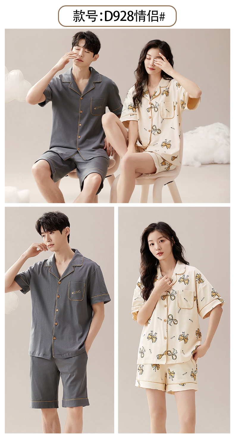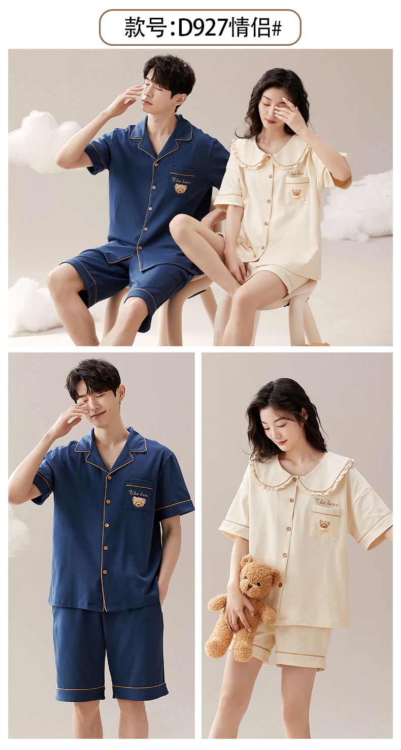 自然醒素香情侣睡衣女夏针织棉短袖短裤开衫韩版卡通加大码男士夏天家居服套装QH