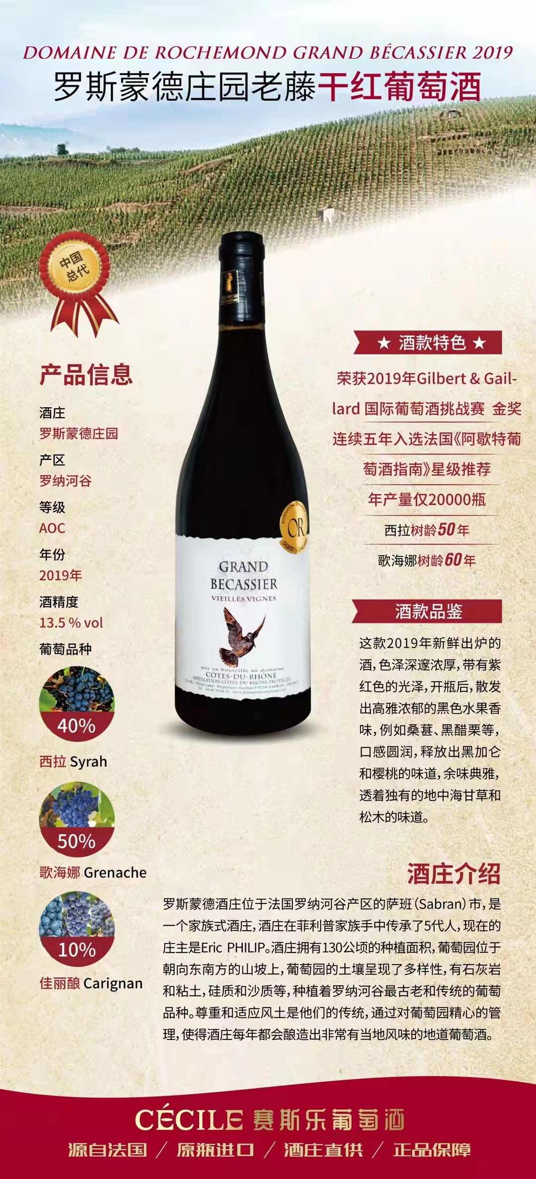 【赛斯乐】法国原装进口罗纳河谷AOC罗斯蒙德庄园老藤干红葡萄酒 750ml