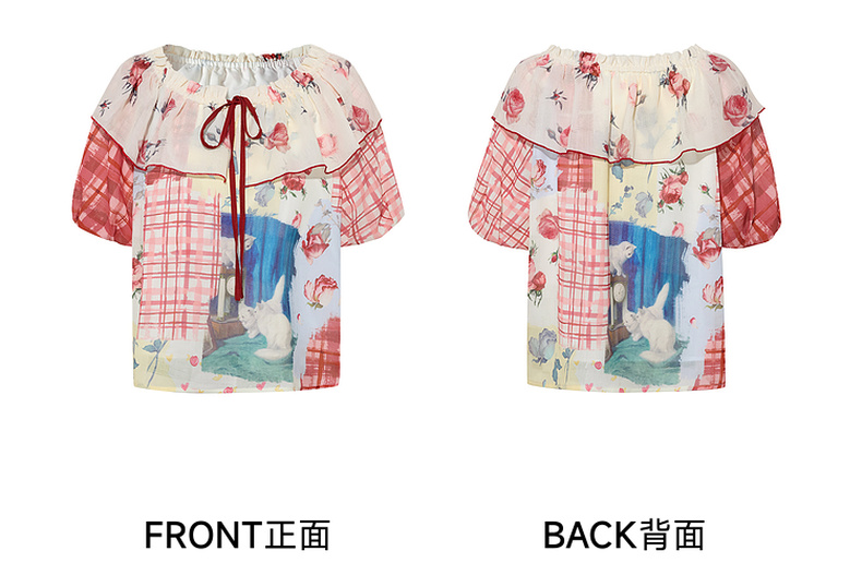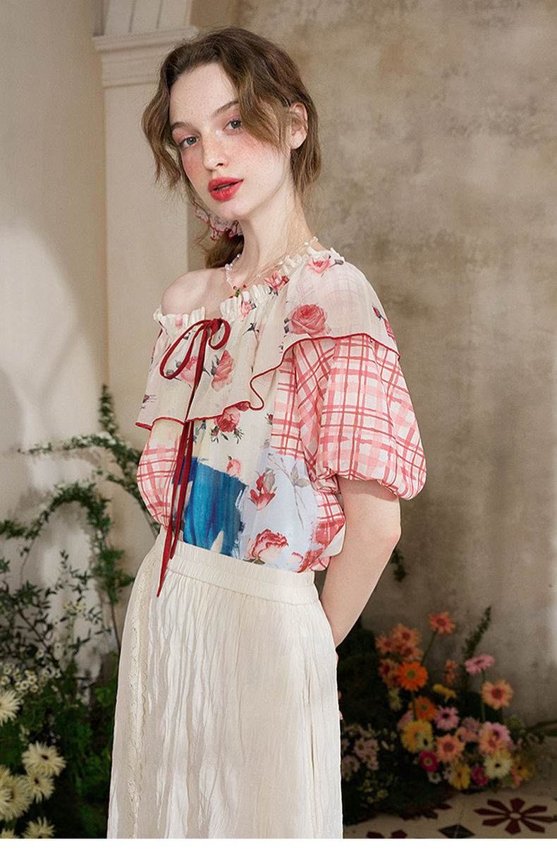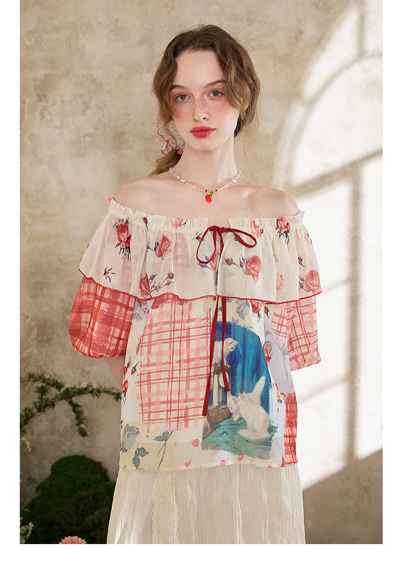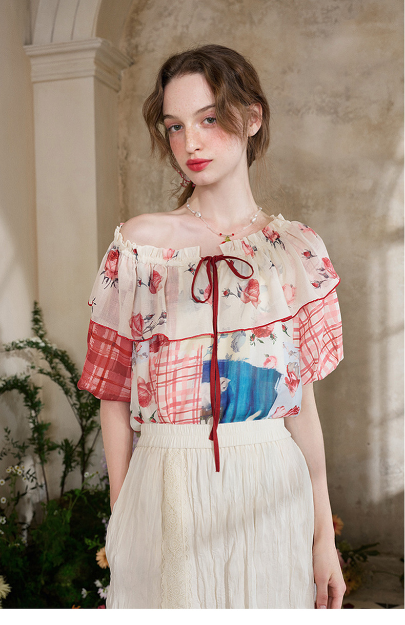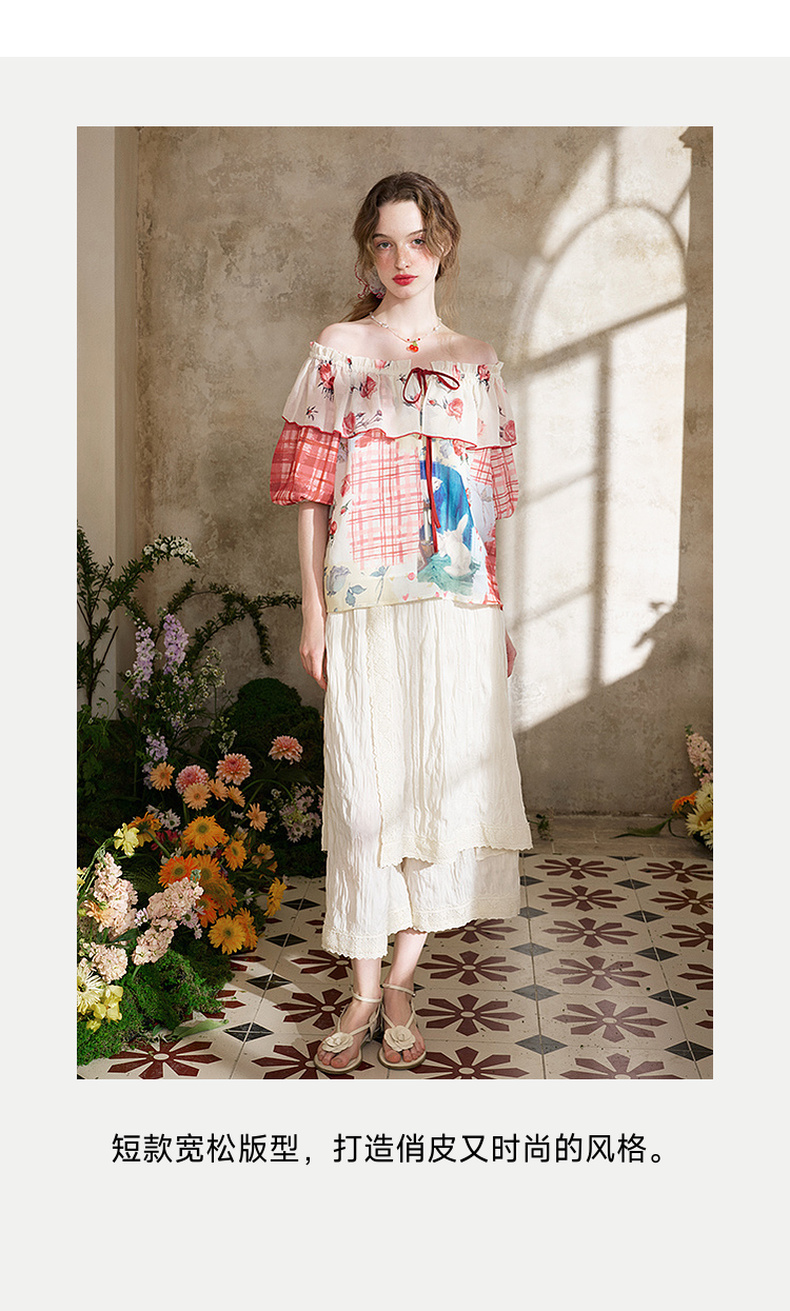 两三事 花蔓知夏 2025夏季新款荷叶边一字肩印花雪纺衫女宽松