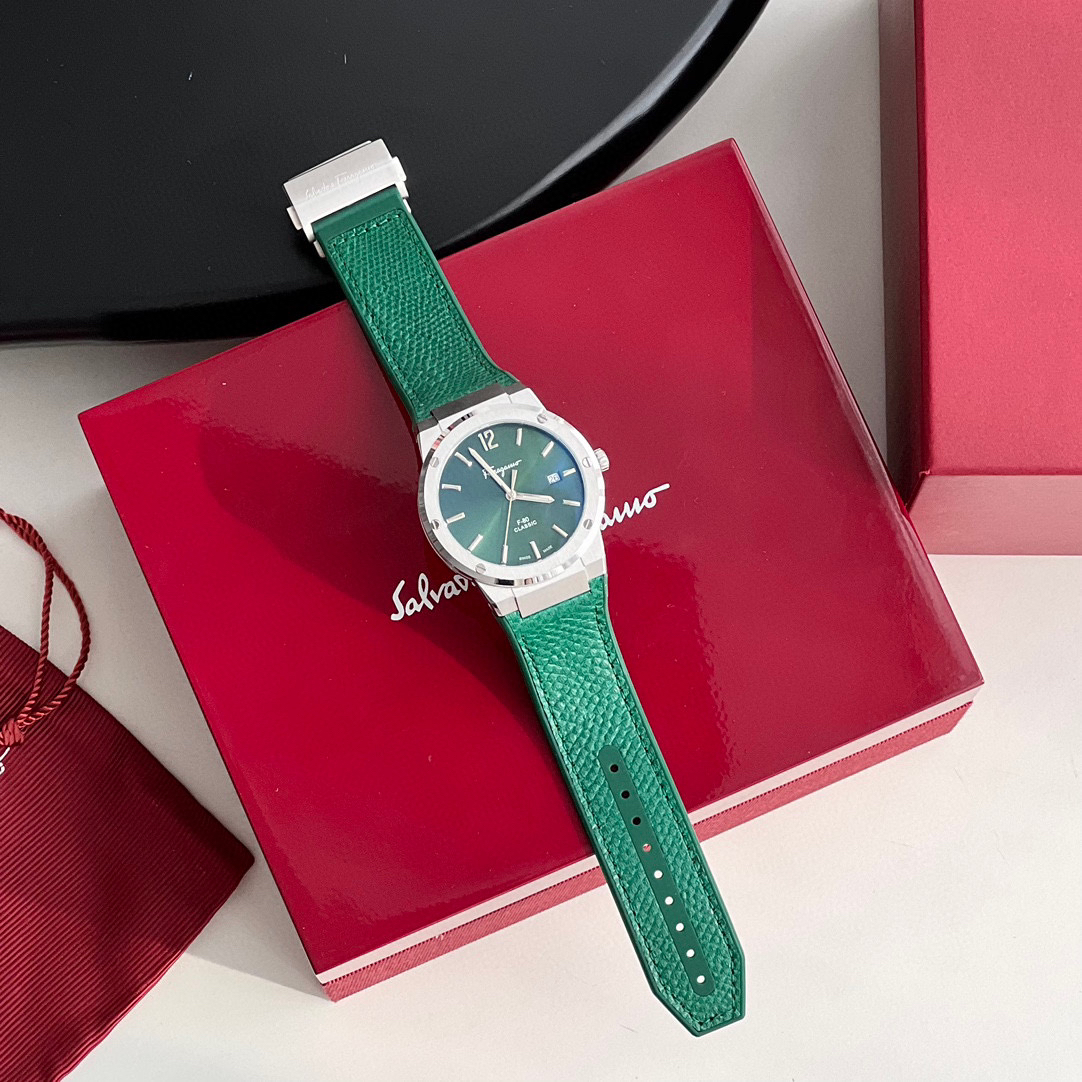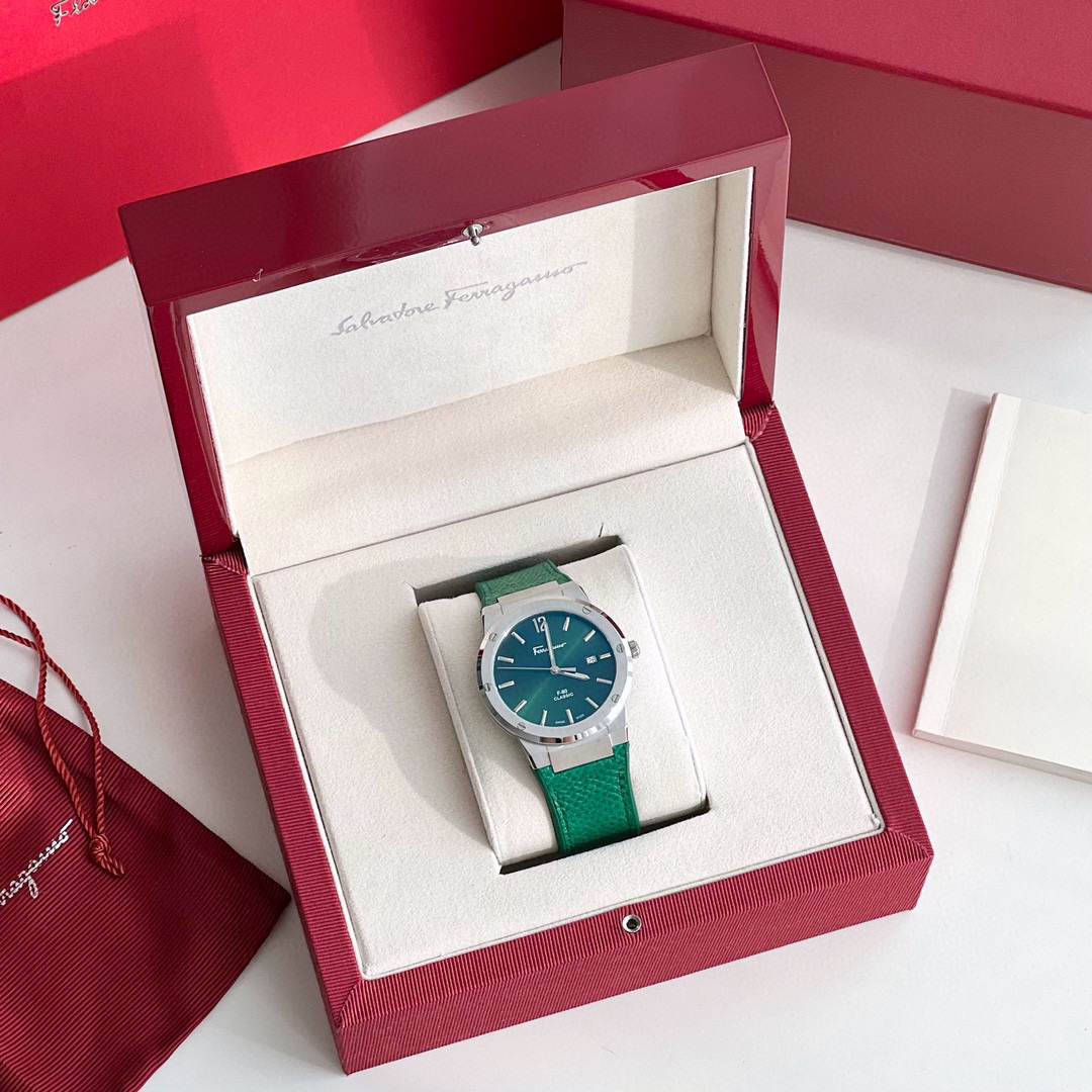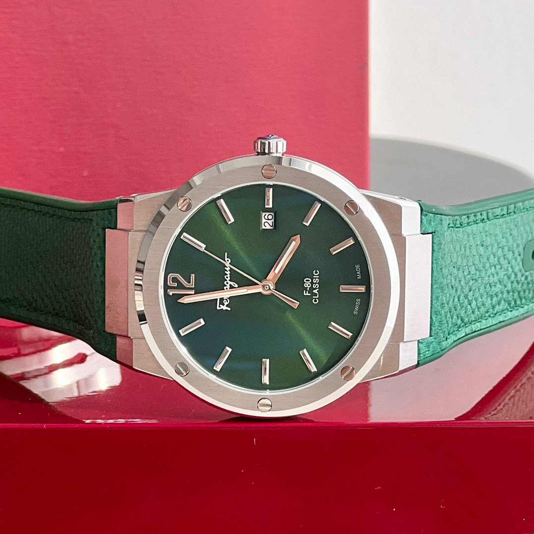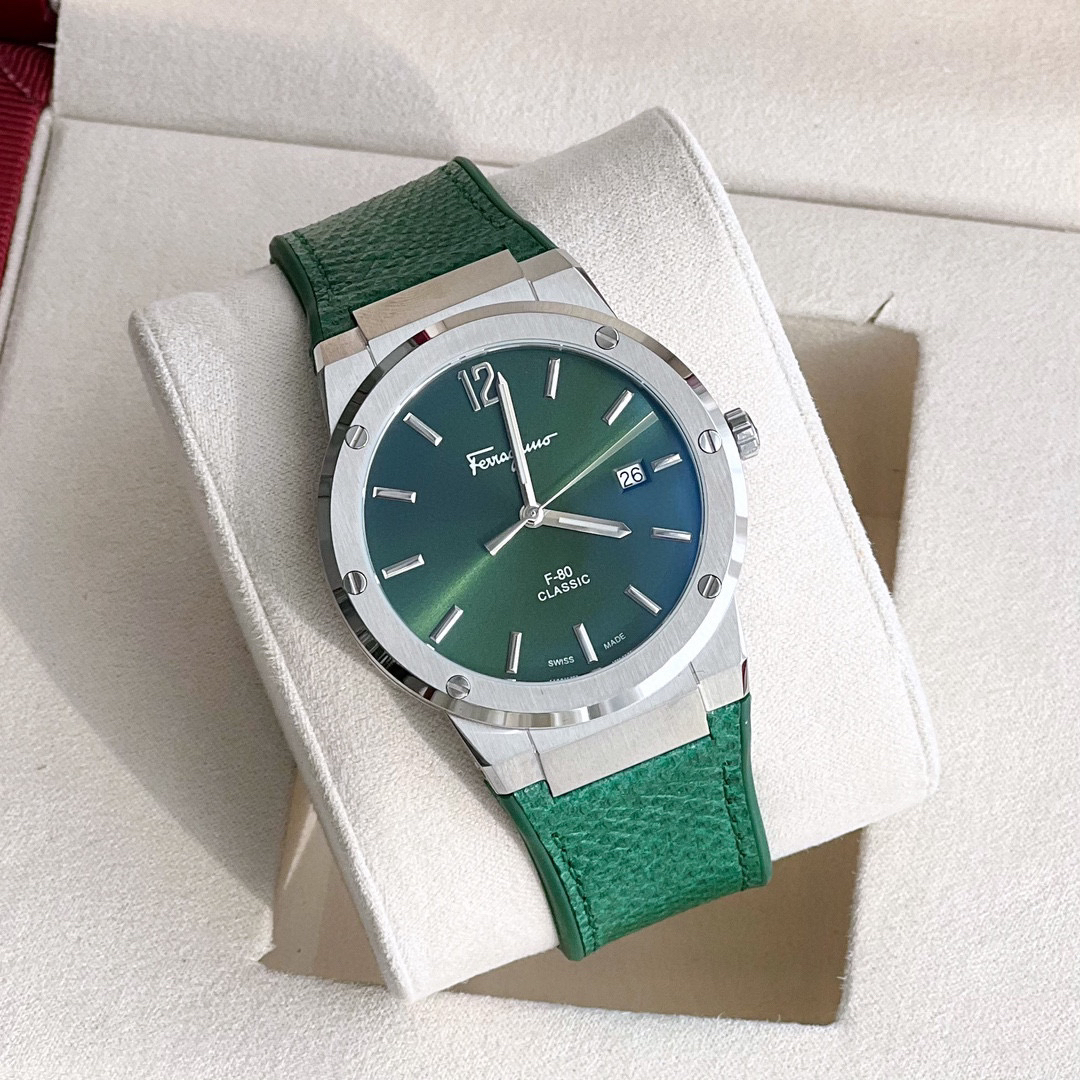 新款首发!外贸出口订单,Ferragmo F-80 Slim系列,简约优雅时尚男表;表径:41mm,采用纤薄的表壳,运动的气质;鳄鱼纹蛇纹小牛皮搭配橡胶表带,运动与优雅联合,彰显匠心精工品质,防水防汗佩戴舒适;简约太阳纹盘面,经典大气三针设计,立体时标Logo增添视觉层次感,硬朗螺钉精钢表壳,拉丝工艺,搭配齿轮F浮雕表冠,突显现代都市型男格调;底盖镌刻Ferragamo总部斯皮尼图案。蓝宝石水晶镜面;瑞士石英机芯,性能稳定,走时精准,50米防水,配原盒包装一手好价!