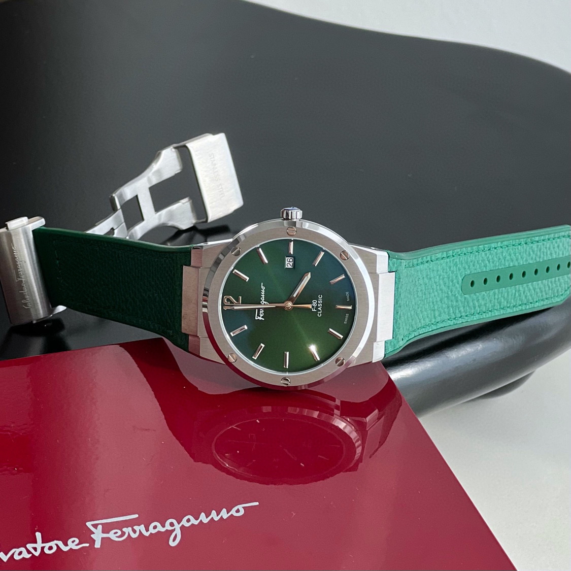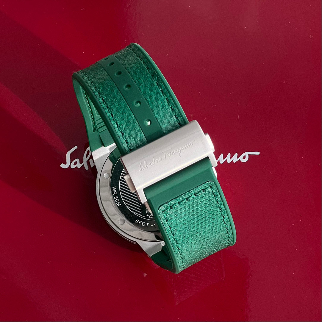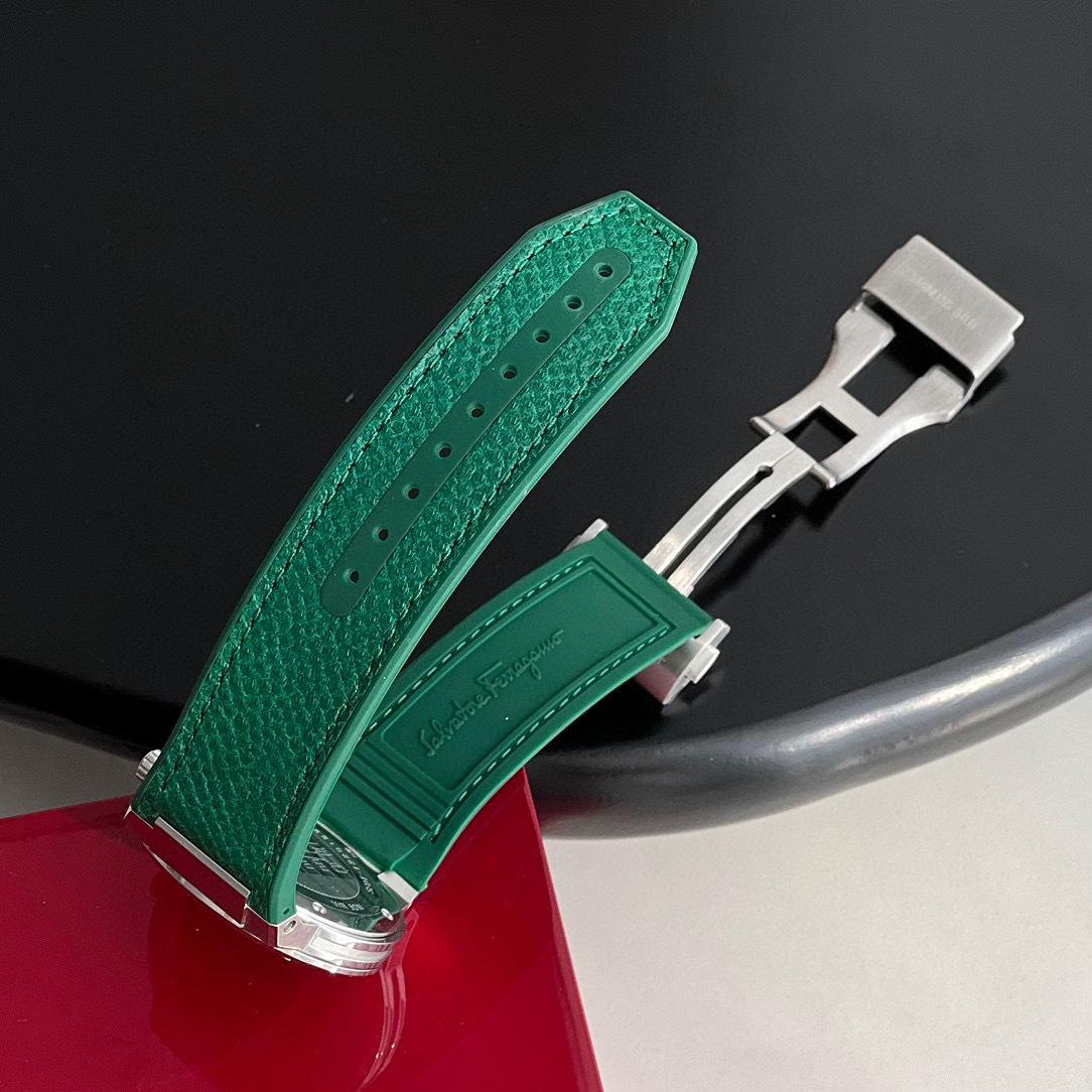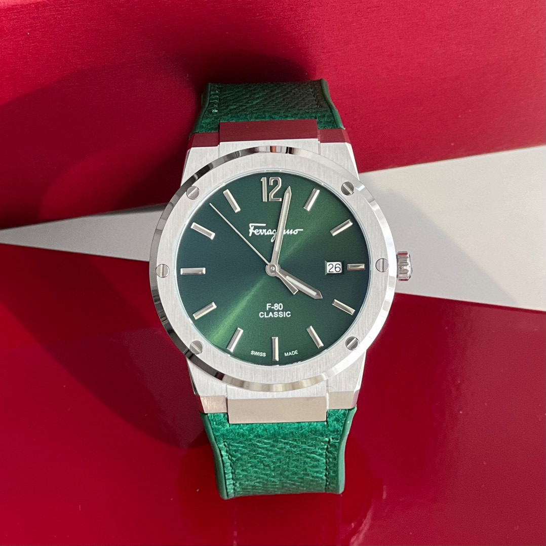 新款首发!外贸出口订单,Ferragmo F-80 Slim系列,简约优雅时尚男表;表径:41mm,采用纤薄的表壳,运动的气质;鳄鱼纹蛇纹小牛皮搭配橡胶表带,运动与优雅联合,彰显匠心精工品质,防水防汗佩戴舒适;简约太阳纹盘面,经典大气三针设计,立体时标Logo增添视觉层次感,硬朗螺钉精钢表壳,拉丝工艺,搭配齿轮F浮雕表冠,突显现代都市型男格调;底盖镌刻Ferragamo总部斯皮尼图案。蓝宝石水晶镜面;瑞士石英机芯,性能稳定,走时精准,50米防水,配原盒包装一手好价!
