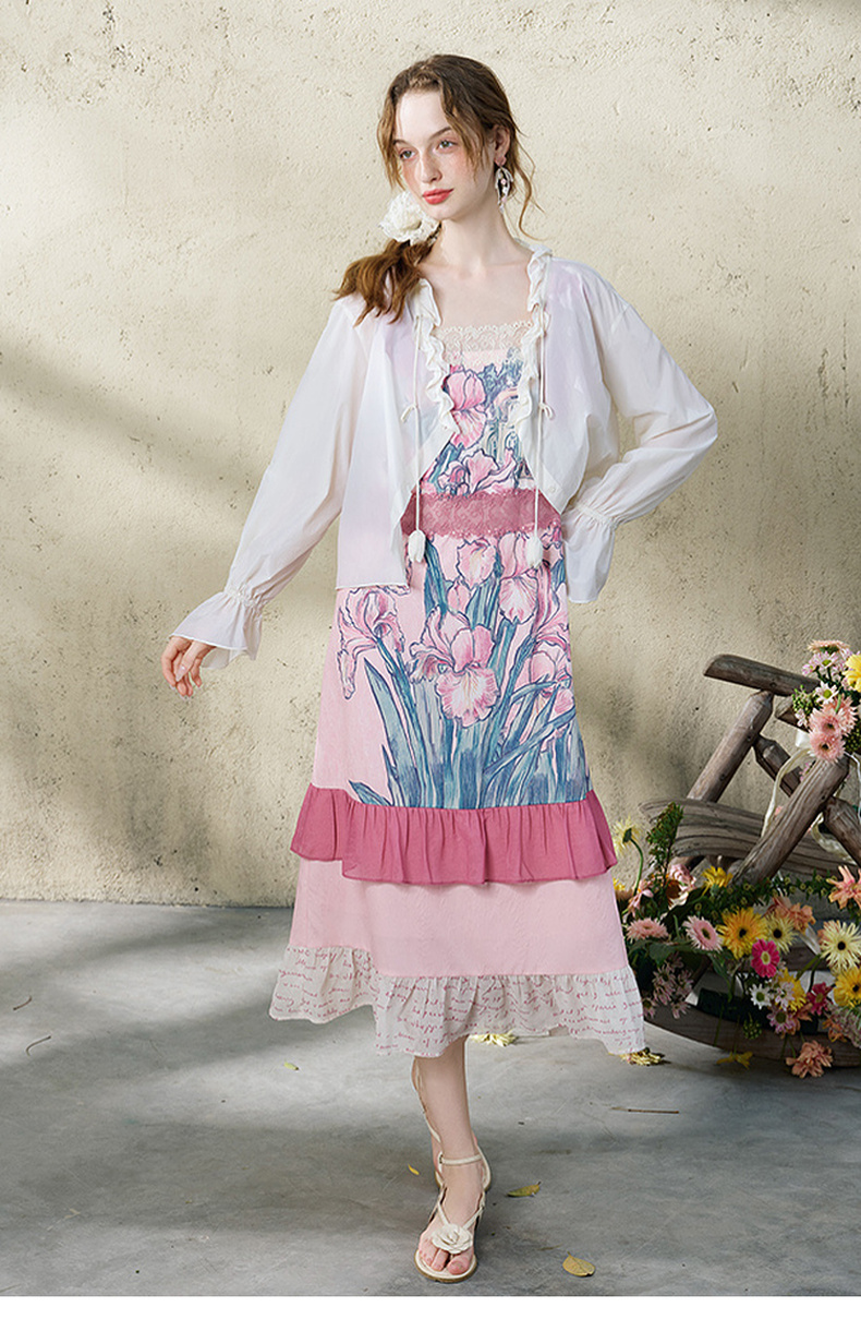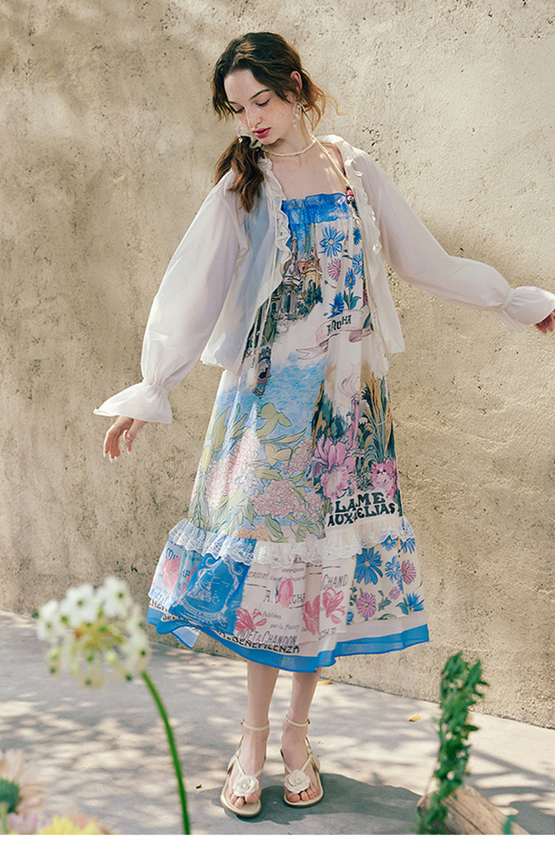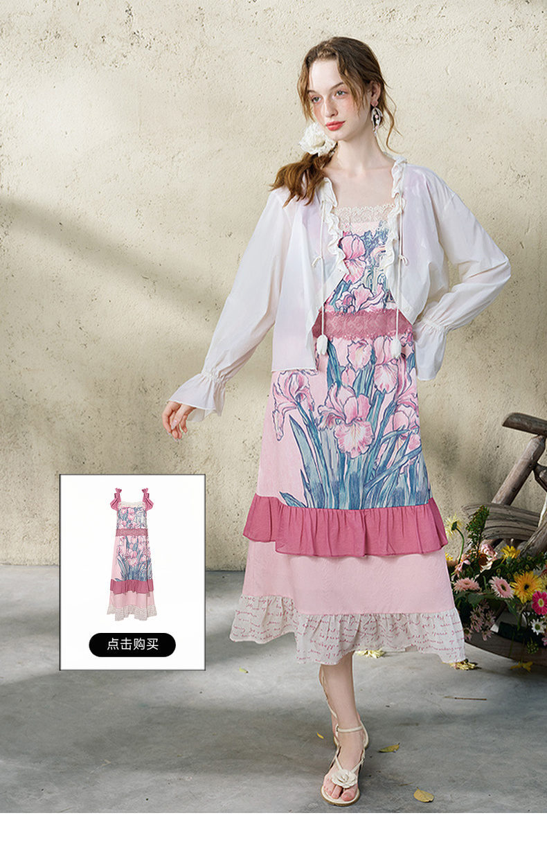 两三事梵高文艺 花屿捕梦 2025夏季新款拼布印花荷叶边吊带连衣裙
