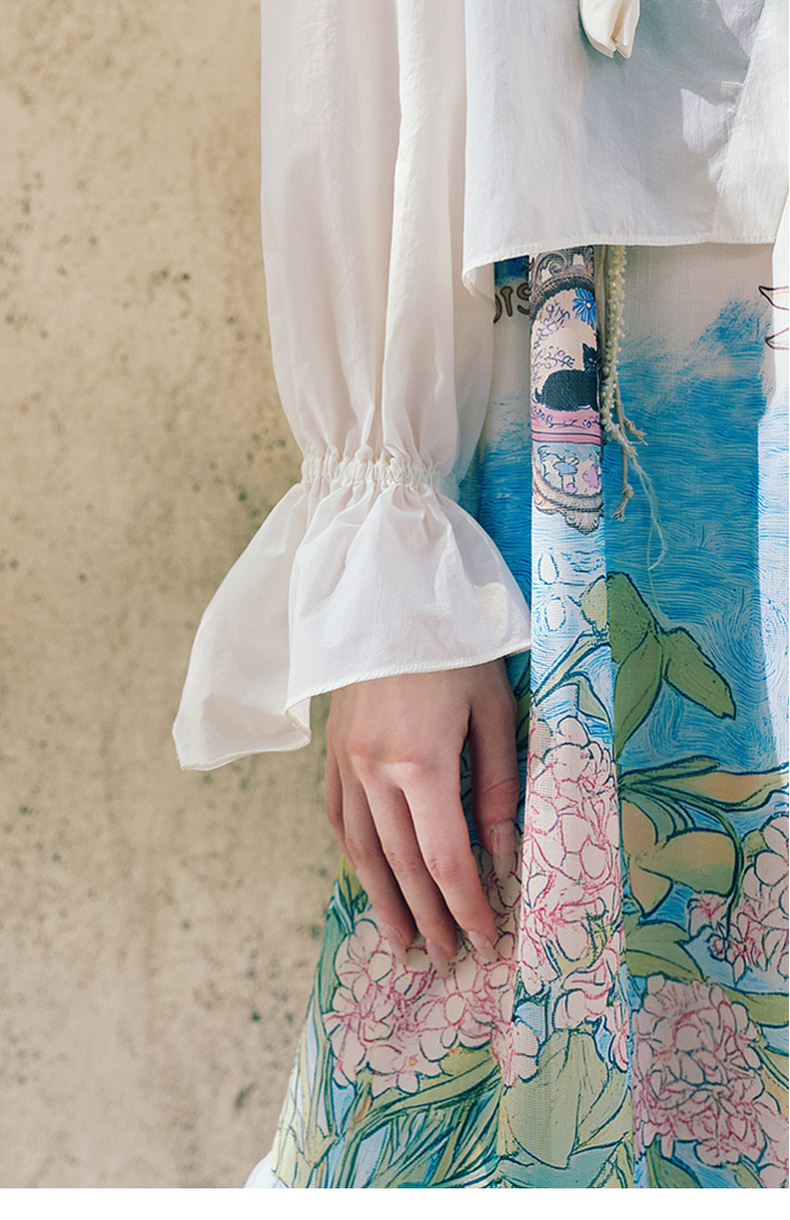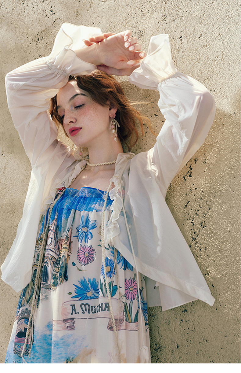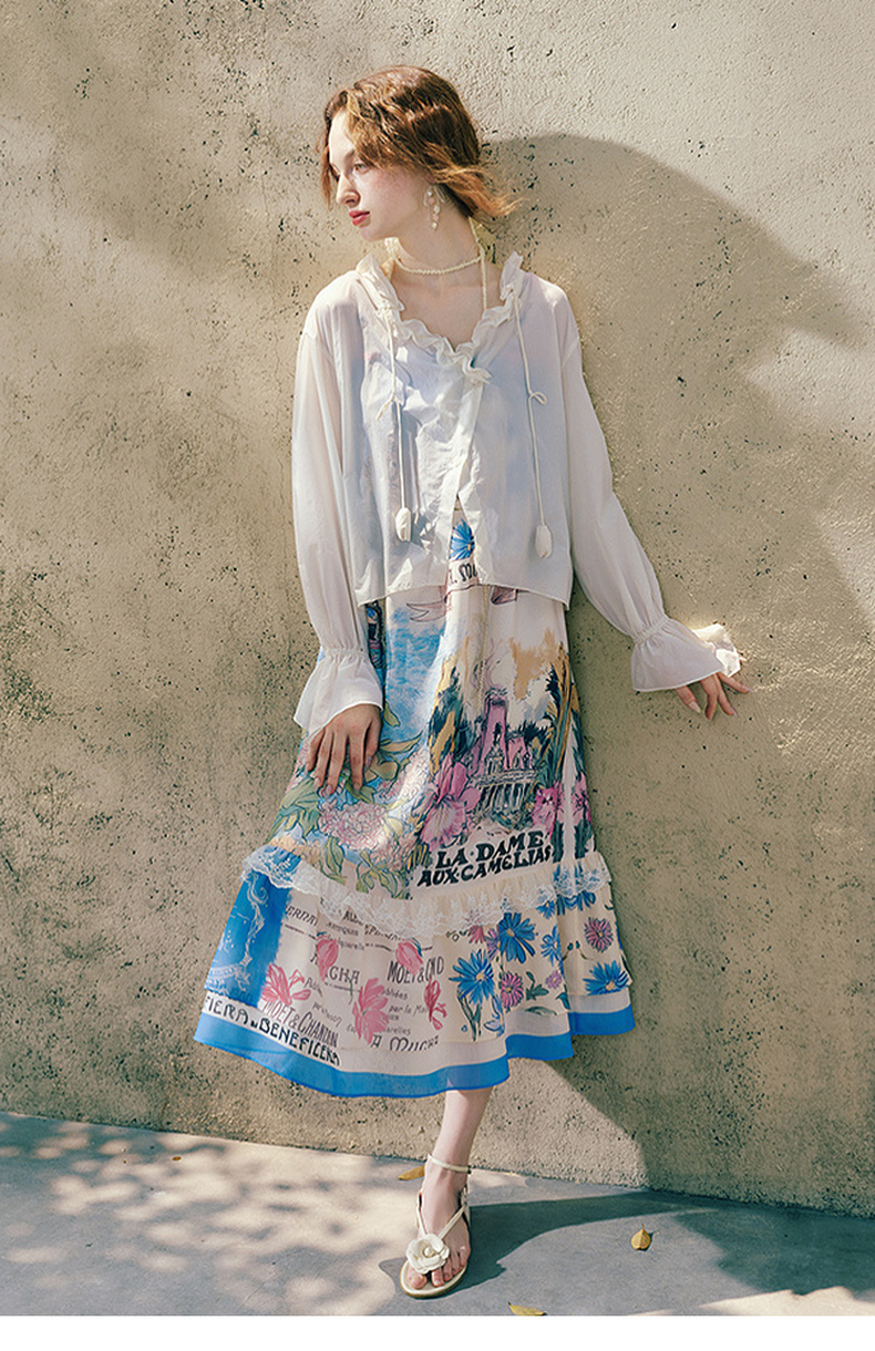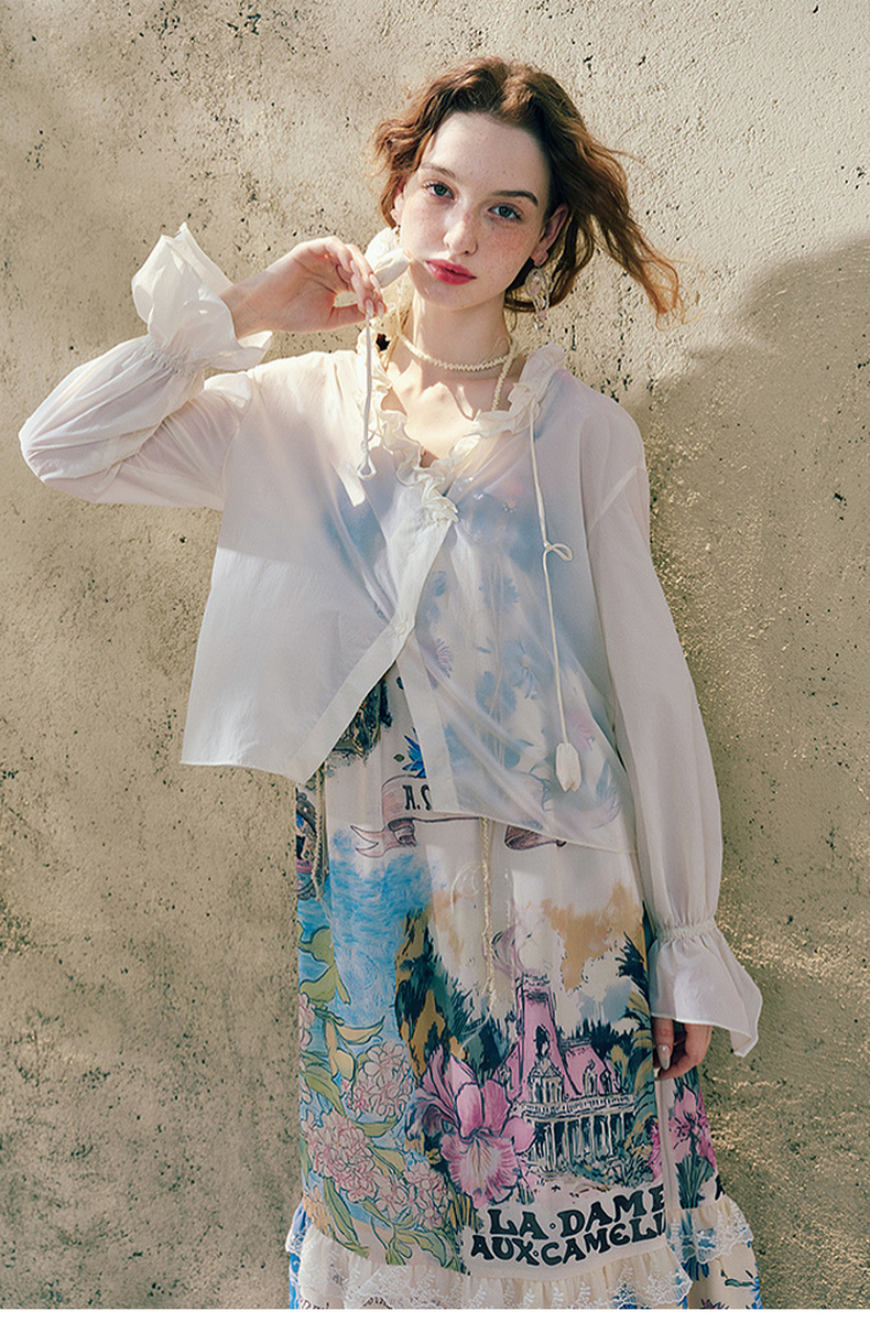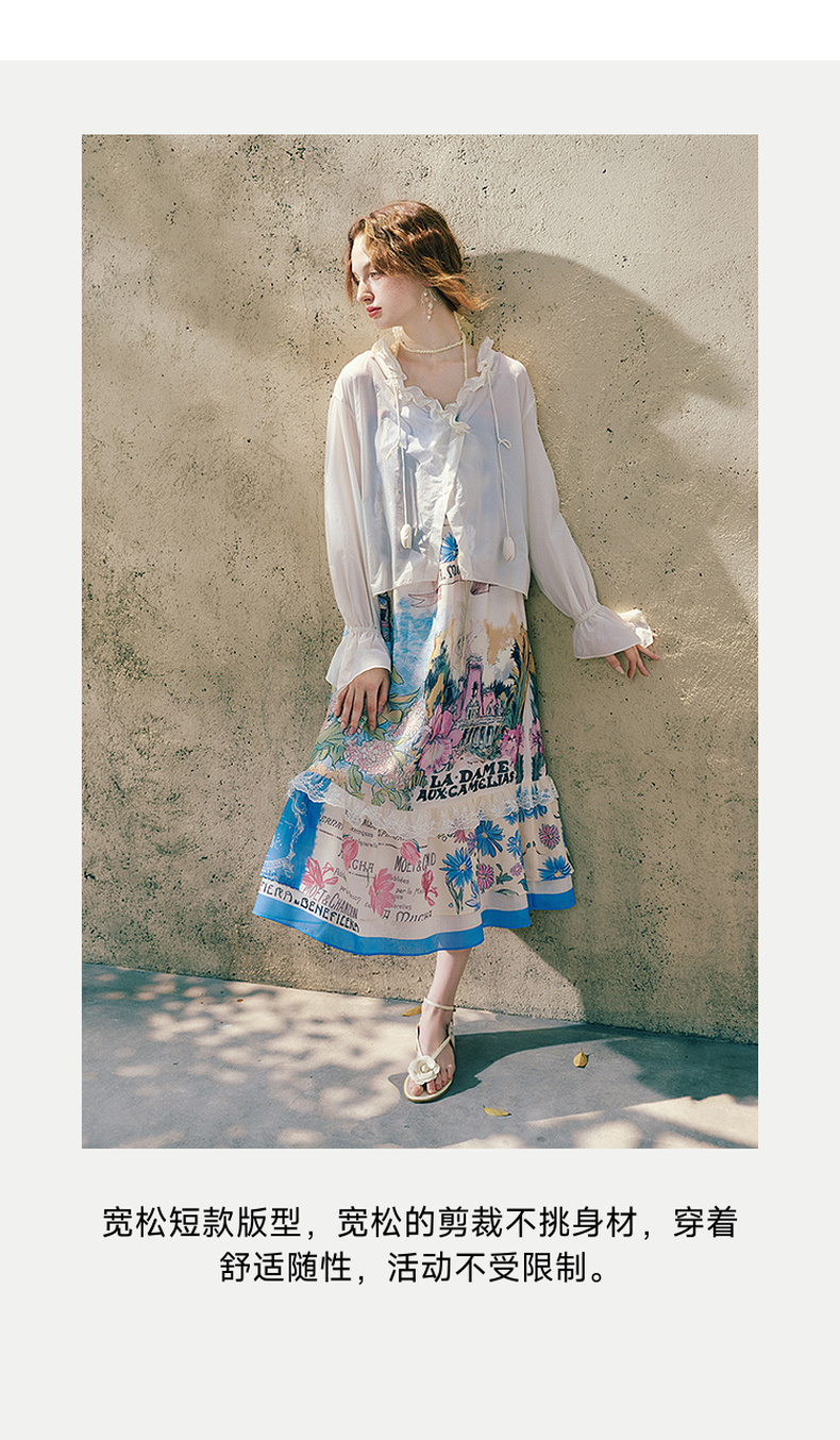 两三事 蜜夏神谕 2025春季新款文艺风蝴蝶结大翻领印花衬衫女宽松
