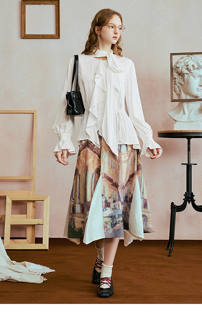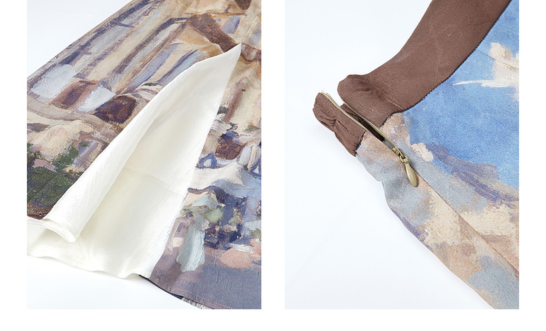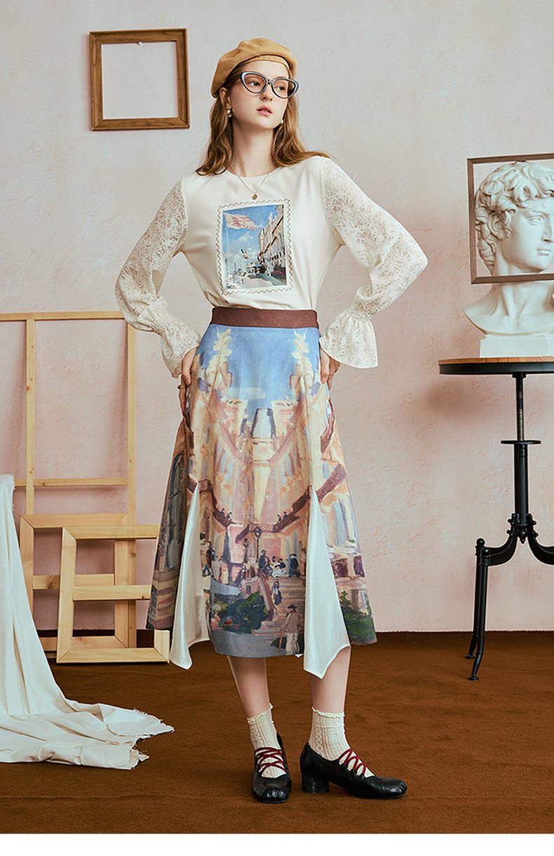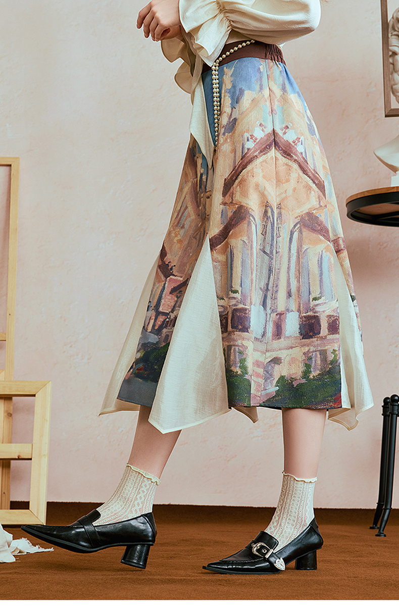 两三事 旧巷夕阳 2025秋季新款法式印花拼布不规则高腰半身裙