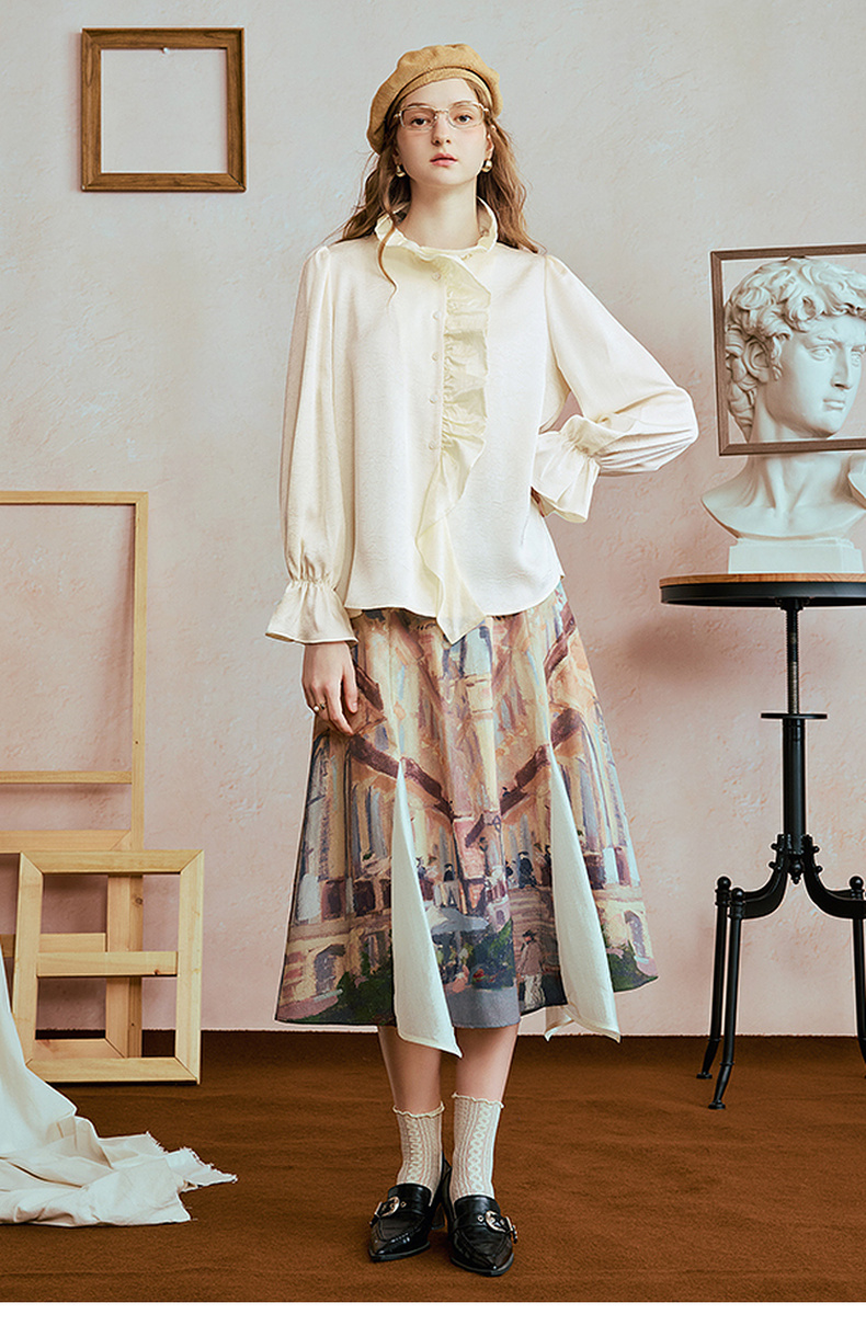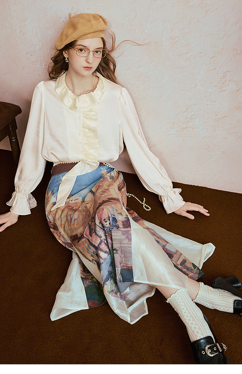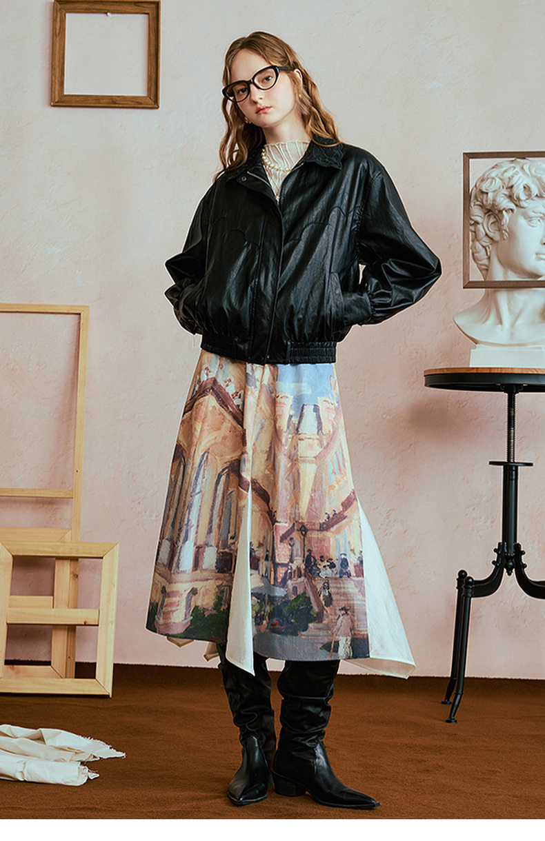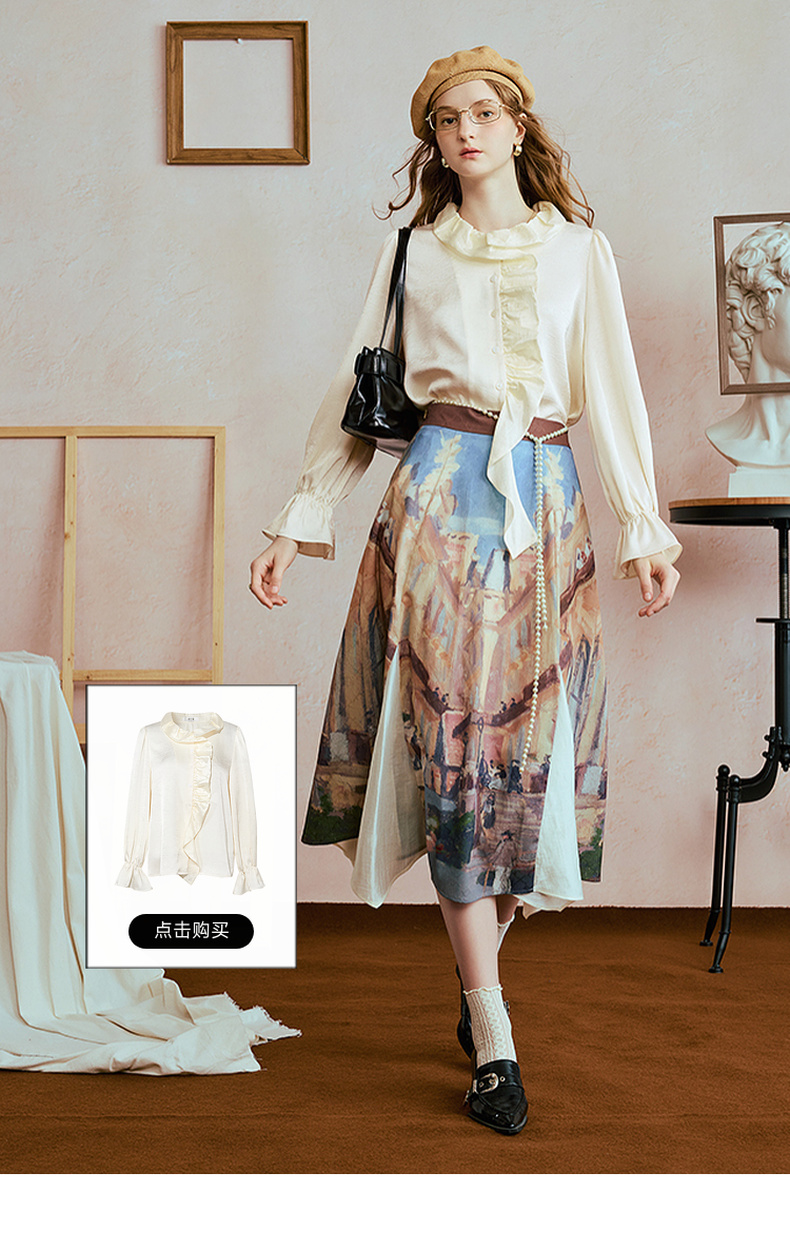 两三事 旧巷夕阳 2025秋季新款法式印花拼布不规则高腰半身裙