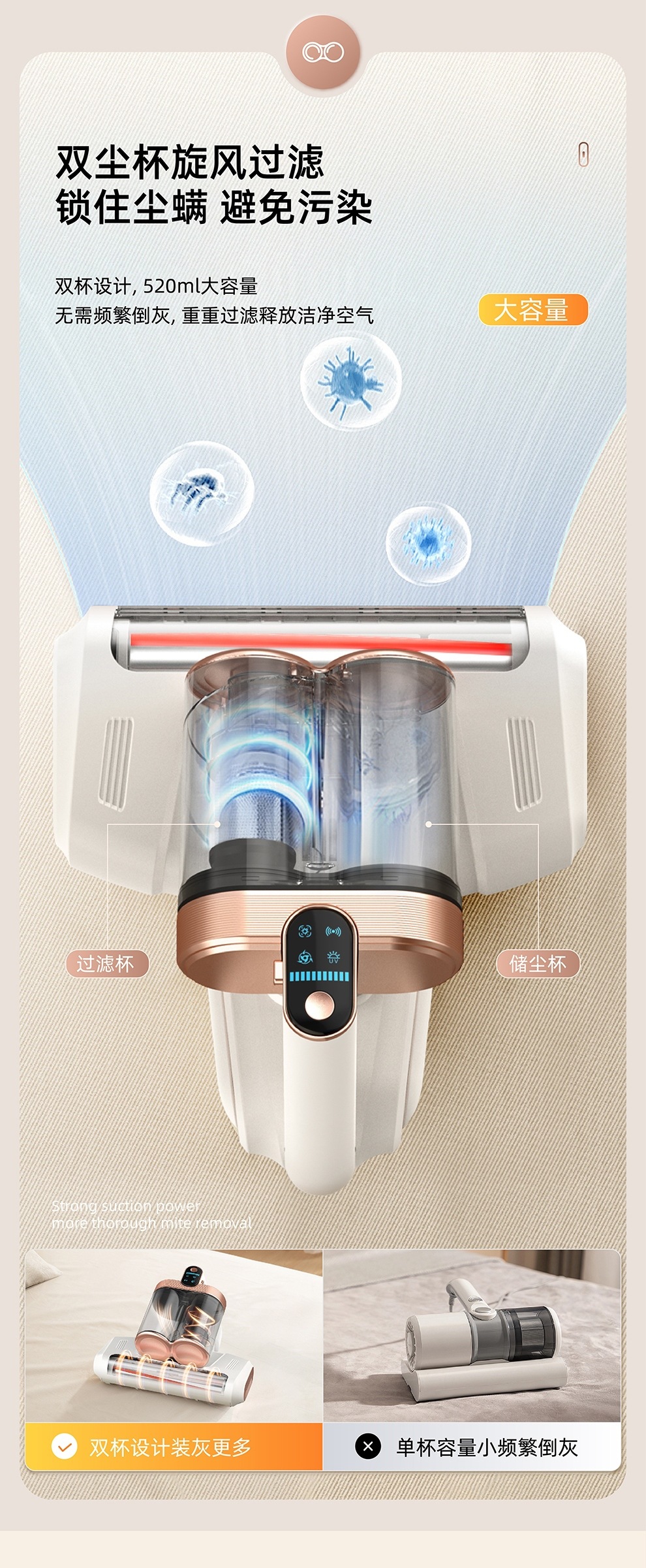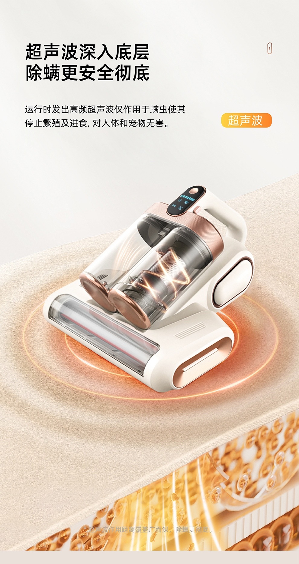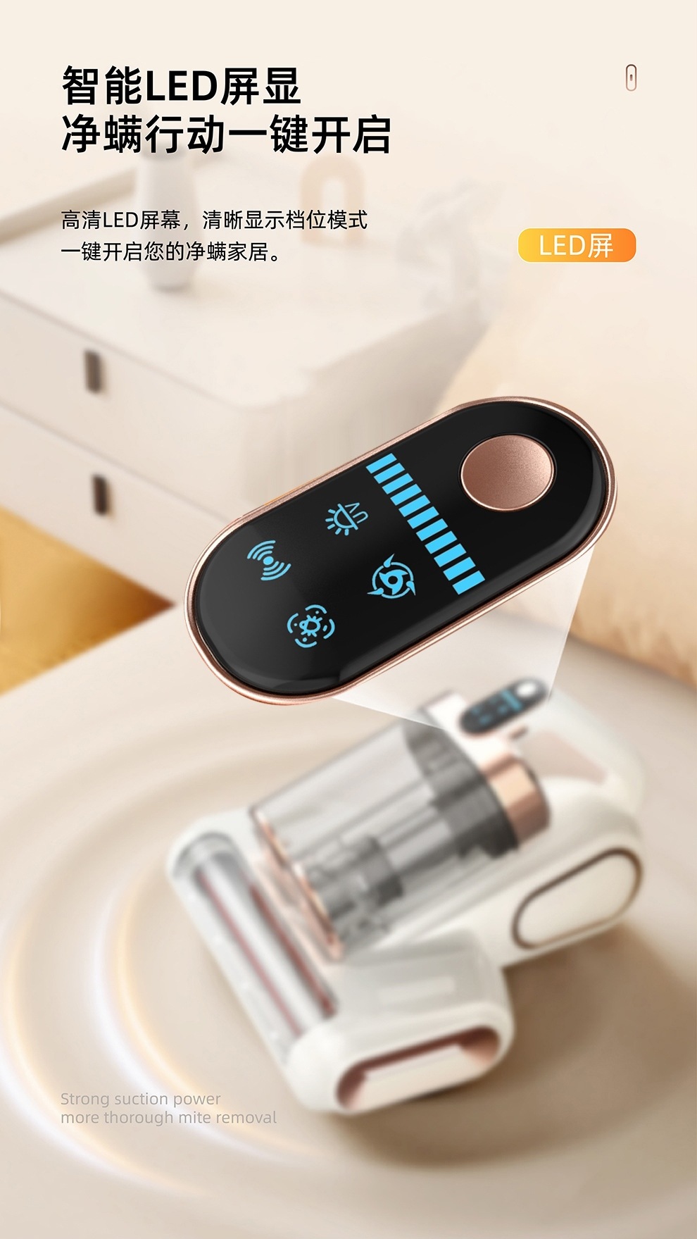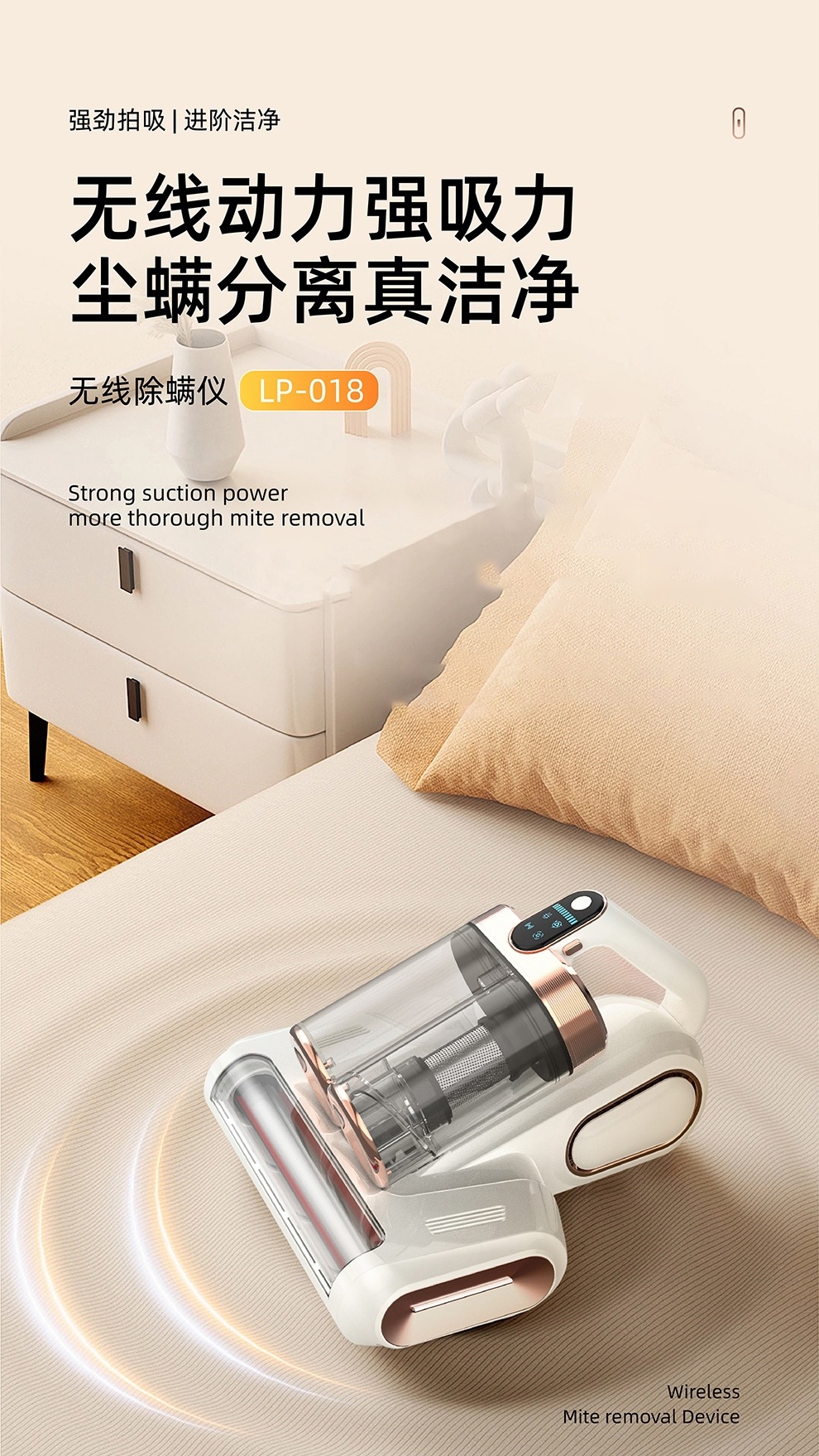 【净螨新科技】LED显示无线除螨仪 大吸力家用床上吸尘器 双尘杯滚刷拍打紫光杀菌机 除螨机