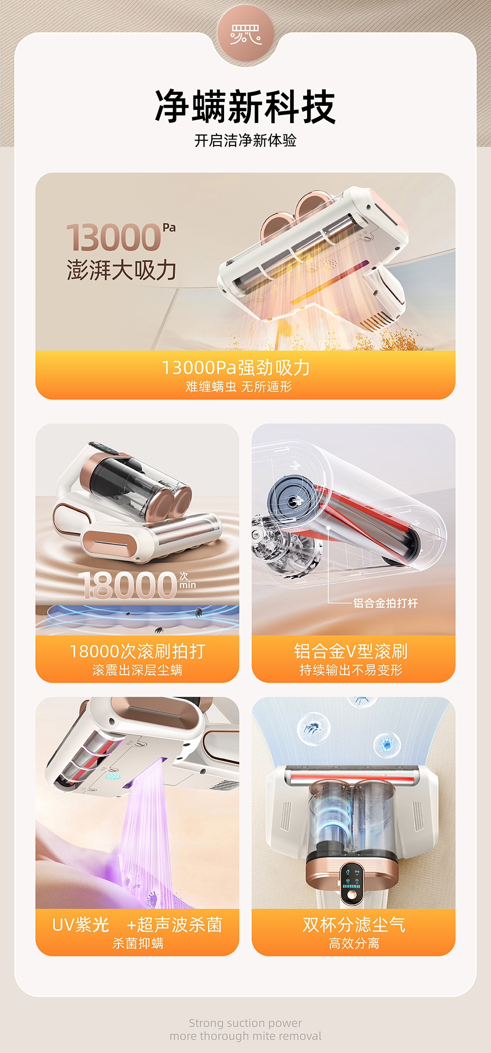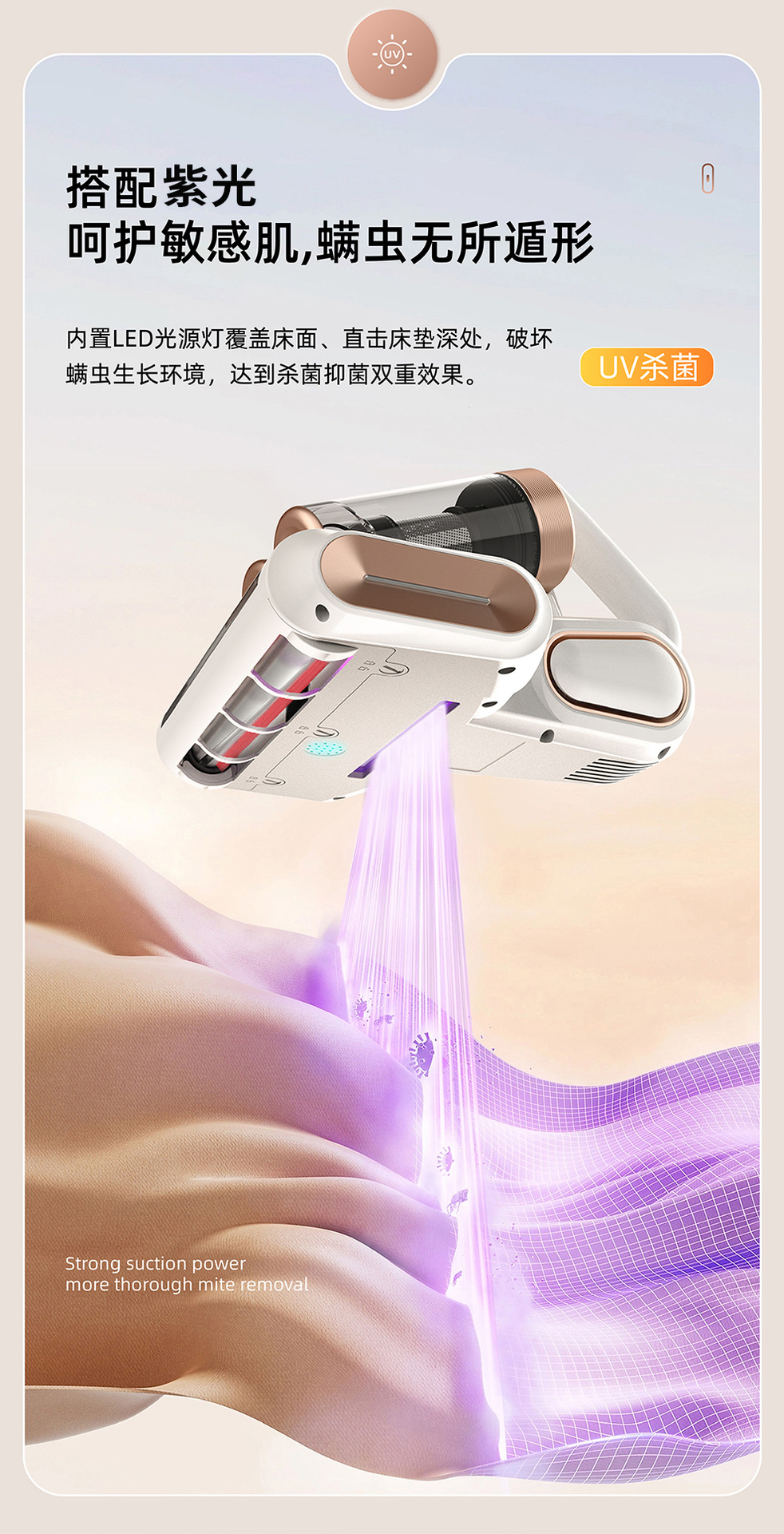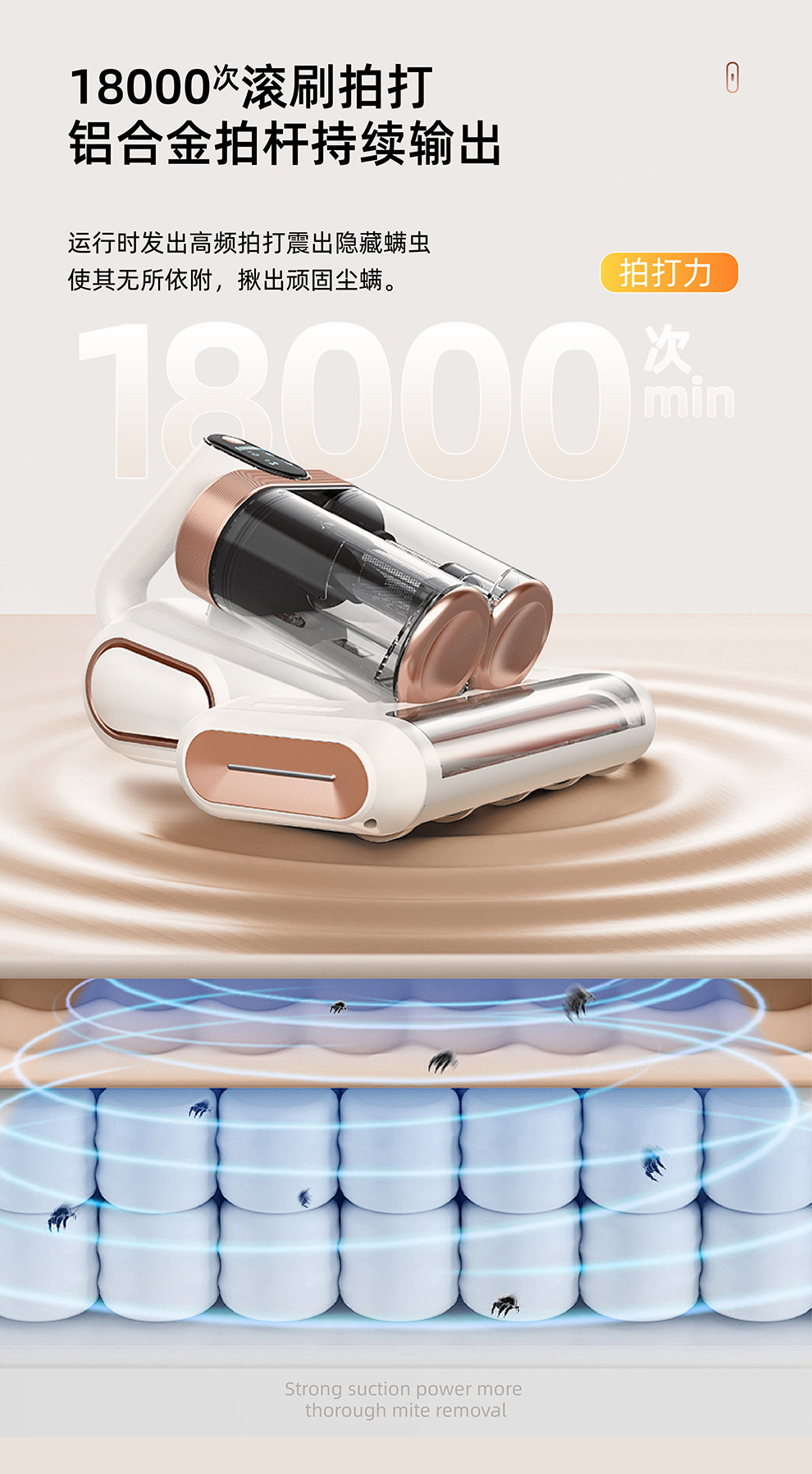 【净螨新科技】LED显示无线除螨仪 大吸力家用床上吸尘器 双尘杯滚刷拍打紫光杀菌机 除螨机