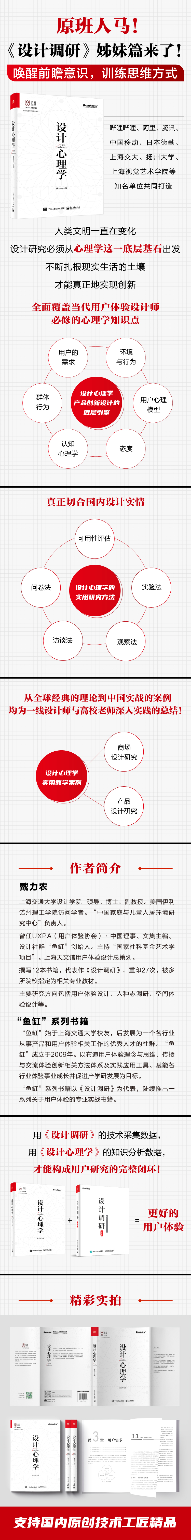 设计将极大地关注人与人、人与物,以及人与社会的连接,要想设计出好产品,必须学习设计心理学。本书详细地介绍了设计师需要了解的心理学知识,包括用户的需求、群体行为、个体行为、认知心理学与交互设计、态度、用户心理模型、环境与行为等,从各个方面帮助设计师了解人们的认知规律、深层需求、内在动机,从而创新设计。本书还介绍了设计心理学的实用研究方法,包括观察法、访谈法、实验法、问卷法和可用性评估。*后,本书提供了两个不同设计方向的教学案例,介绍如何在设计中通过设计心理学的方法辅助设计。设计心理学可以帮助设计师理解用户需求,利用心理学原理引导用户,也是设计调研的知识基础。本书可以作为高等教育设计学科的专业教材,也可以作为各类设计专业的从业人员的参考书。