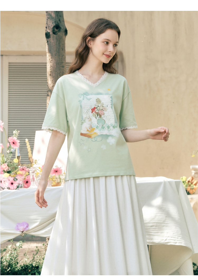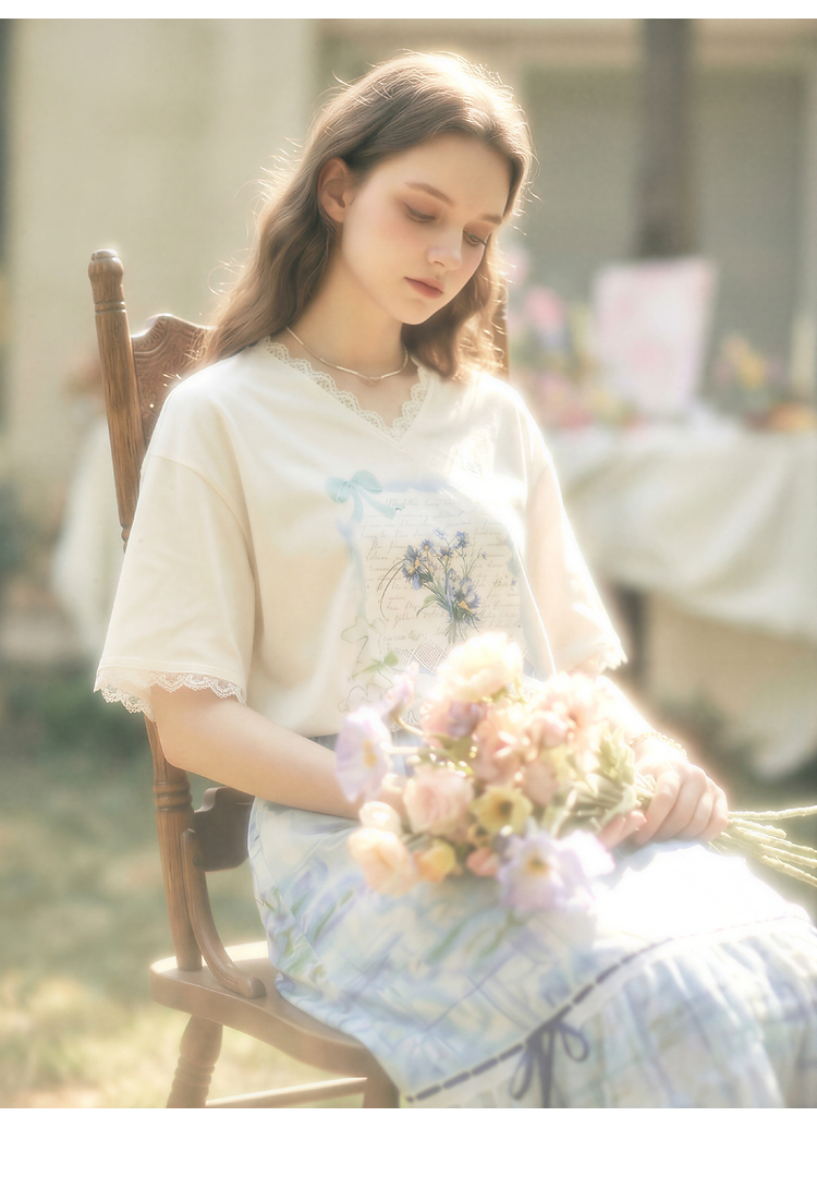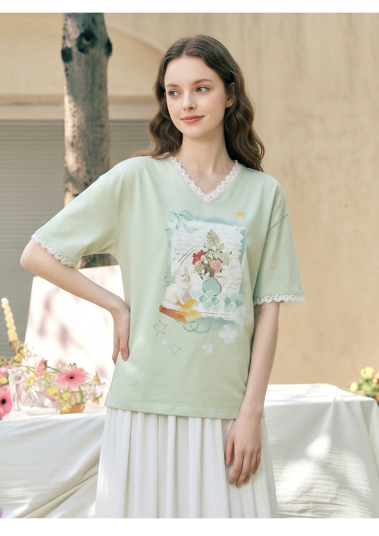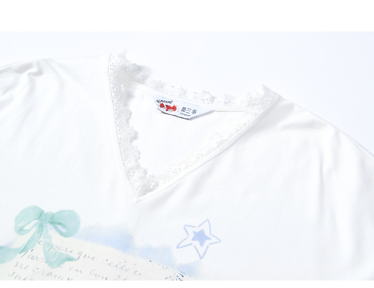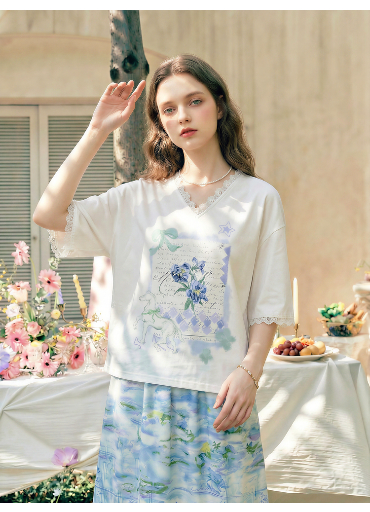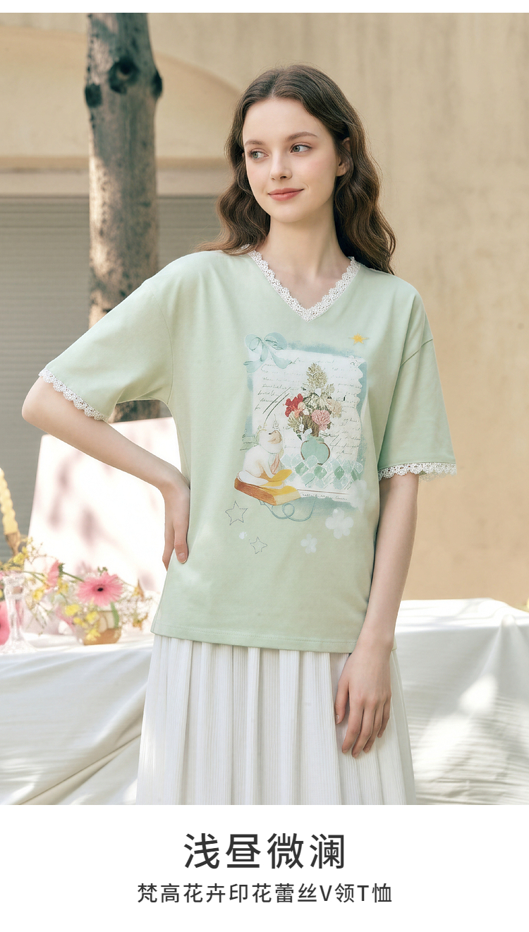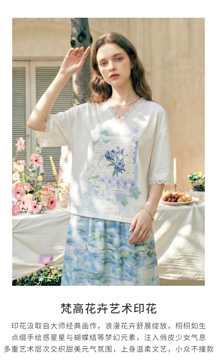 两三事梵高文艺浅昼微澜2026夏季新款小清新印花蕾丝拼接棉t恤女