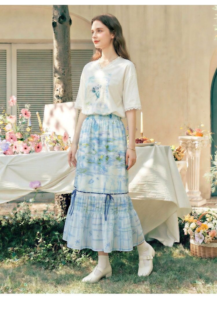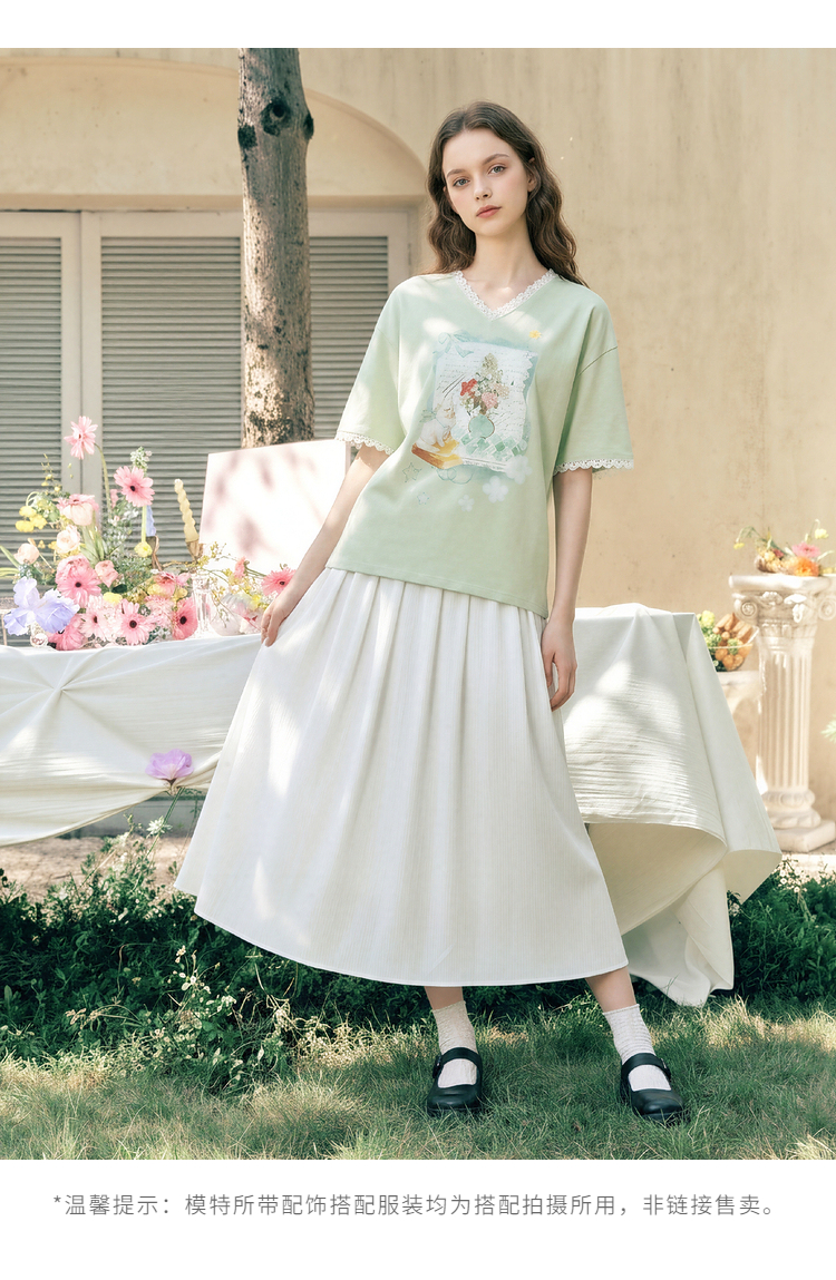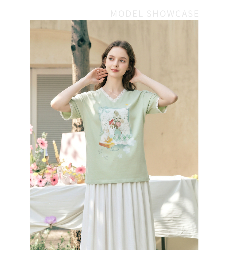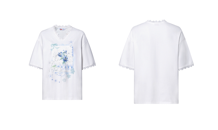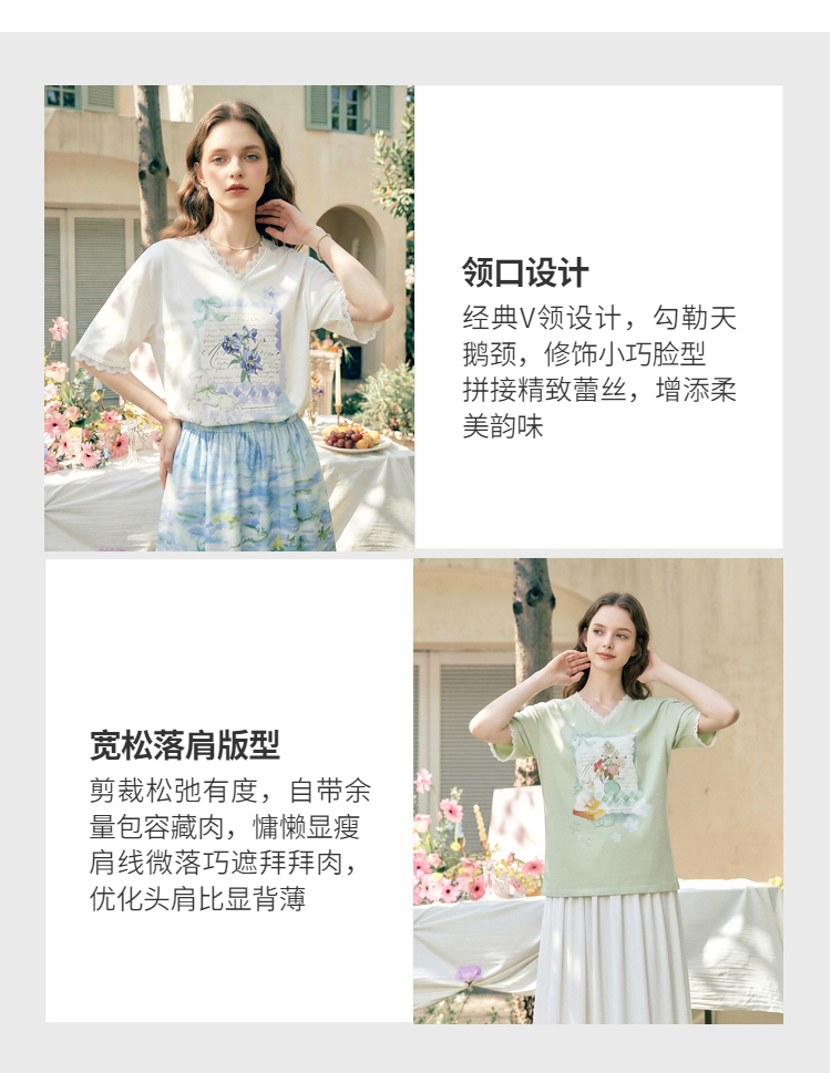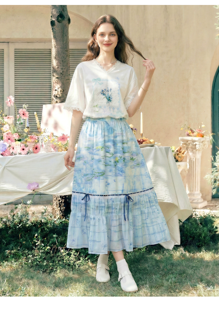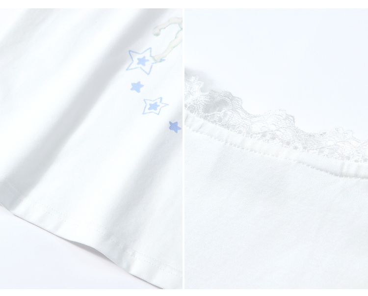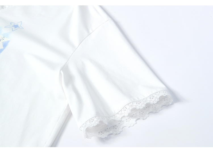 两三事梵高文艺浅昼微澜2026夏季新款小清新印花蕾丝拼接棉t恤女
