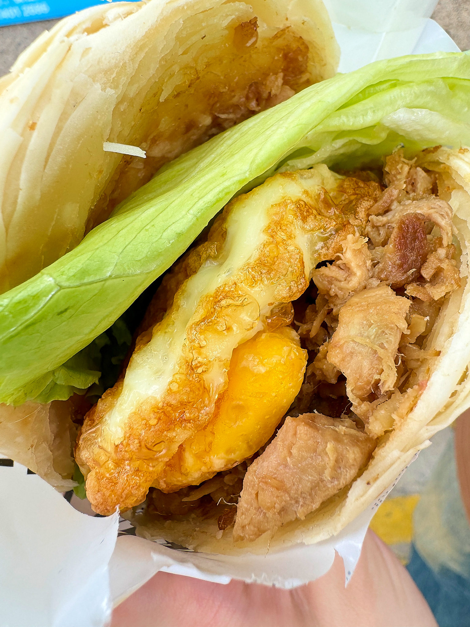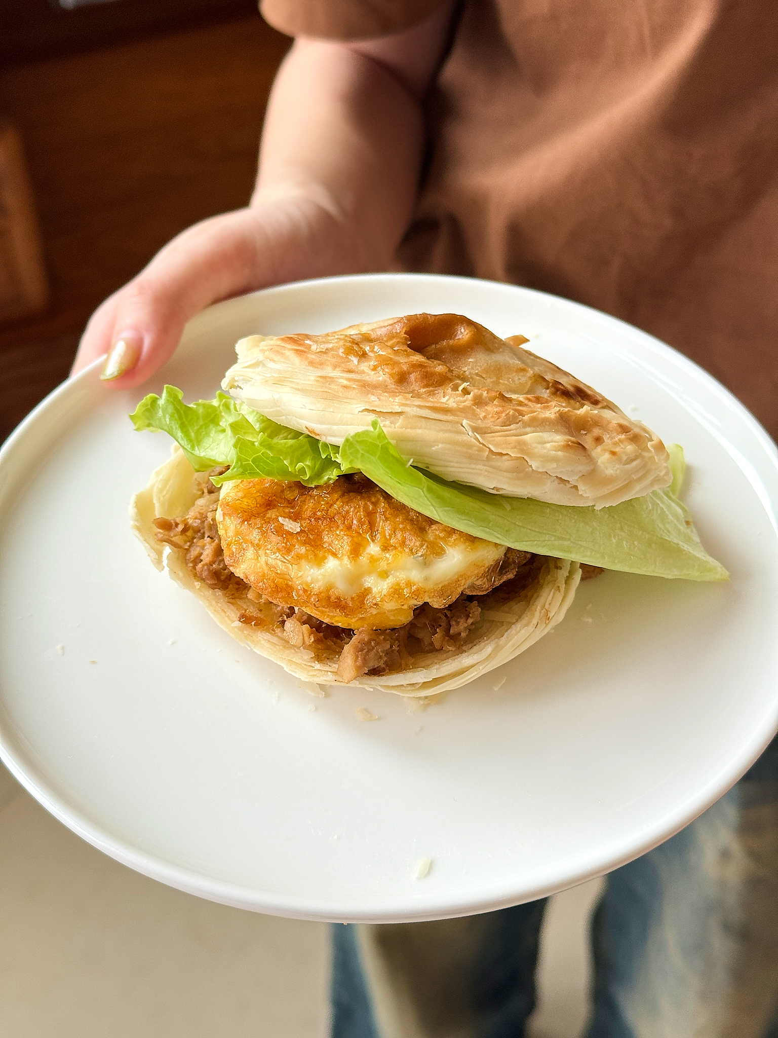 5.解冻状态,平底锅喷少许油,烙至肉馅热透、饼皮两面金黄酥脆即可。