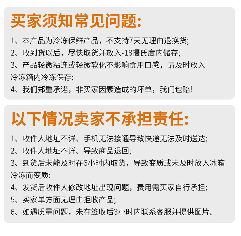 5.冷冻产品请及时签收,签收之后请冷冻保存。如因个人原因造成的快递滞留和保存不当导致货物变质不在售后范围之内。