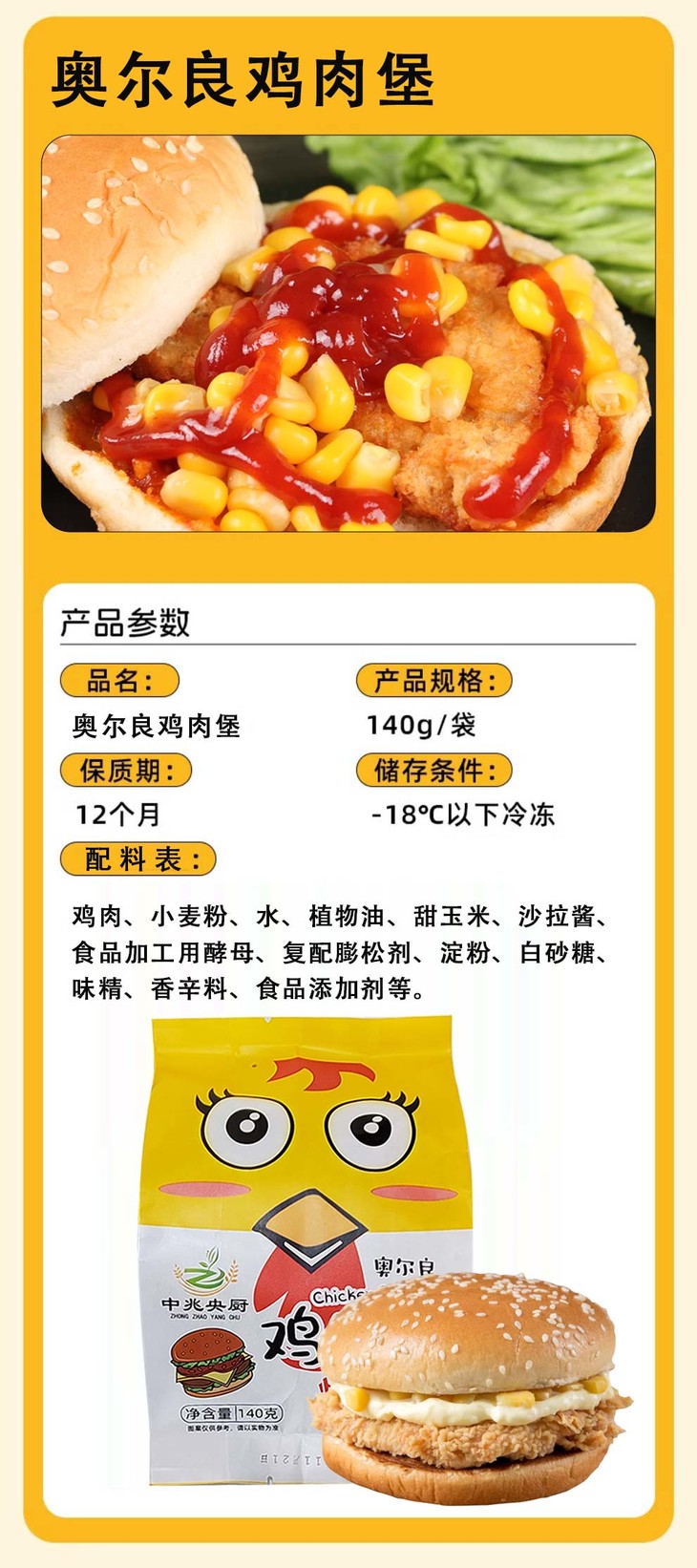 【会员专享】中兆央厨奥尔良鸡肉堡 140g/袋 60袋/件