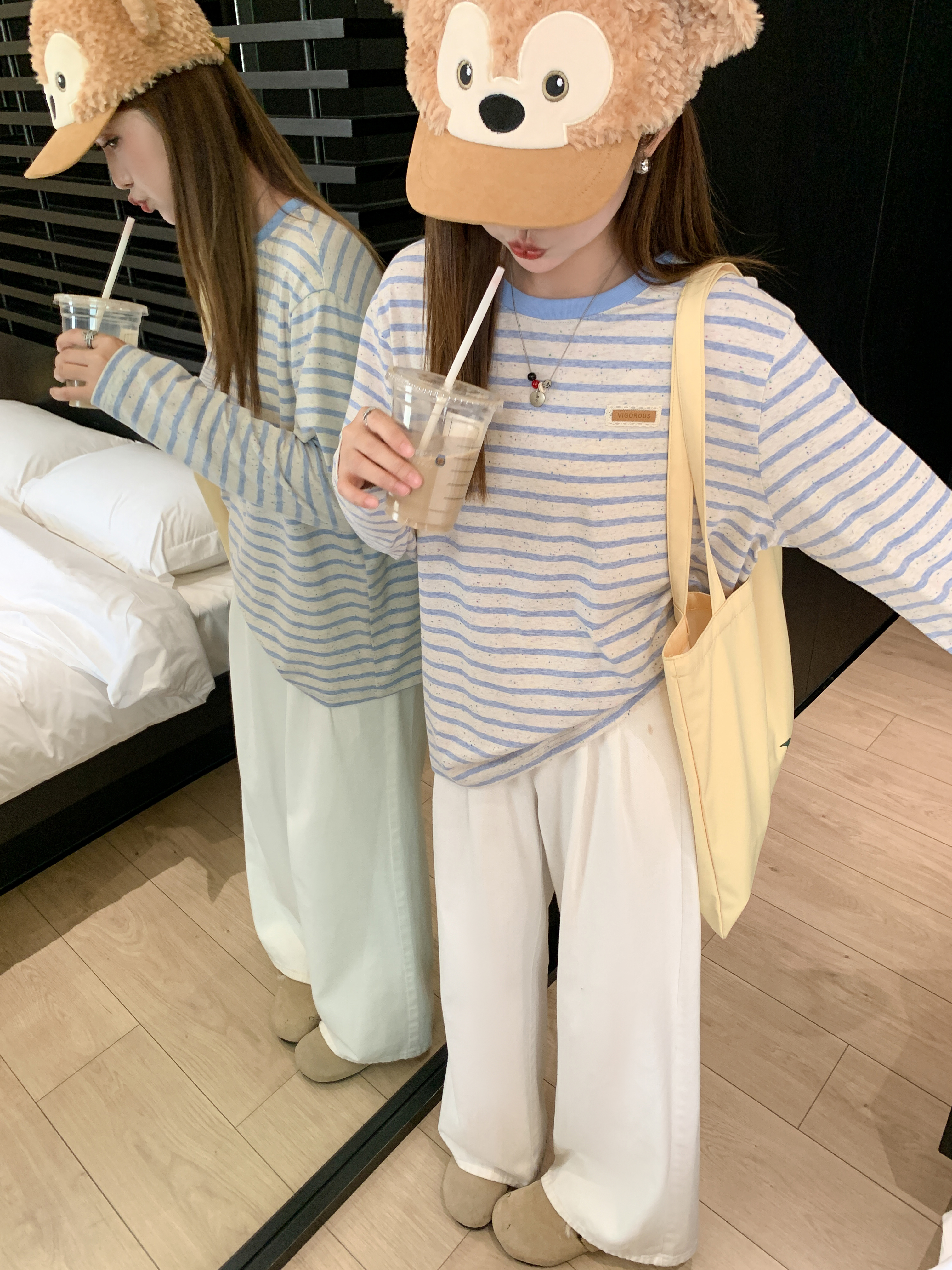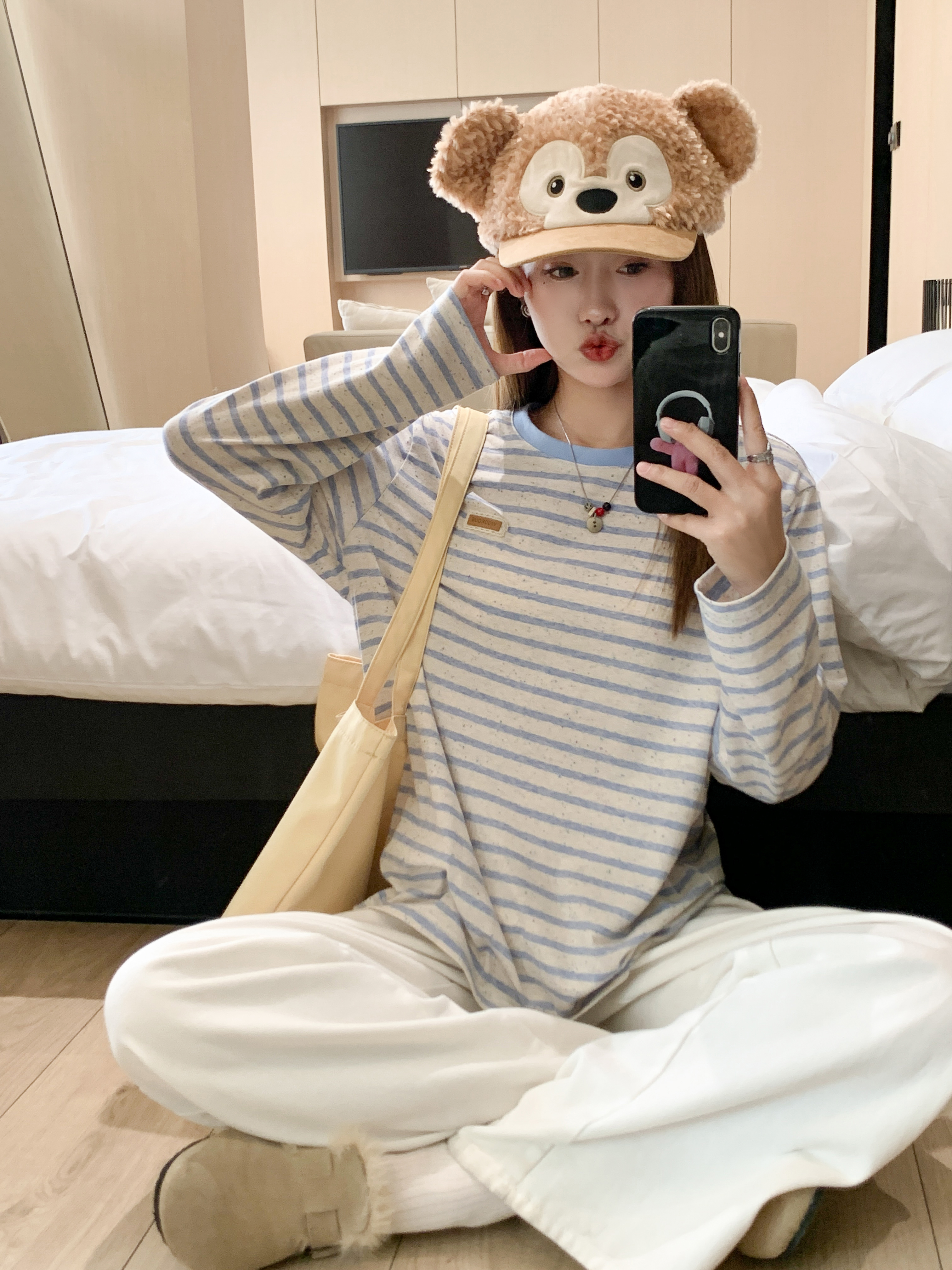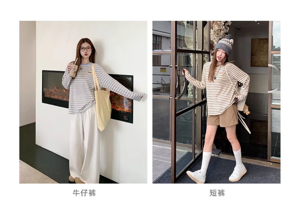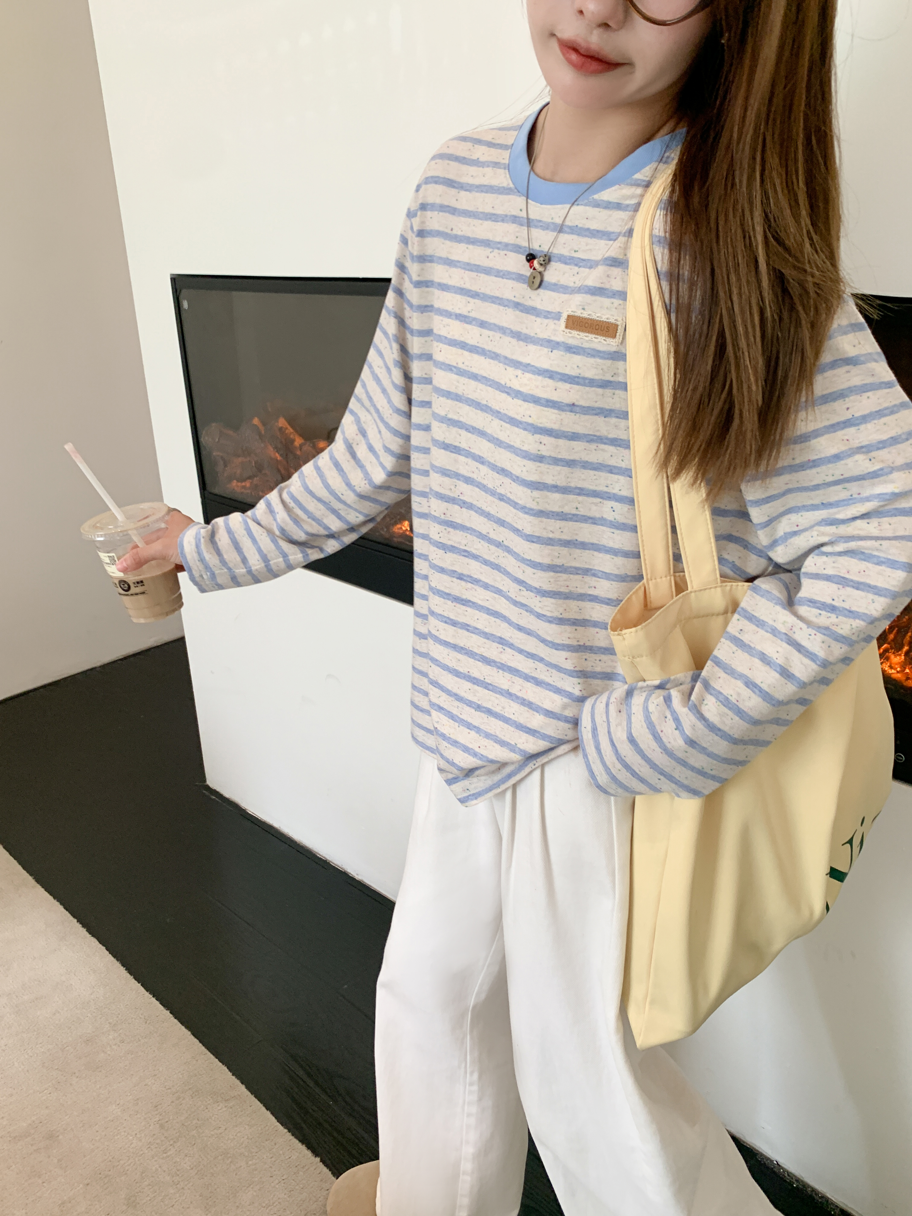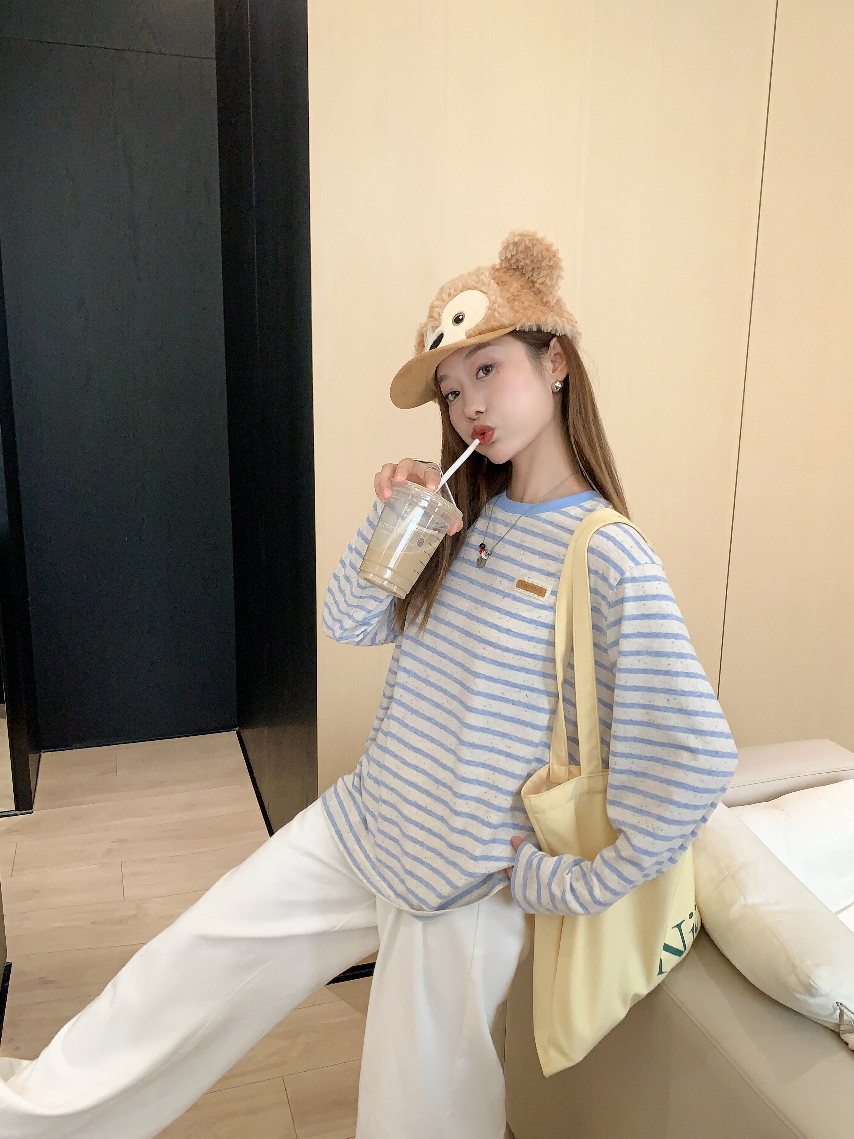 <曾小咸推荐>韩版百搭长袖圆领条纹T恤女秋冬气质温柔宽松显瘦内搭上衣