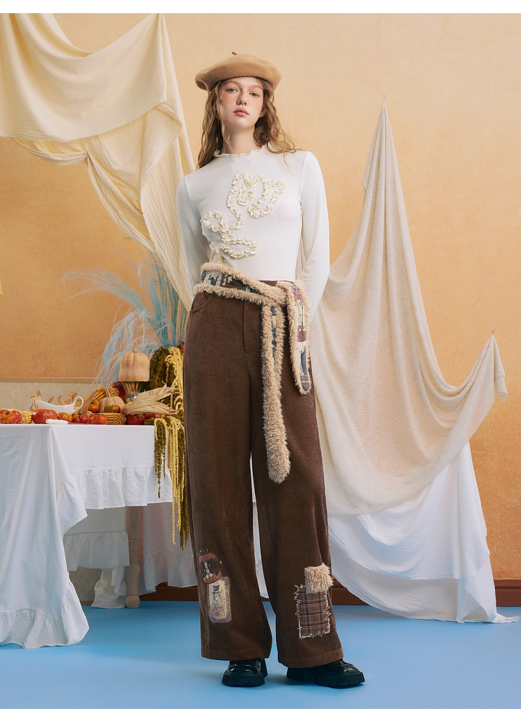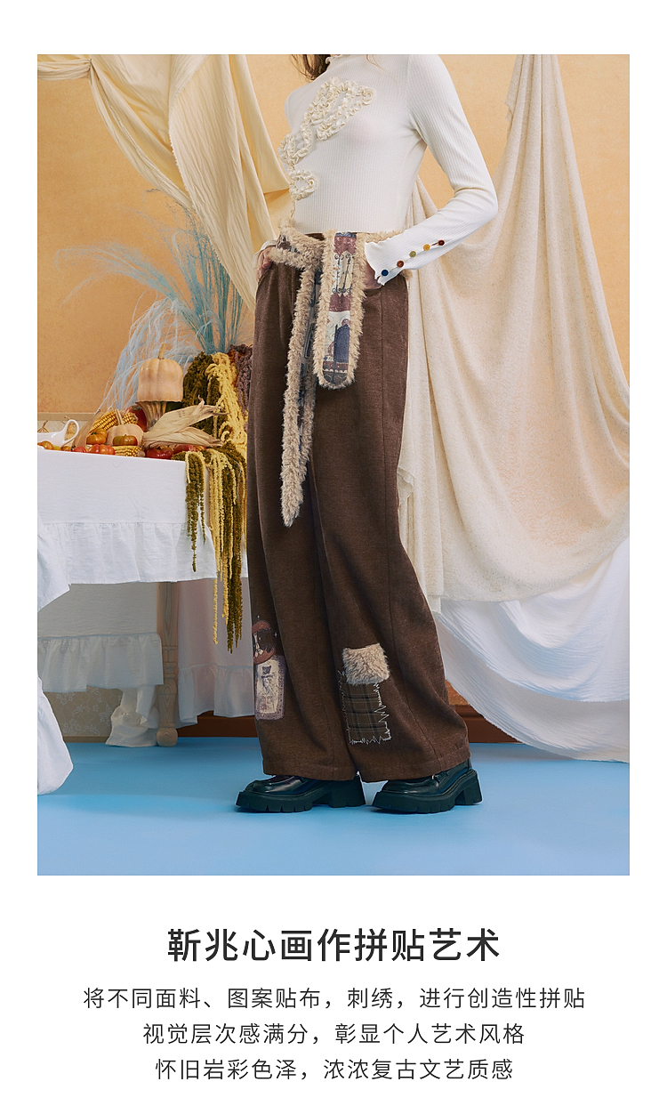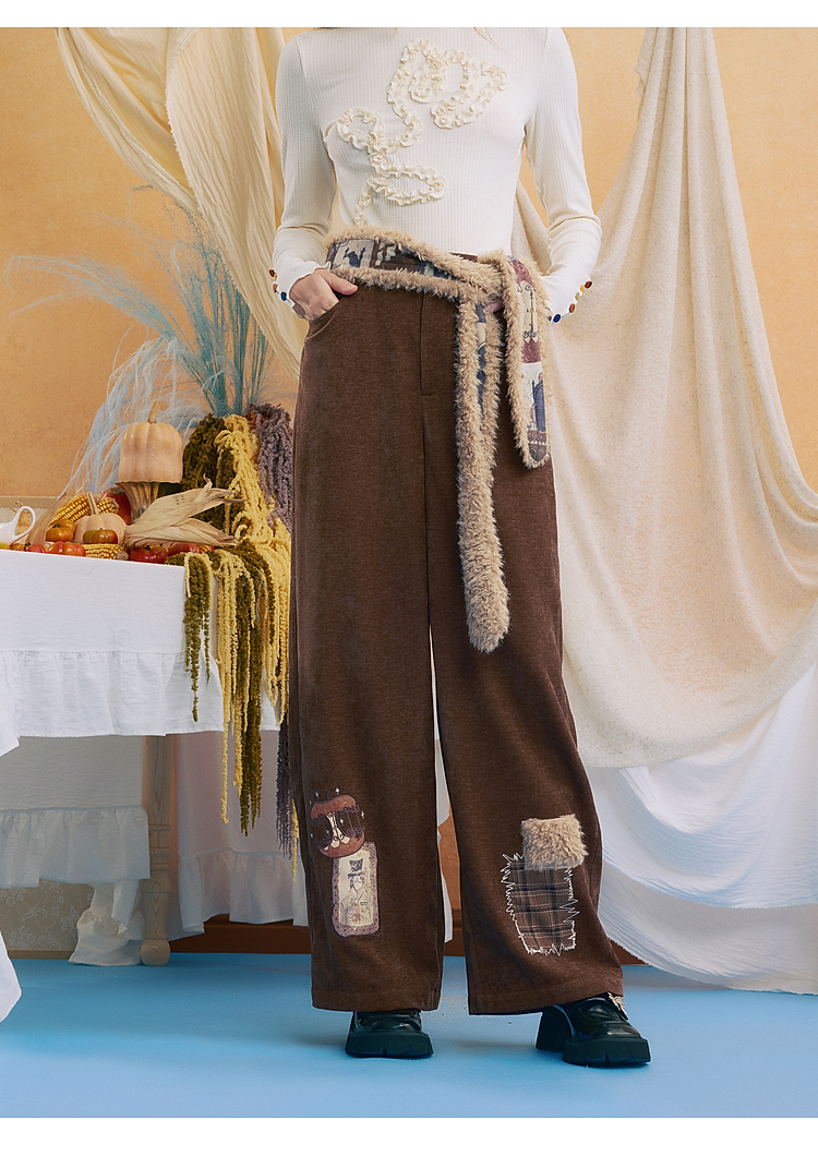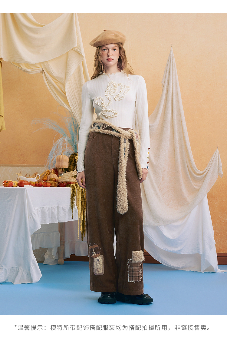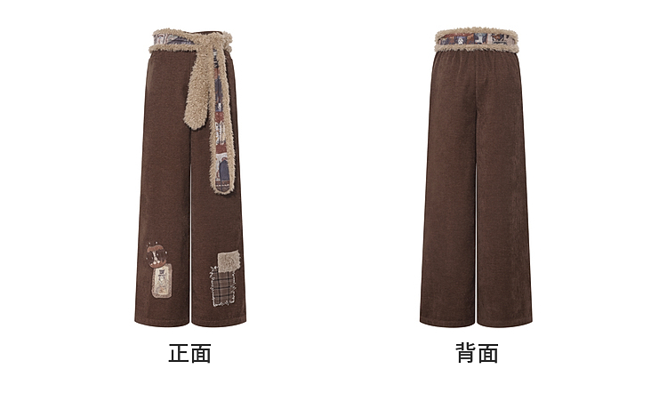 两三事可可漫旅2025冬季新款贴布刺绣毛绒腰带雪尼尔阔腿休闲裤女