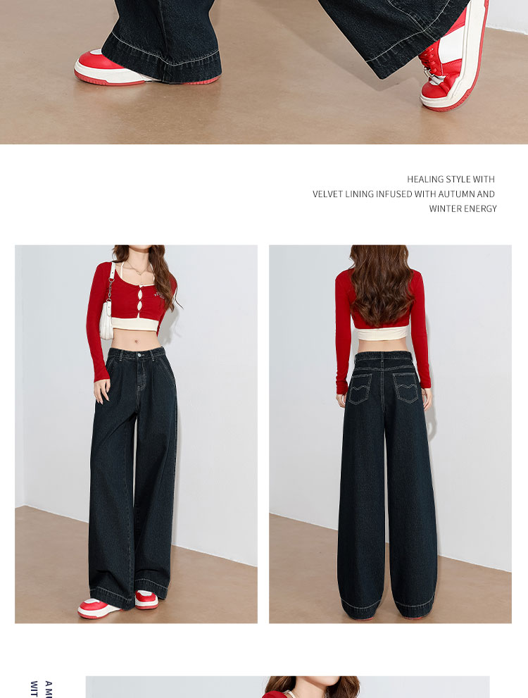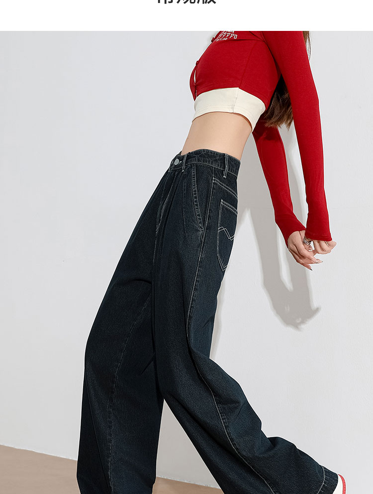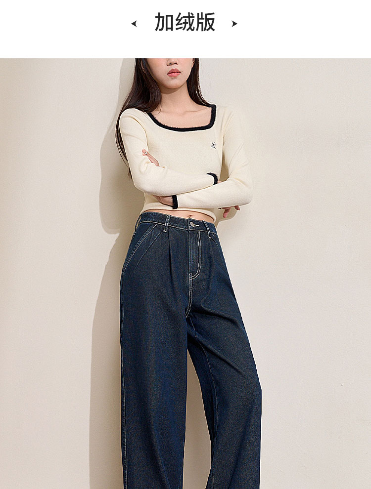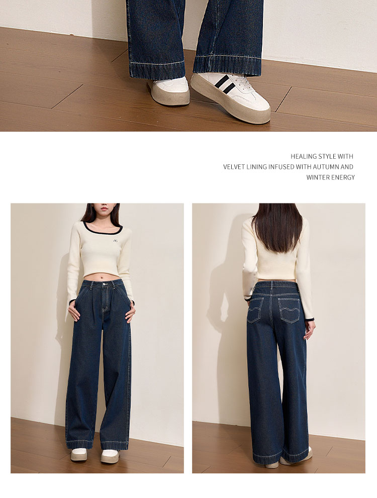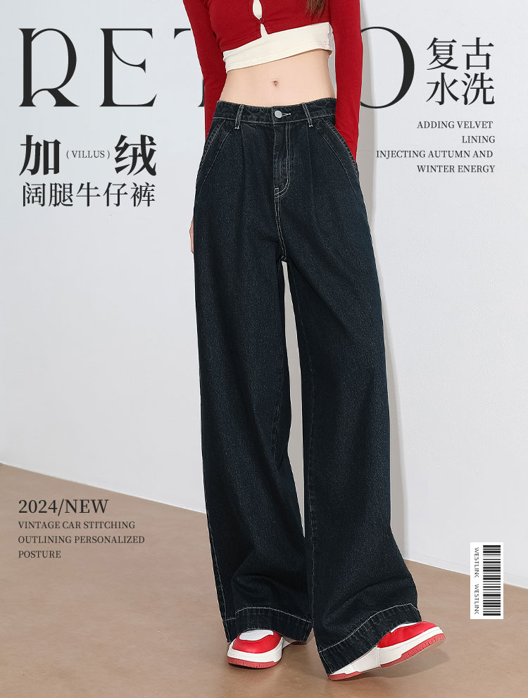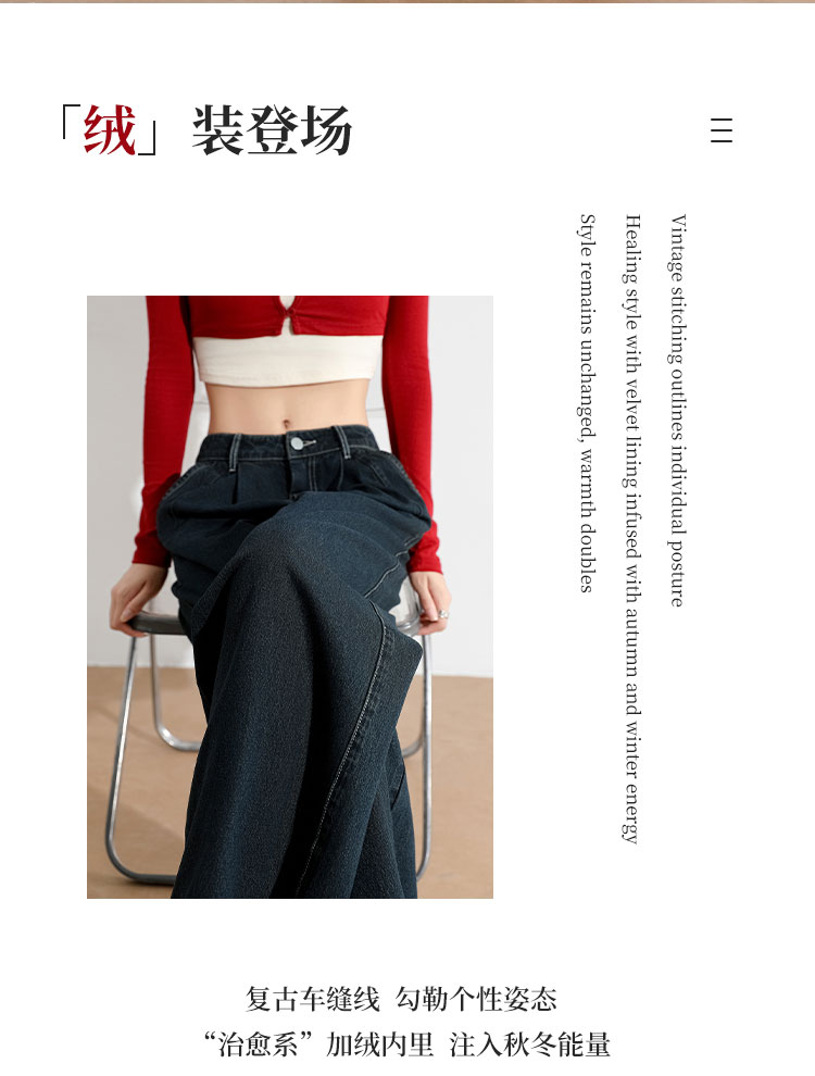 经典复古车缝线设计感水洗牛仔裤女秋季高腰显瘦加绒阔腿裤V0043667