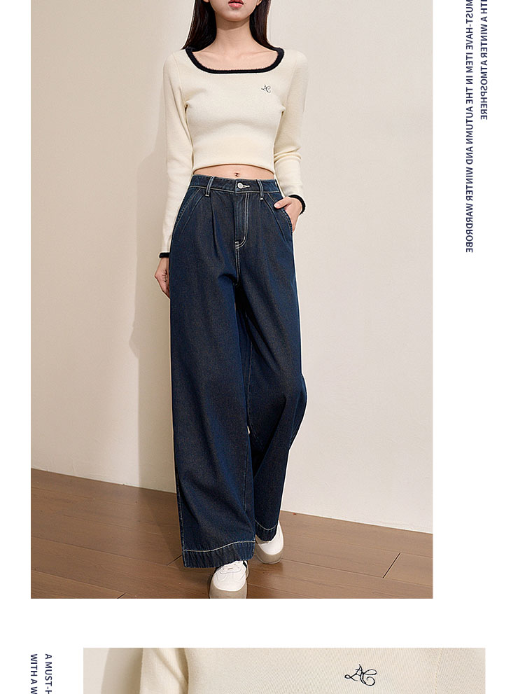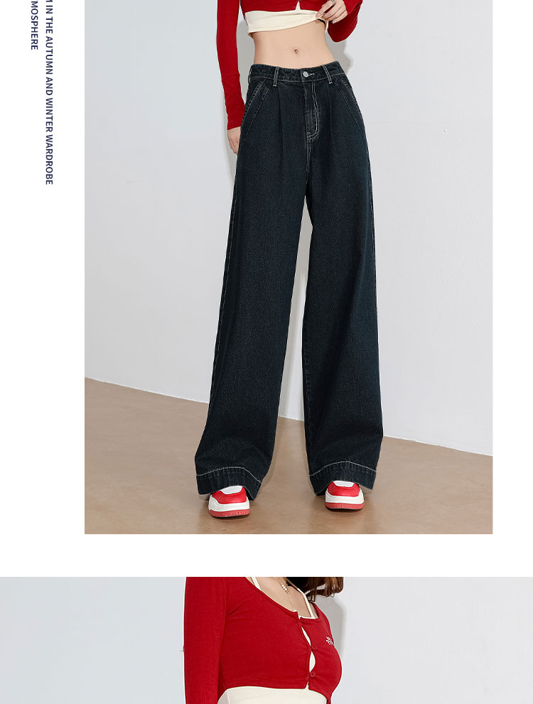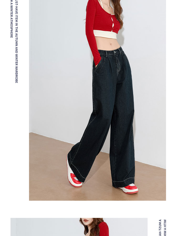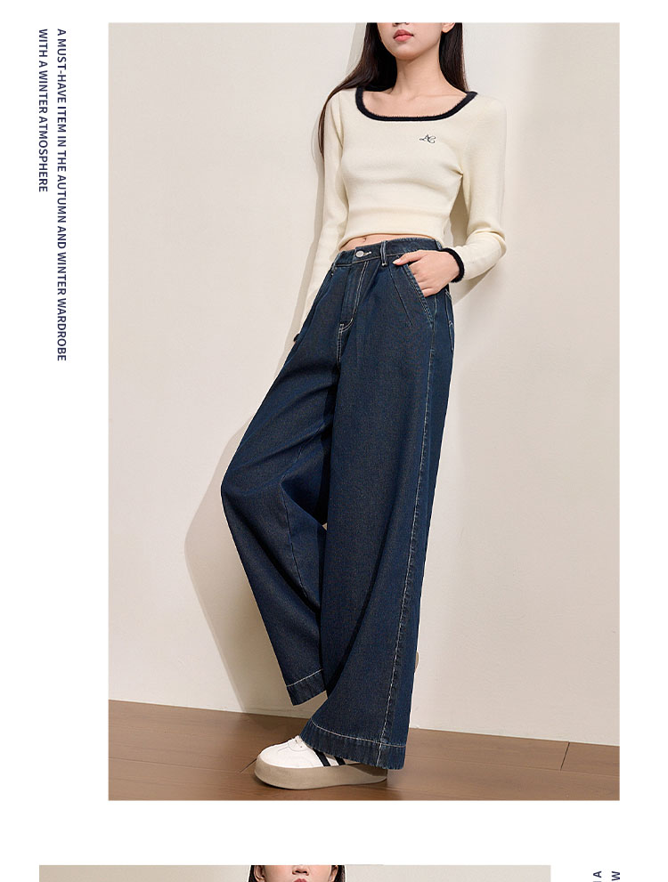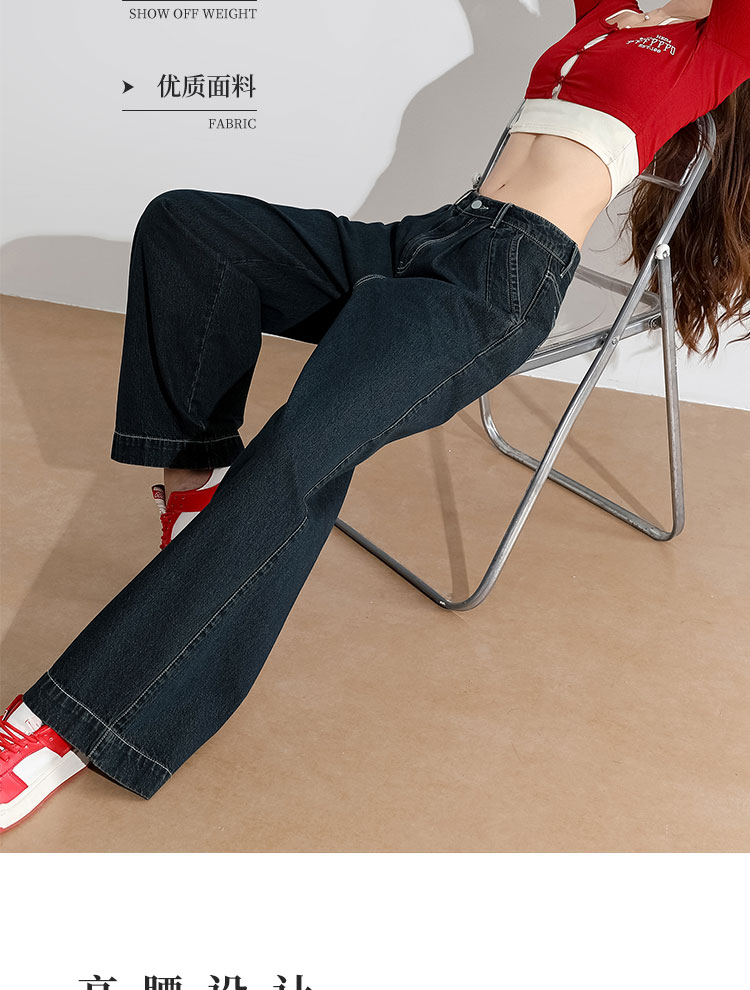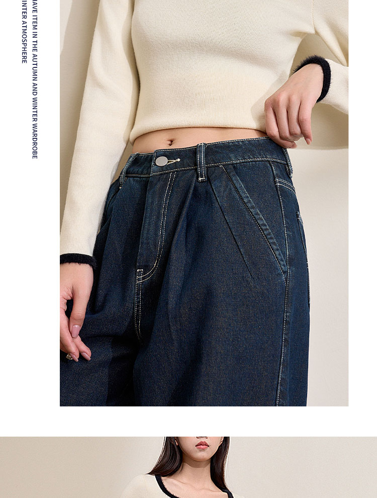 经典复古车缝线设计感水洗牛仔裤女秋季高腰显瘦加绒阔腿裤V0043667