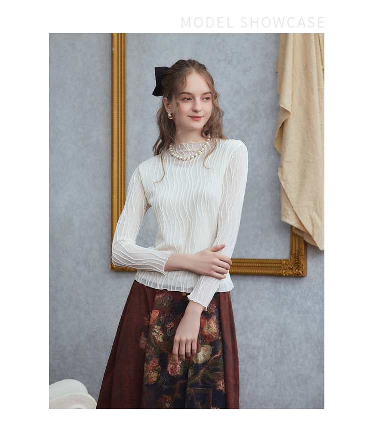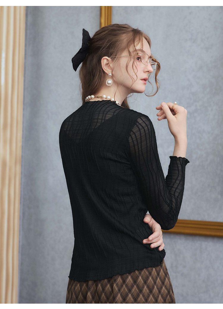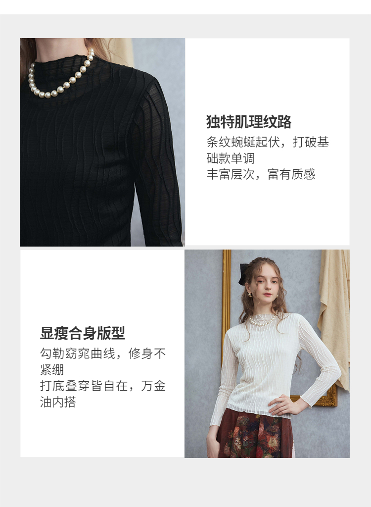 两三事梵高文艺氤氲晨昏2025秋新款立体波浪纹透视打底长袖t恤女
