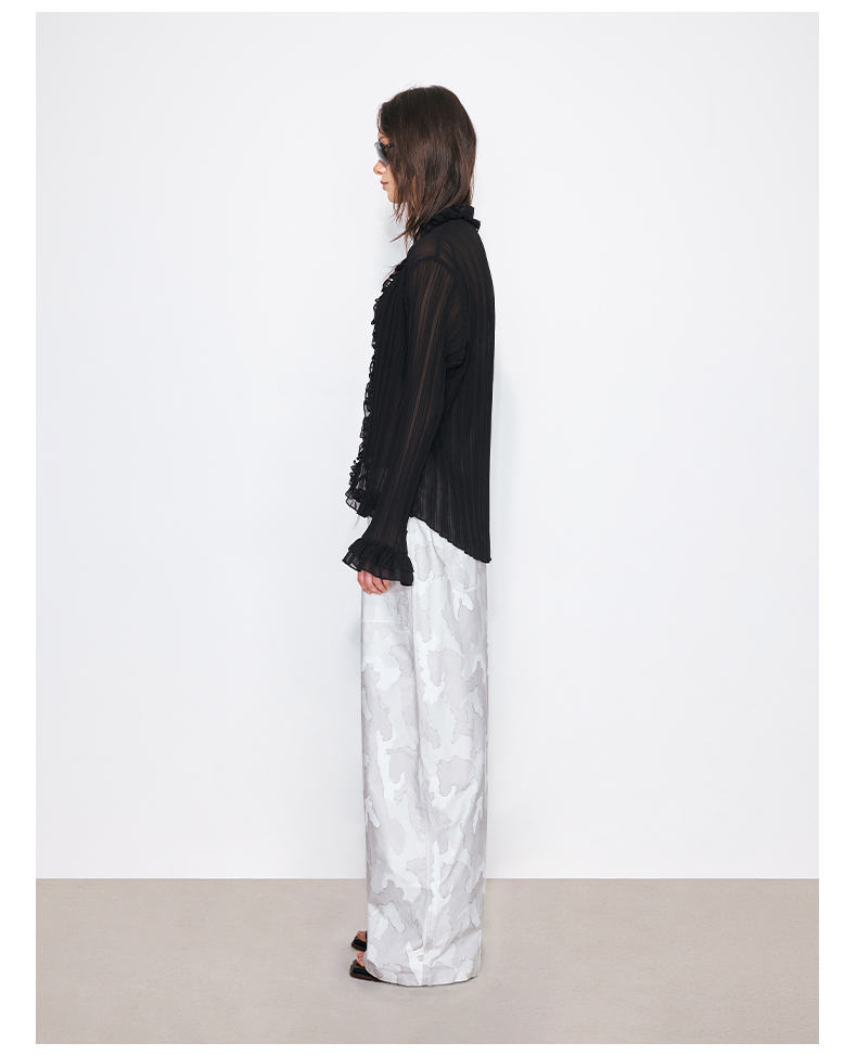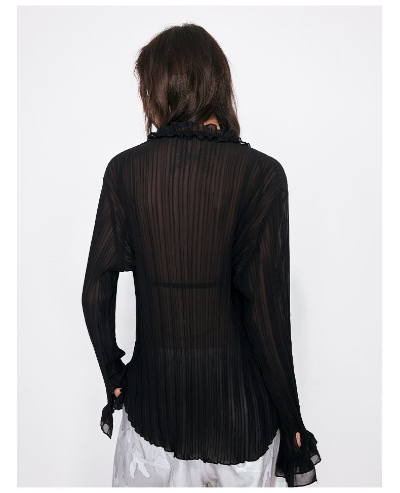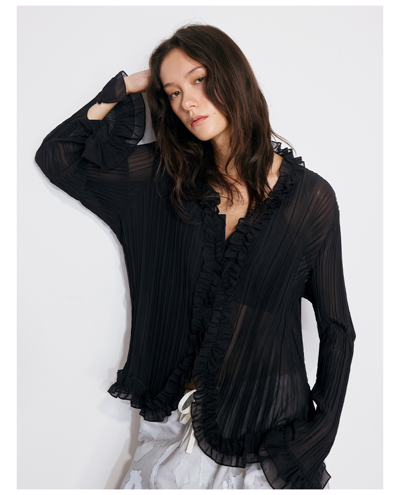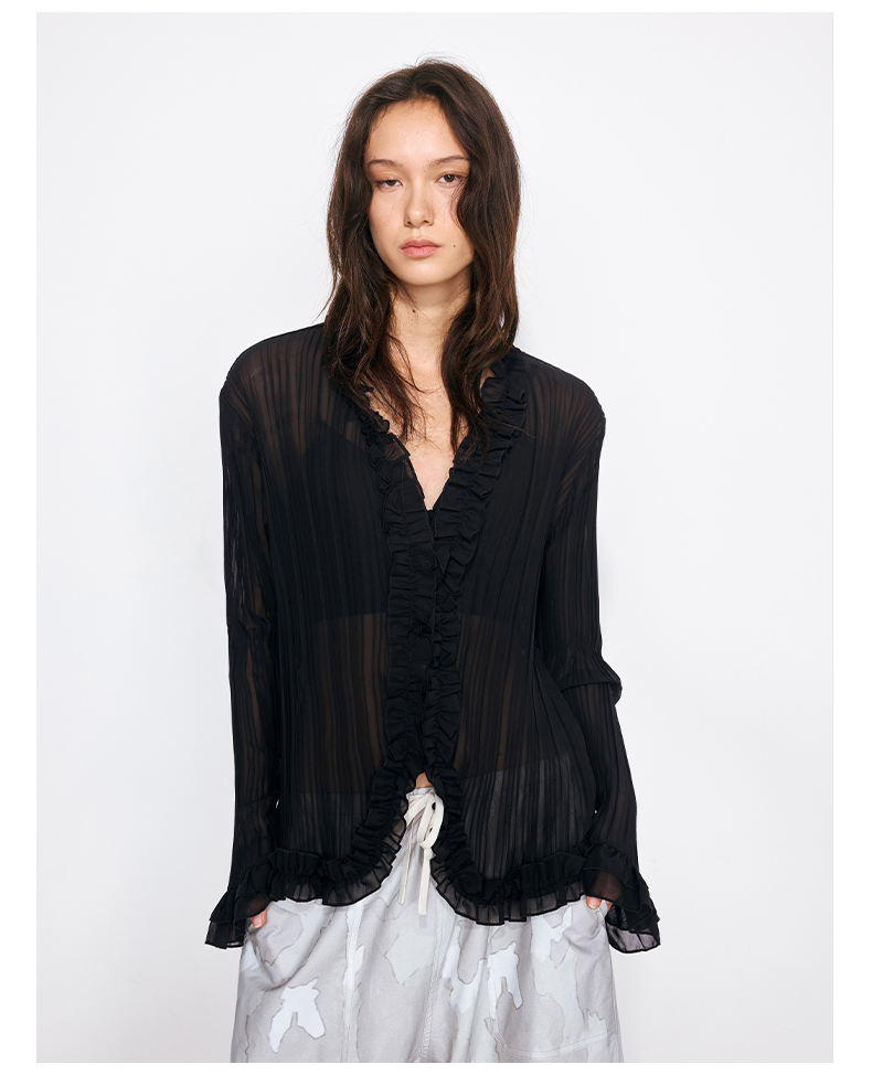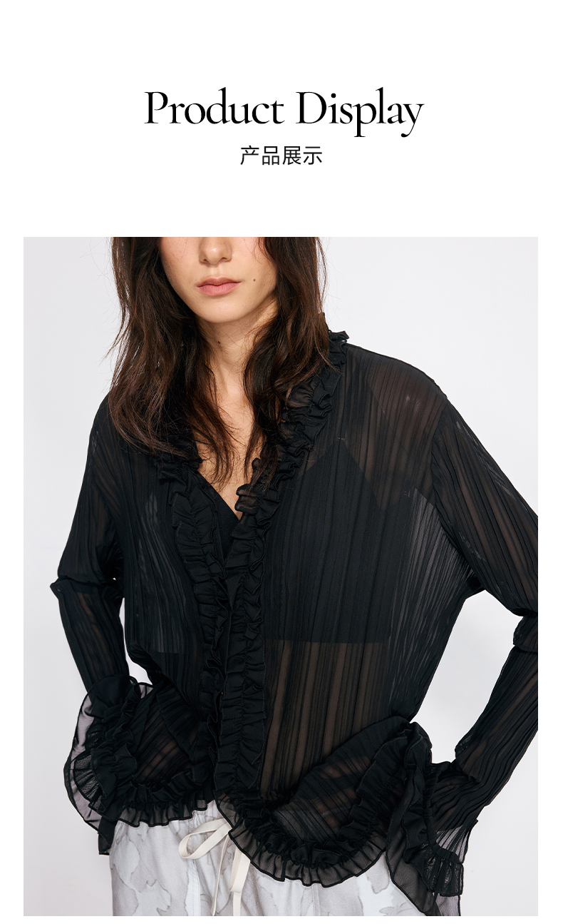 NUTH黑色v领花边装饰半透衬衫女(发货/预售时间同步天猫)