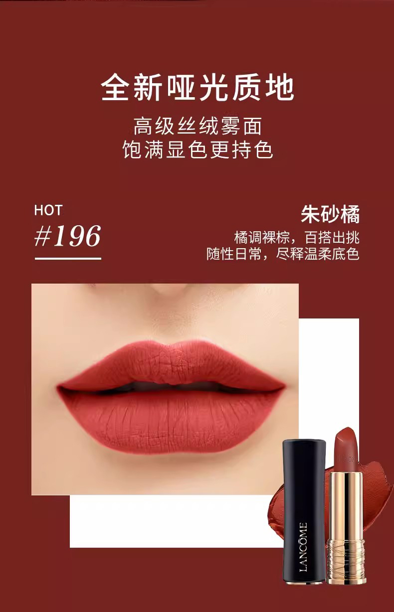 【海淘直发】兰蔻菁纯丝绒雾面哑光唇膏196 朱砂橘 3.4g【2028/4/1】