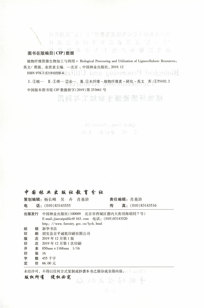 植物纤维资源生物加工与利用(英文版)0358 勇强 余世袁主编 0358 普通高等教育十三五规划教材 高等院校林产化工专*系列教材