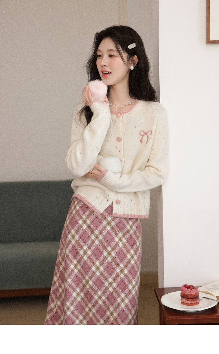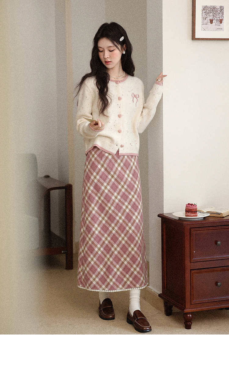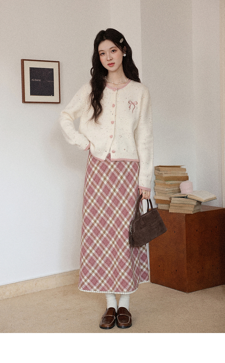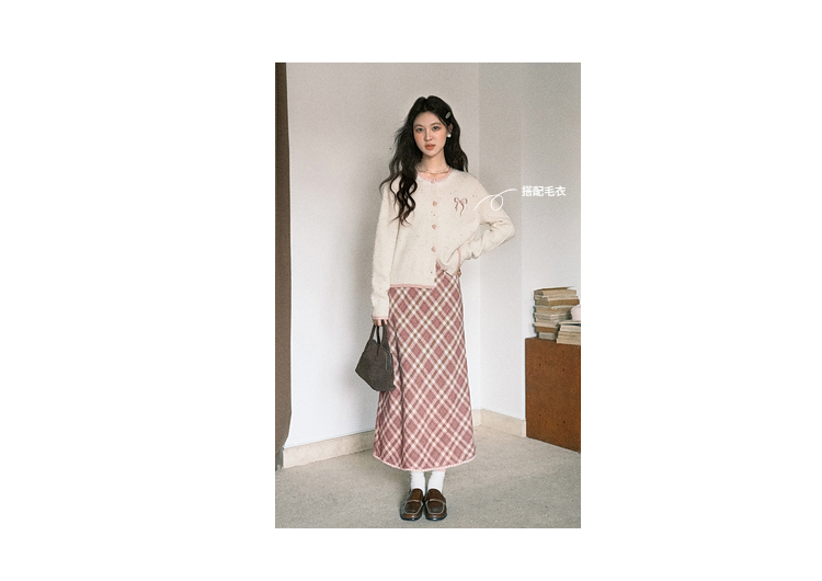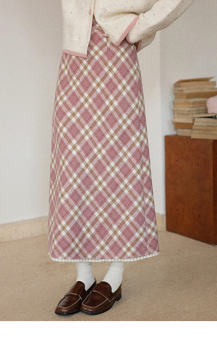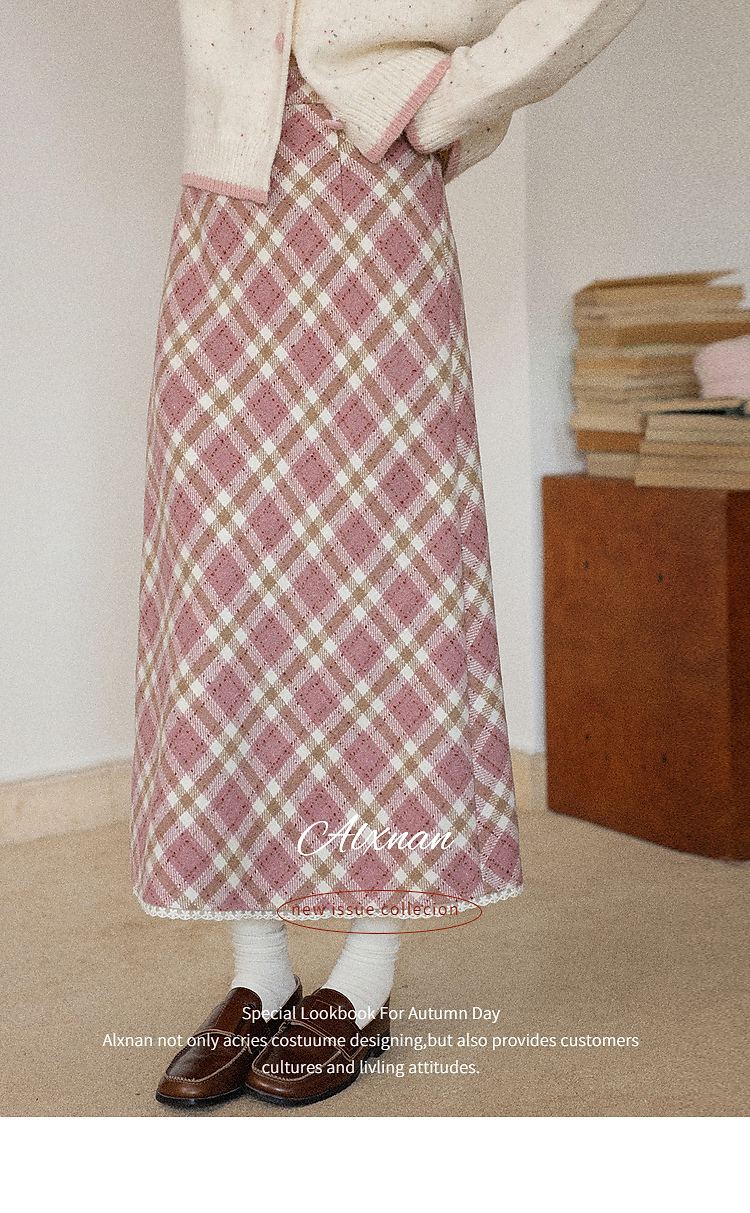 鹿向南「樱雾絮语」甜美粉色格纹半身裙女秋冬新款直筒A字中长裙