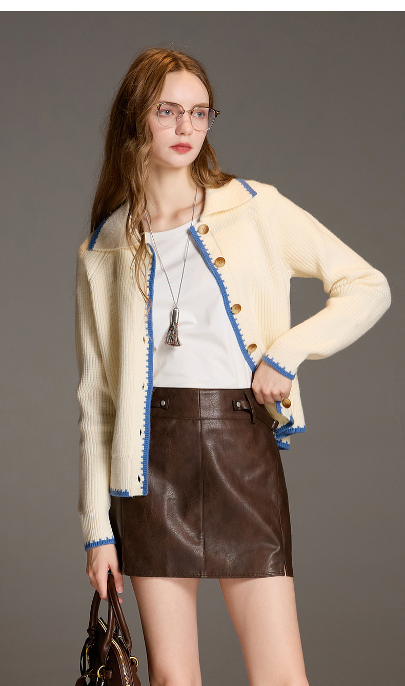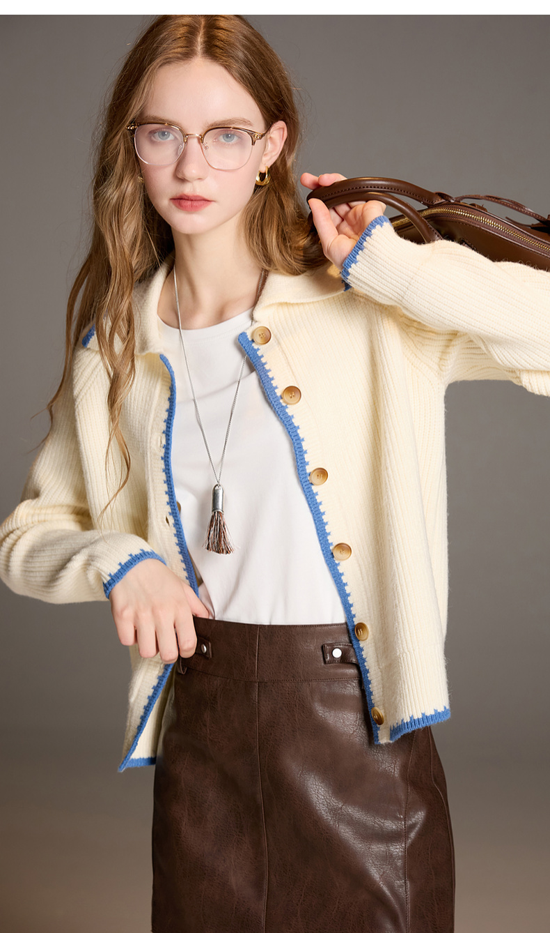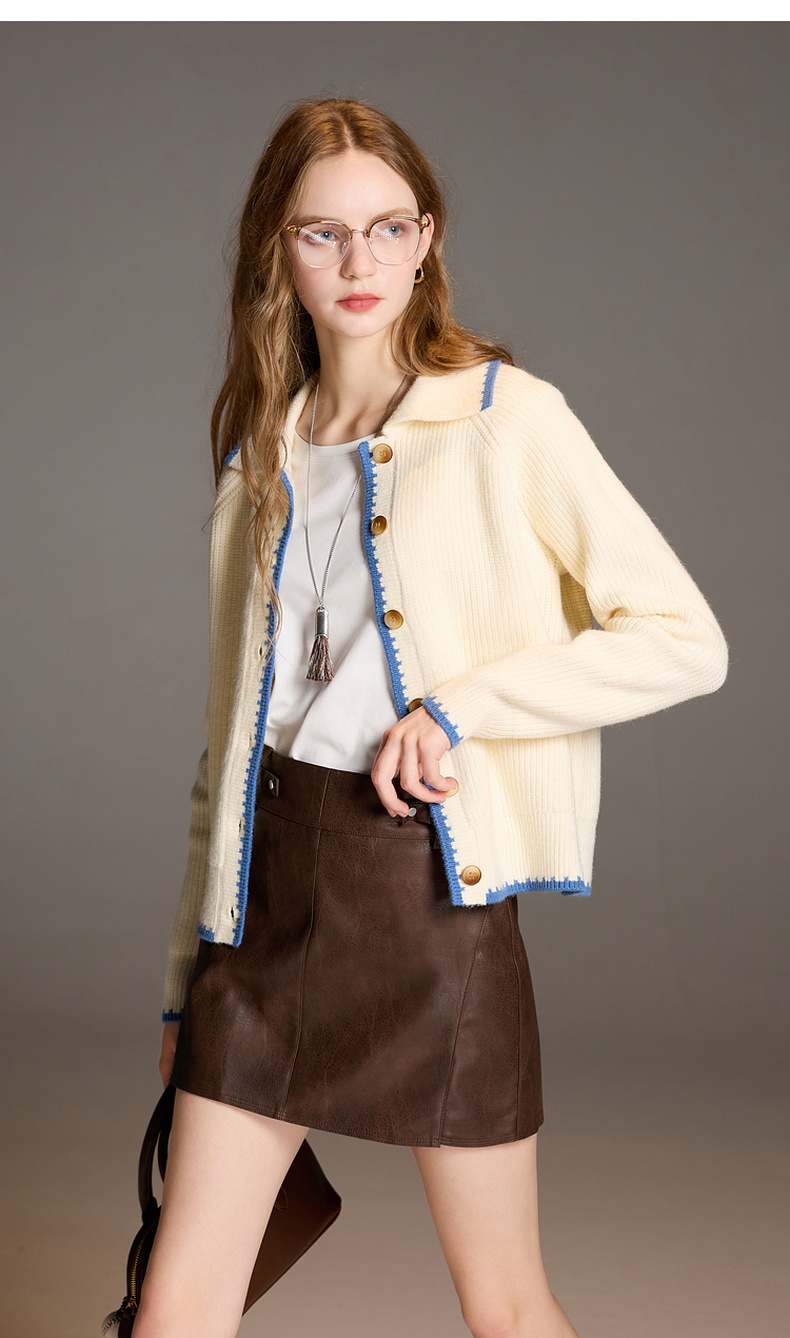 三彩2025冬季新款翻领针织衫长袖单排扣上衣开衫休闲简约M