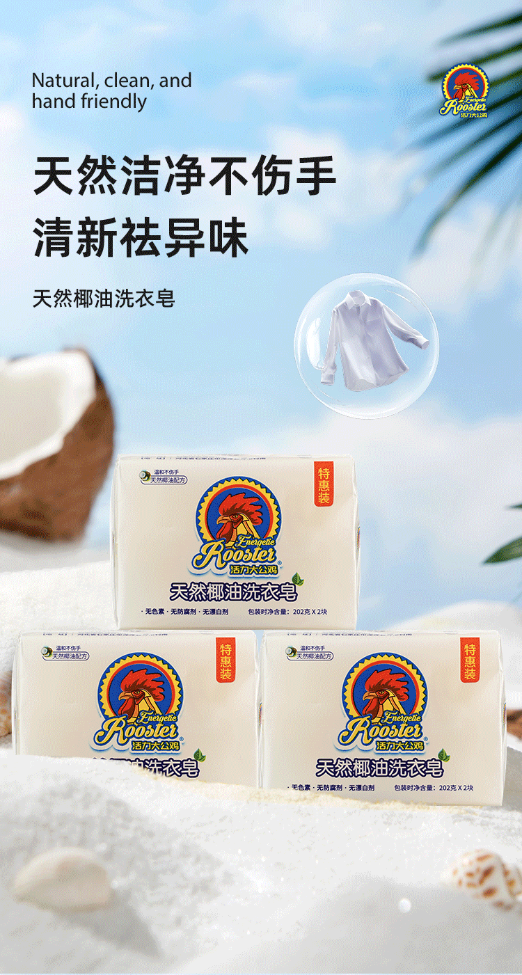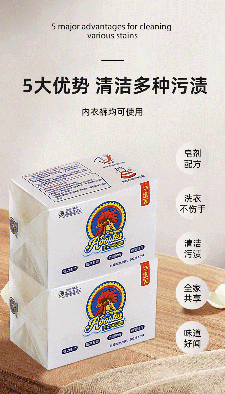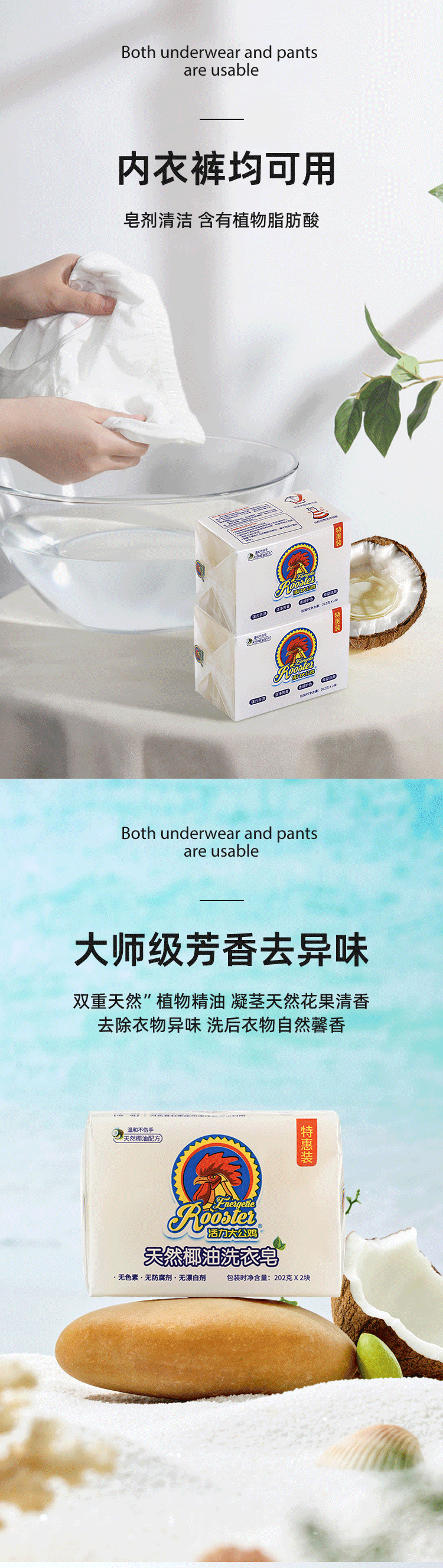 【活力】大公鸡天然椰油洗衣皂202g*2块*5组 不伤手去污香皂