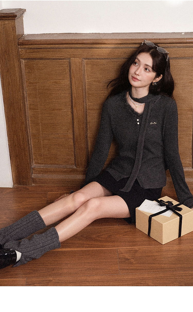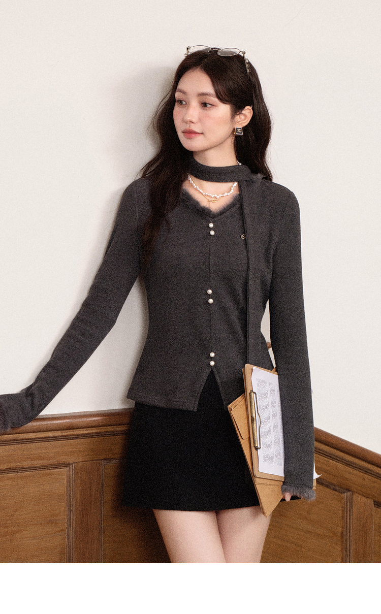 鹿向南「柔光杉屿」高级感气质灰色长袖T恤女冬季新款显瘦V领上衣