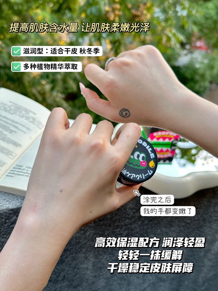 不惧干燥,轻松过冬天 内含鳄鱼油提取物的成分 搭配多种草本植物精致而成 精研的配比为肌肤提供相似的油脂润泽 滋润一整天,哪里干燥抹哪里